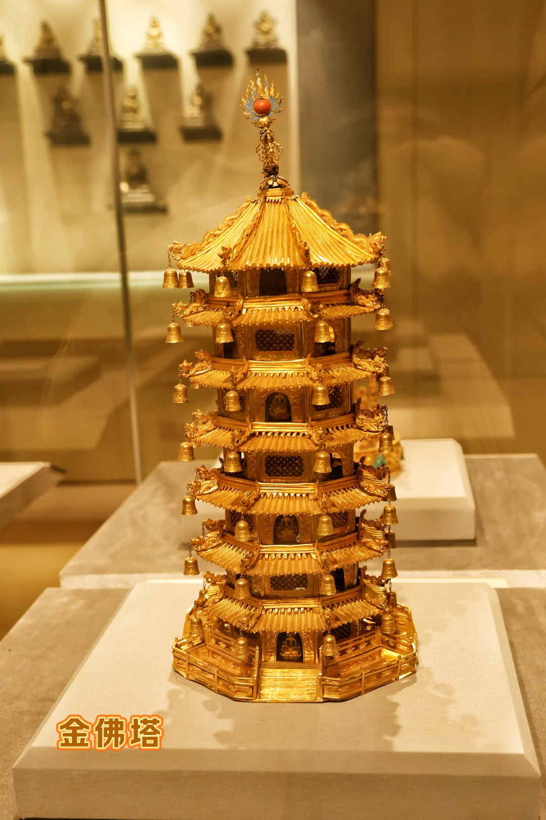 【金佛塔】七层八角鎏金佛塔,飞檐翘角挂着铜铃,每层都有佛像,在灯光下金光熠熠。