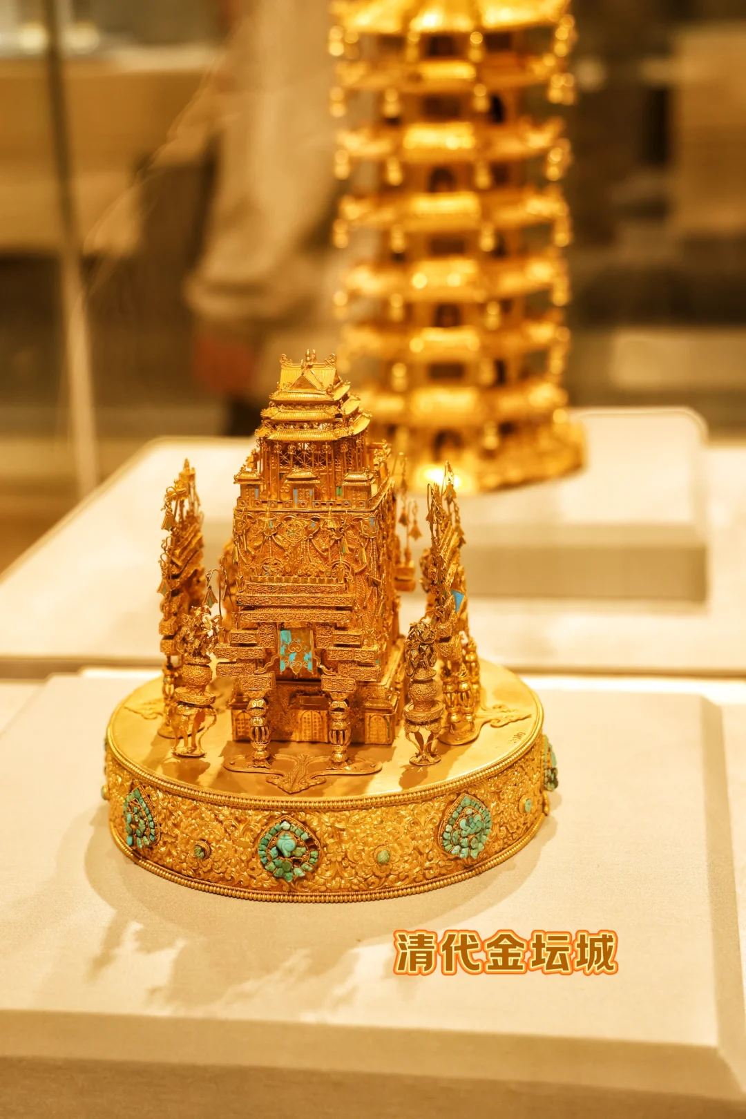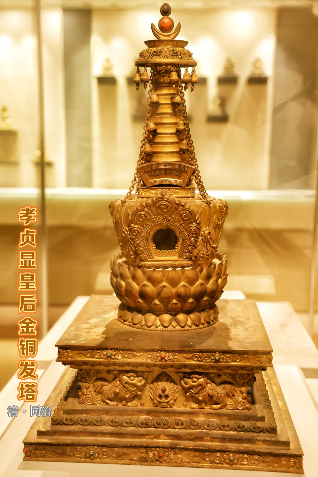 【孝贞显皇后金铜发塔】同治朝为慈安太后打造的发塔,莲座、覆钵、相轮层层递进,藏式风格浓郁,是清代宫廷佛教艺术的见证。