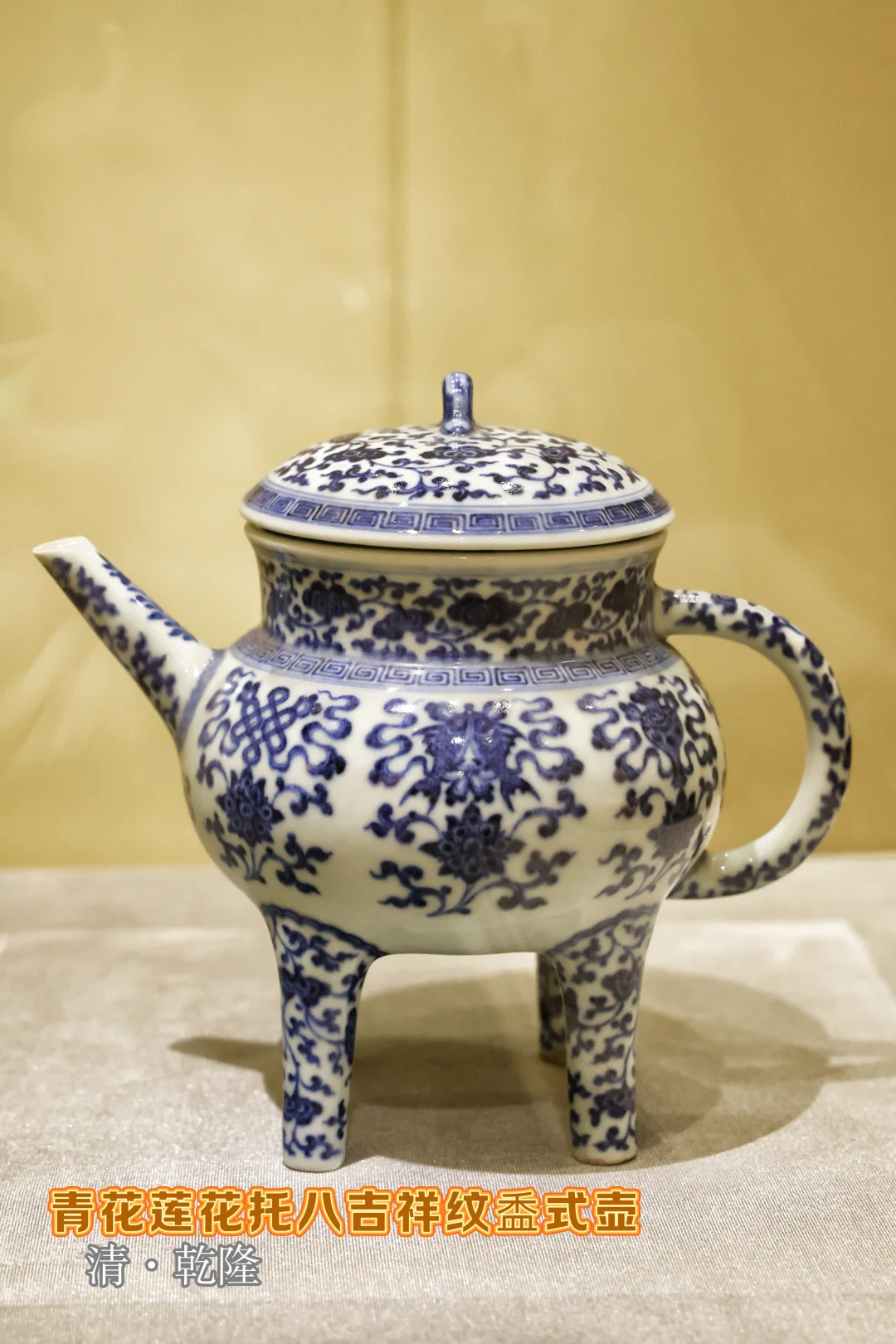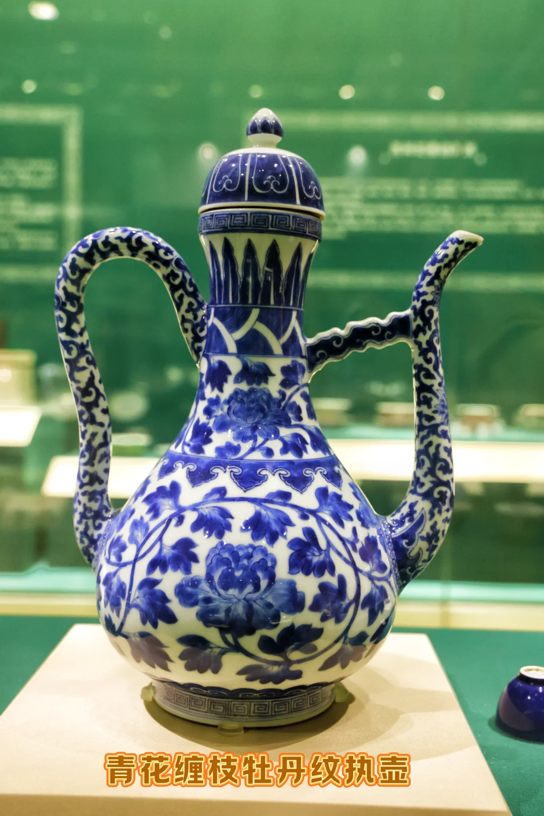 【乾隆青花执壶】从缠枝牡丹到折枝花果,蓝白相映间,壶柄与流口的卷草纹细腻灵动,实用与审美完美融合。