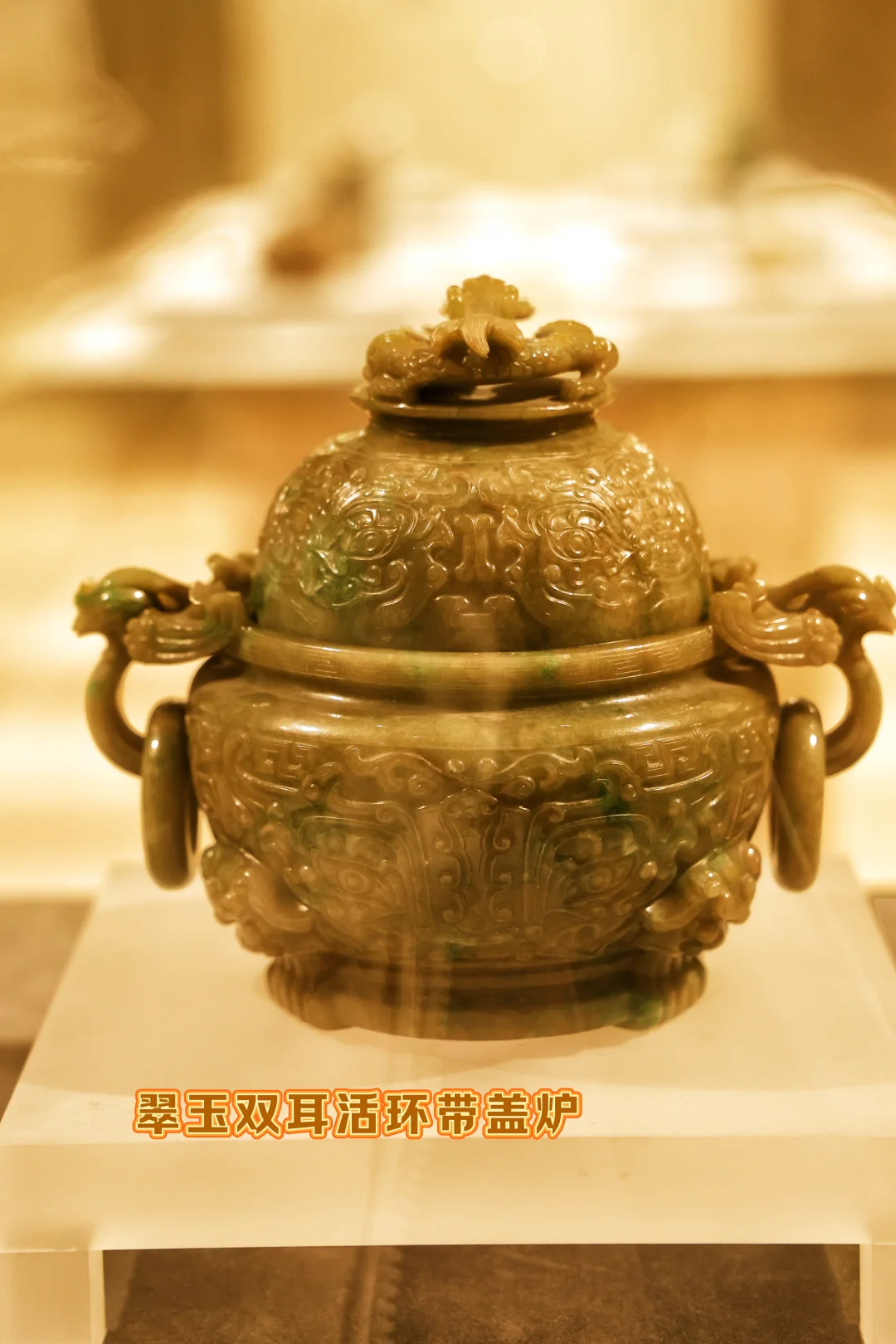 【翠玉双耳活环带盖炉】黄翡带绿的料子,雕满兽面纹与龙纹,凤首活环耳灵动精巧,炉盖盘龙钮威严霸气,是清代玉雕的巅峰之作。