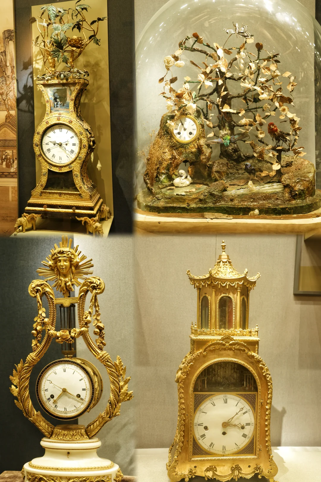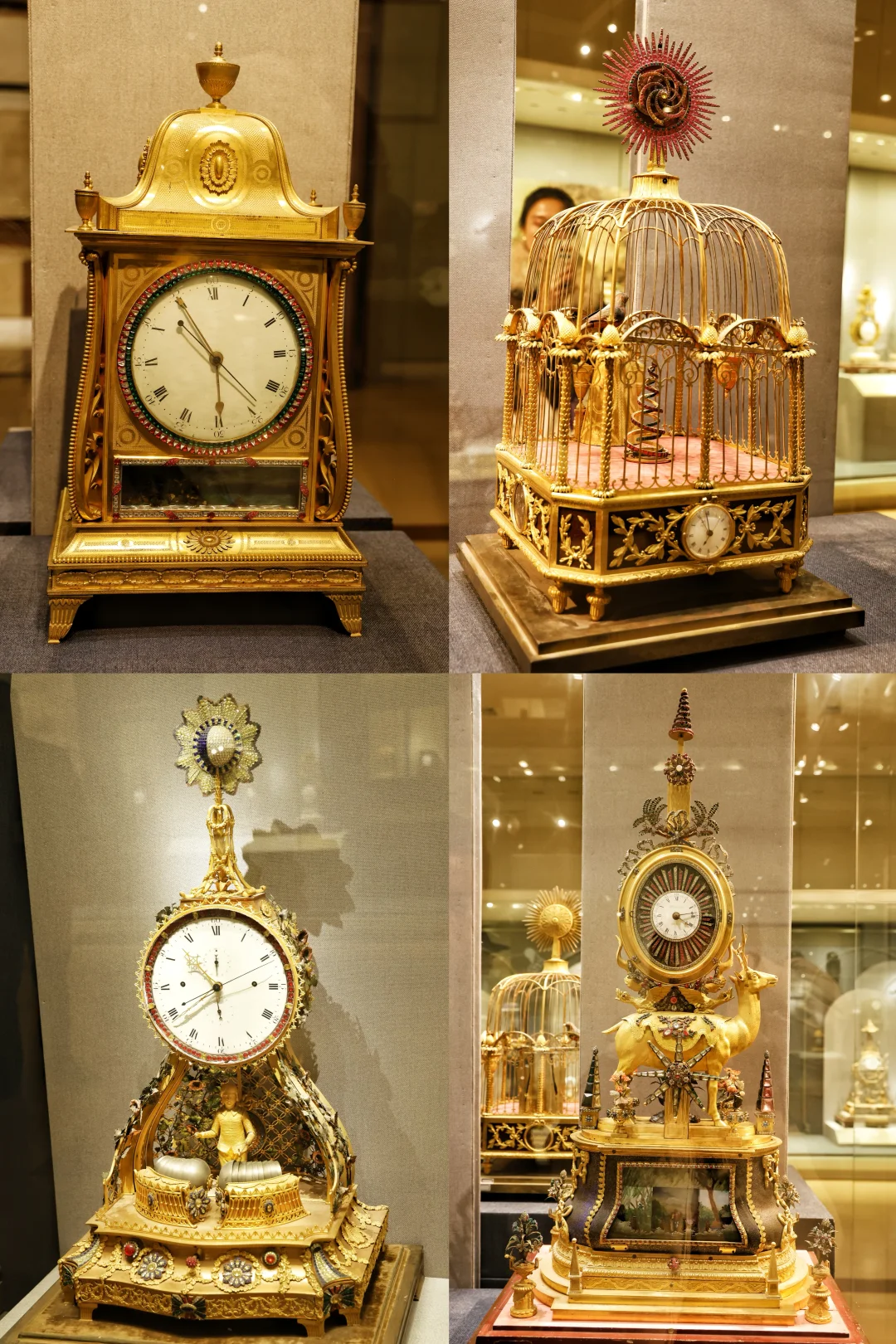 鸟笼钟、人物钟、树景钟… 西洋钟表与中式审美完美融合,报时、动偶、鸟鸣功能一应俱全,每一座都是“时间的艺术品”,看得人眼花缭乱。有一些展品之前在粤博看过的🥰🥰……