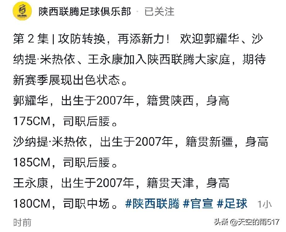 青年新军陕西联腾,再宣又引进三名中场球员,这支年轻的陕西新军队中陕西籍本土球员已