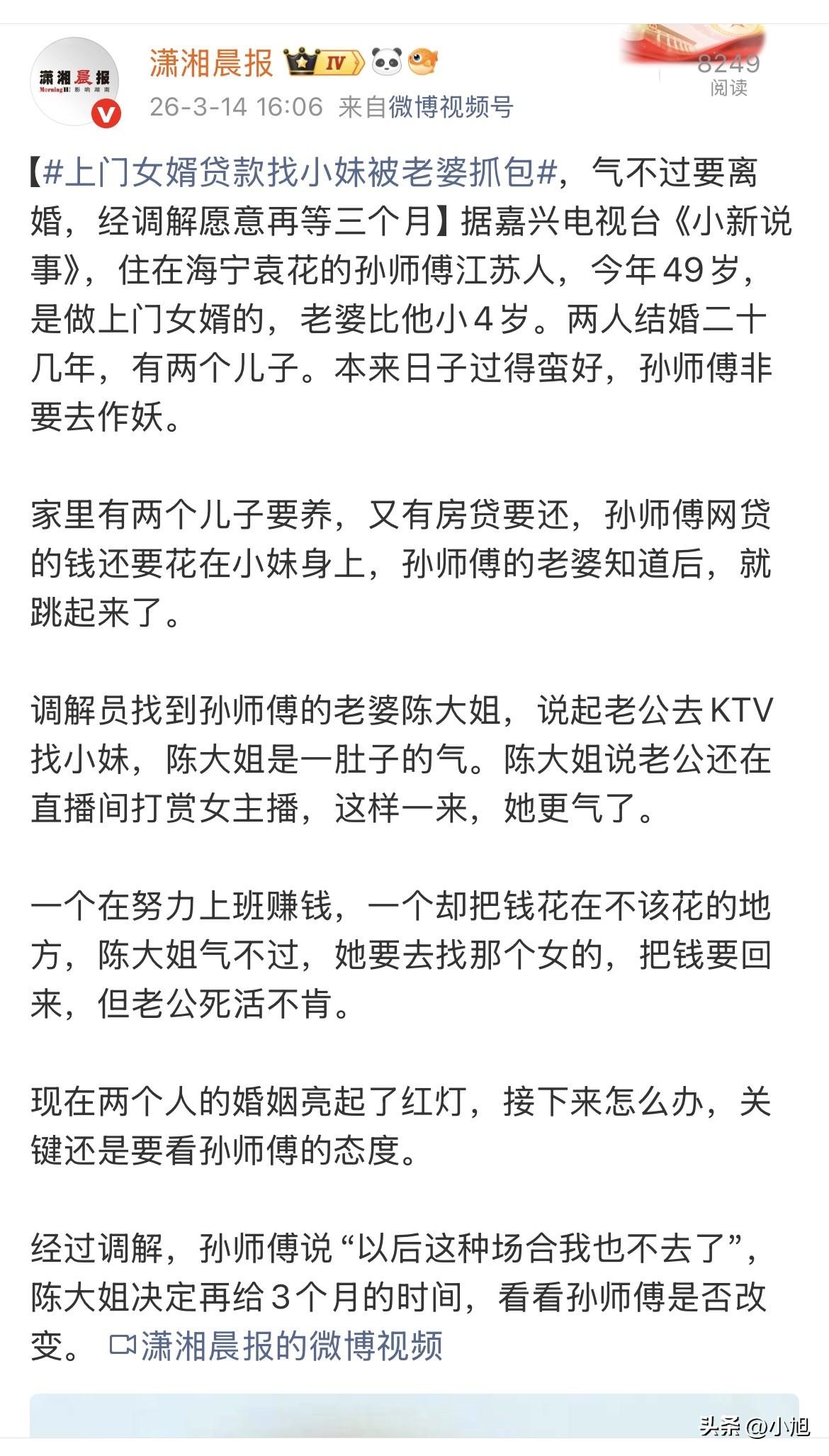 浙江海宁,49岁的上门女婿孙师傅,贷款找KTV小妹的事被老婆抓了个正着。陈大姐翻他手机转账记录的时候,手都在抖——同一个女人,八百、一千,一笔一笔转出去,加起来一两万。除了这个,直播间打赏女主播的钱,他自己都算不清。 孙师傅是做酒水销售的,收入不稳,钱不够就去借网贷。这几年贷了还、还了贷,陈大姐一直不知道。直到最近家里要贷款买房子,她查老公征信,才发现这个窟窿。 她一条条翻转账记录,看到老公给同一个女人八百、一千地转,火一下就上来了。孙师傅承认是KTV的小妹,这几年断断续续花的钱,他自己也说不清,估摸着一两万。除了这个,他还在直播间打赏女主播。 陈大姐最气的不是老公花心,是自己辛苦上班赚钱,老公却在外面充大爷。她说得很直白:天天在还债,给人家还债,你觉得有意思吗。 家里条件其实不差,乡下有别墅排房,城里还有一套房,两个儿子。陈大姐说起这些的时候,语气里全是不甘心——条件这么好,硬生生被老公搞成这样。 她要去找那个女的,把钱要回来。孙师傅死活不肯。 这事往浅了看,是男人管不住自己,往深了看,是一个上门女婿二十几年攒下的那点心理账。 49岁,江苏人,在海宁袁花做了二十多年上门女婿。这身份意味着什么?意味着从结婚那天起,他就住进了老婆家,孩子跟老婆姓,亲戚是老婆那边的亲戚,老家回不去,新家又不全是自己的。 有网友说得很直接:愿意做上门女婿的,底子里都是不想奋斗想躺平的类型。但反过来想,一个男人选择上门,往往是在老家没有更好的出路。他放弃的是传统意义上的“顶门立户”,换来的是一个安身之处。 问题是,这种交换,时间长了容易在心里长刺。 孙师傅做酒水销售,收入不稳,有时候还得靠网贷周转。老婆在厂里上班,稳定,踏实,家里两套房子,说起来都是“她家”的。在这个家里,他是女婿,是老公,是孩子爸,但谁是真正的一家之主?遇上大事,是听他的,还是听老婆娘家人的? 这种身份上的模糊感,一天两天没事,二十年下来,能压得人喘不过气。 他去KTV找小妹,给女主播打赏,表面看是贪玩,往深了想,是在那些地方,他不用当“上门女婿”。在小妹眼里,他只是个掏钱的客人,不需要解释自己是谁、从哪来、在家什么地位。他掏钱,人家笑脸相迎,这种关系简单直接,不用想那些复杂的身份问题。 有网友说得很透彻:如果男的因为经济原因或者一时落魄做了上门女婿,但是本人有上进心奋发图强事业成功了,还会对现状满意吗?说不定就会离婚另起炉灶。反过来,如果一直混不出头,心里那股憋屈往哪放? 孙师傅的选择是,往KTV和直播间放。 调解现场,调解员怼他怼得很直接:那些女人跟家里老婆能一样吗?她就是要掏你口袋里的钱,跟你过日子吗?在你最穷的时候能跟你的是谁?只有妻子,跟你生儿育女,把儿子抚养大,这么苦。 孙师傅只能点头。 但陈大姐已经不信他了。她说孙师傅骗人很厉害,2024年、2025年都还在去,被她抓到过。现在孙师傅嘴上说不去了,谁知道是不是又来一遍。 有意思的是孙师傅的态度。他来找调解员的时候,嘴上说想挽回,可话里话外又透着一股破罐破摔:离就离吧。调解员问他外面还欠多少钱,他说网贷大概还有四万,今年做做把它还掉。 四万块,说多不多,说少不少。但对陈大姐来说,这四万块不是钱的事,是信任彻底碎了。 她给三个月观察期,与其说是给孙师傅机会,不如说是给自己一个交代。二十几年婚姻,两个儿子,两套房子,说离哪有那么容易。可要说不离,这口气又咽不下去。 有人可能会问,孙师傅到底图什么?家里条件不差,老婆能赚钱,孩子也大了,好好过日子不行吗? 这个问题,可能孙师傅自己也答不上来。二十几年上门女婿当下来,他早就习惯了在家里的那个位置——不是核心,但也算一员;不是主人,但也算家人。这种不上不下的感觉,时间长了,人会麻木,也会找别的出口。 KTV小妹会叫他老板,直播间主播会念他的ID说谢谢大哥。那些地方,没有人在乎他是不是上门女婿。 但这钱,是他网贷借来的。 调解到最后,陈大姐只肯给三个月。孙师傅站在旁边,没说行,也没说不行。调解员让他表态,他说以后那种场合不去了。 三个月后,这段婚姻还在不在,谁也不知道。 但有件事是肯定的——上门女婿这个身份,孙师傅背了二十多年,已经长进肉里了。他去KTV找小妹,不只是管不住自己,更是一个男人在长期身份压抑之后,找了一个不需要解释自己的地方。 那些转账记录,每一笔都是一声叹气。 你觉得陈大姐该不该再给这次机会?一个当了二十多年上门女婿的男人,他心里那笔账,到底怎么算才清? 来源:潇湘晨报