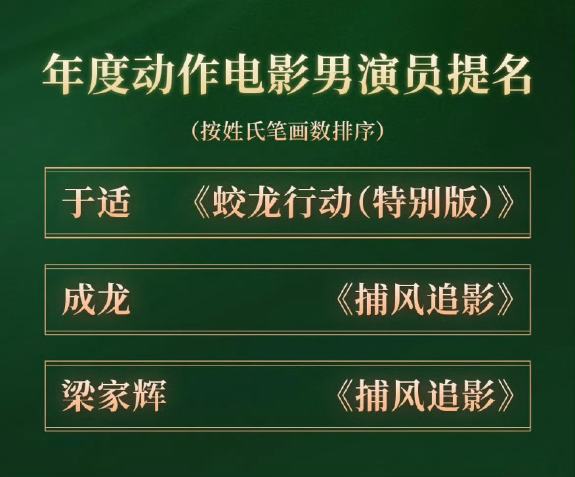 于适年度动作电影男演员提名于适凭借主演的电影《蛟龙行动》提名首届CMG中国电影盛