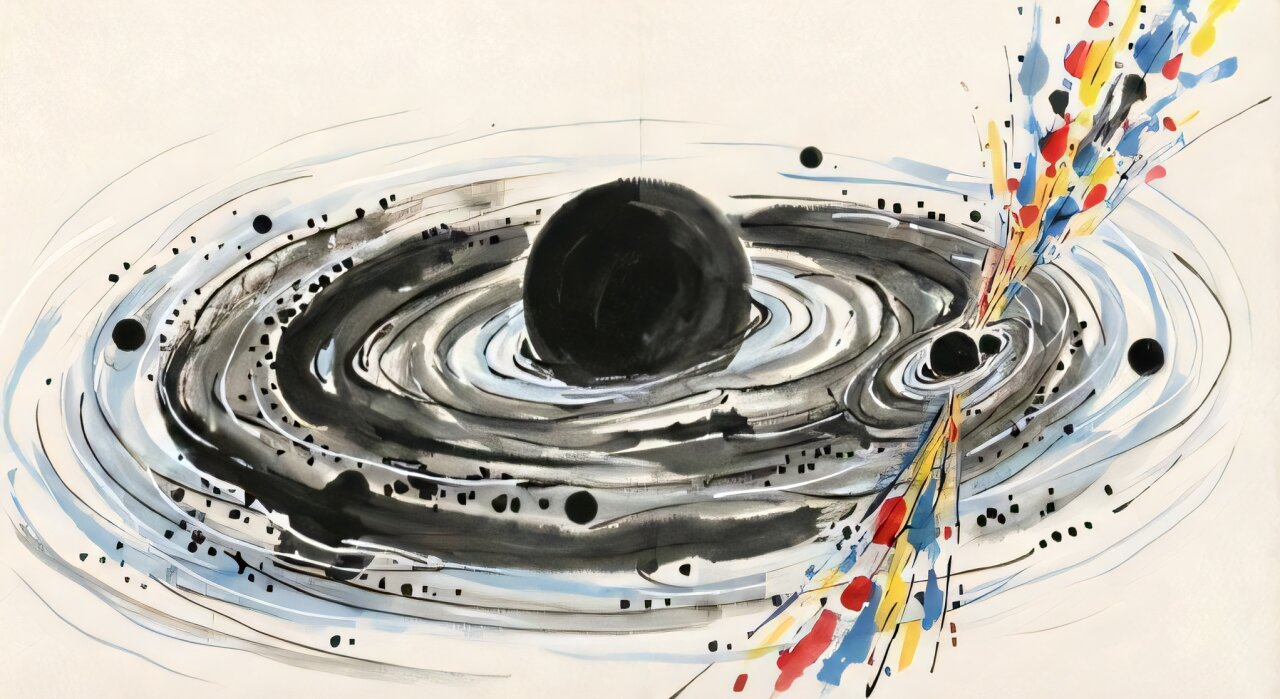 图:两个黑洞在吸积盘中并合并释放出喷流的艺术画,图源:Shu-Rui Zhang