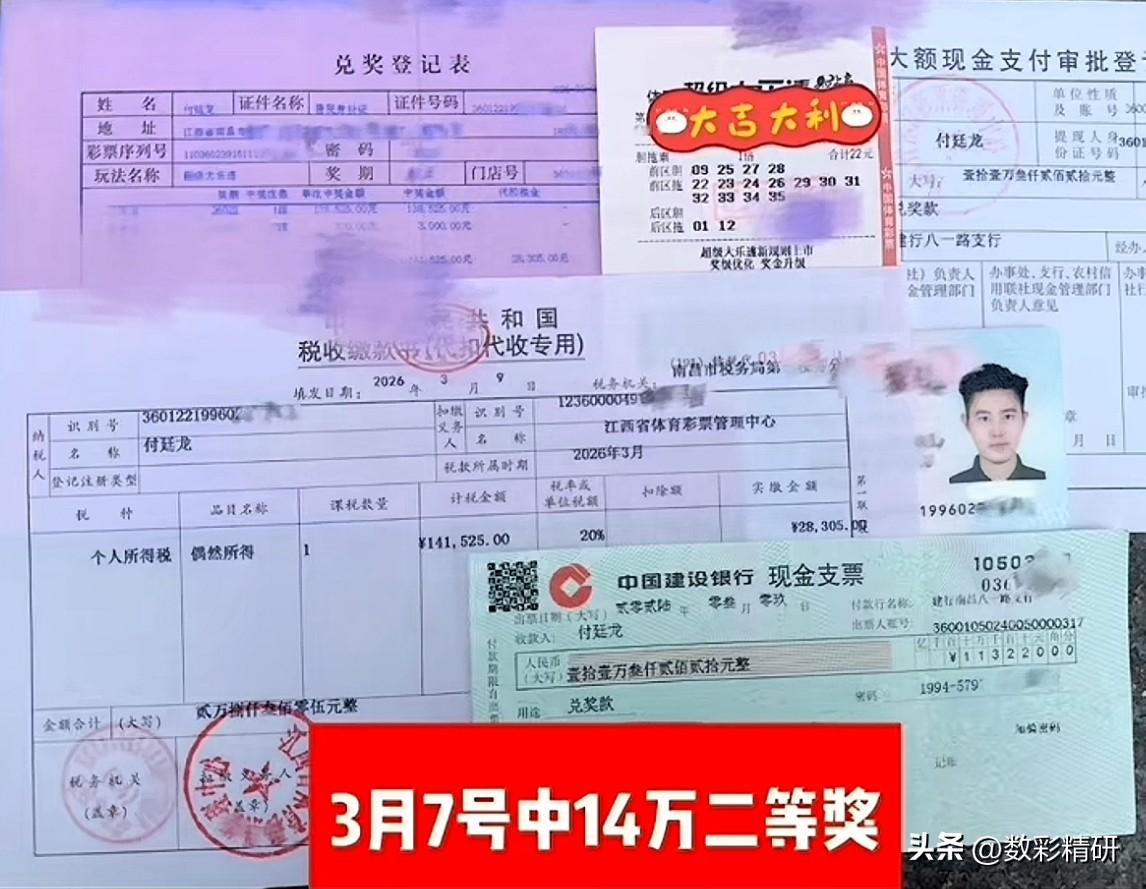 中奖者“付伯恩”,本名付延龙,近日又添好运!先是于3月7日中得14万余元,税后实收11.32万元;紧接着在3月11日再获5.8万元奖金,完税后到手4.6万余元。 这已是其第十次与第十一次赴中心兑奖,莫非真有“天选之子”降临现实?不妨一览他近年惊人的中奖轨迹: 1. 大乐透23079期一等奖:1009.6万元 2. 大乐透24014期二等奖:23.4万元 3. 大乐透24134期二等奖:7.6万元 4. 大乐透25095期二等奖:13.6万元 5. 双色球25041期二等奖:53.1万元 6. 双色球25054期二等奖:16.3万元 7. 双色球26002期二等奖:45.5万元 8. 排列五25309期一等奖:10万元 9. 大乐透喜中1.2万元 10. 大乐透26023期二等奖:14.1万元 11. 体彩大乐透喜中5.8万元 累计中奖金额已突破1200万元——如此鸿运,当真令人惊叹!