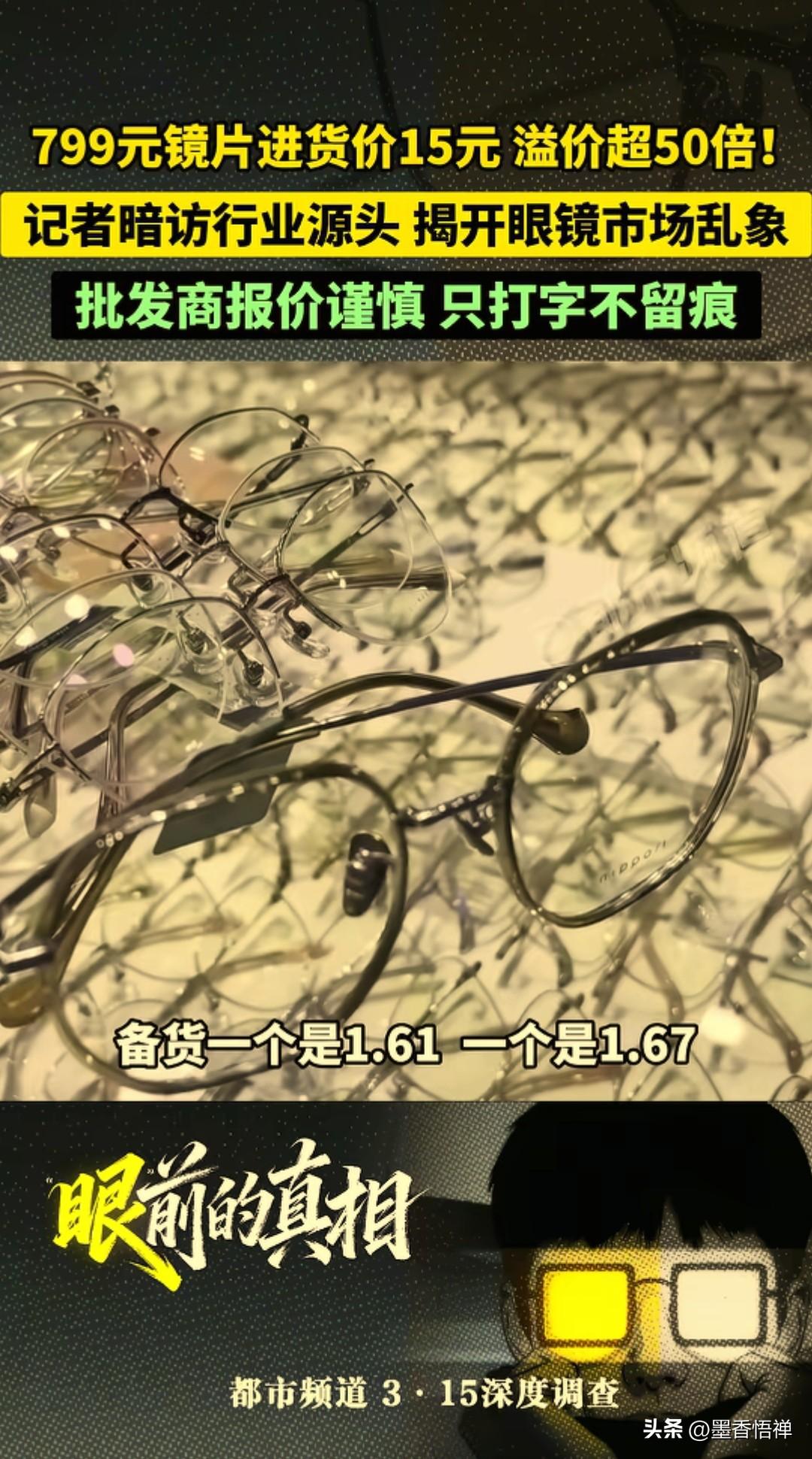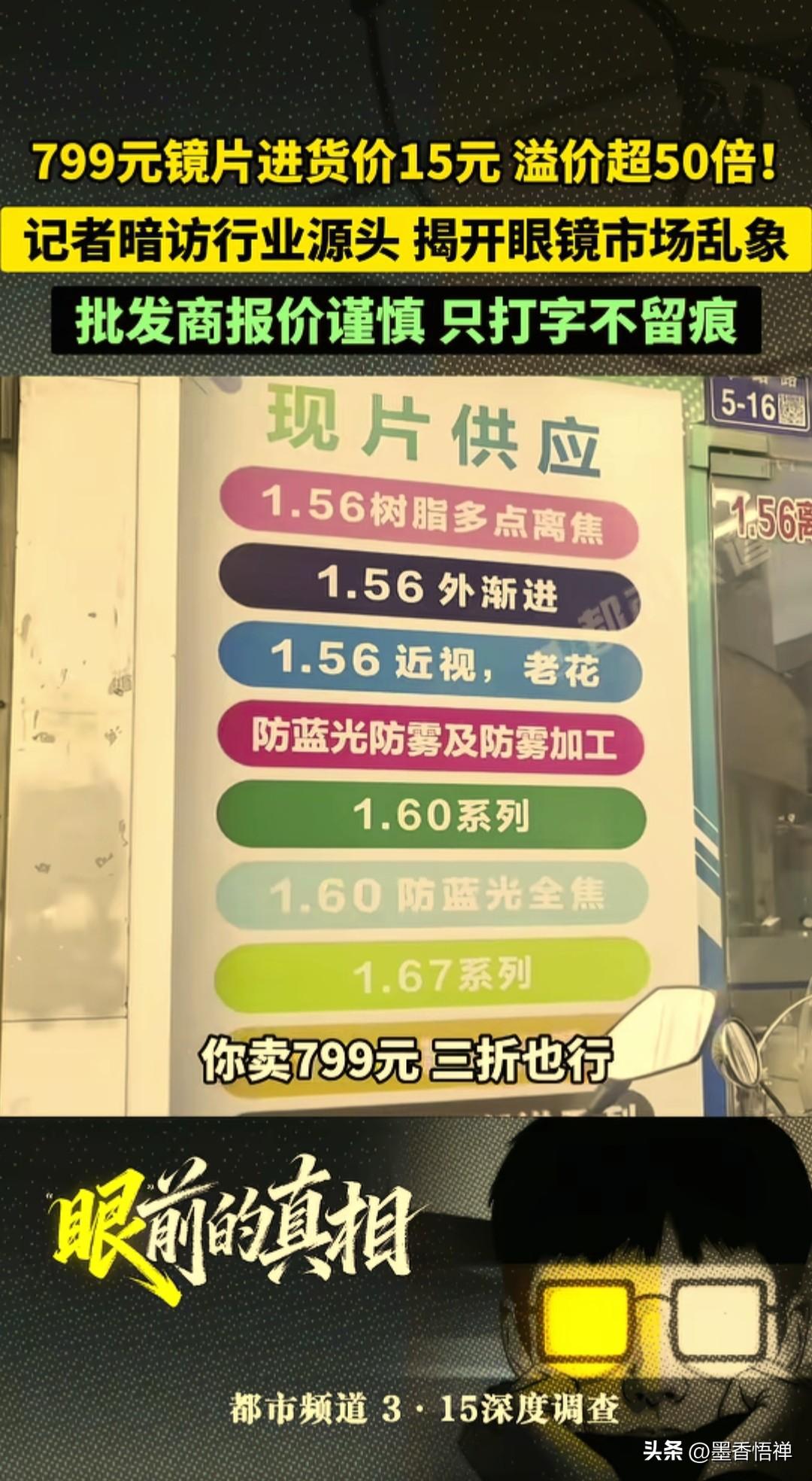 799元镜片进货价仅15元!溢价超50倍,记者暗访揭开眼镜市场暴利乱象 都市频道3·15深度调查曝光:眼镜行业的暴利远超想象。 以前还花了1000多配了副“防蓝光高端镜片”,刷到3·15这个暗访视频惊呆了。 手里这副号称“进口材质、专业护眼”的镜片,在江苏丹阳的批发价,居然只有15块钱。 799减15,整整53倍的差价,到底差在了哪里? 不是差在镜片本身,而是差在门店里亮堂的装修、验光师专业的话术,墙上挂着的“品牌授权”和“护眼科普”,还有我们“贵=好”的消费执念。 批发商说得很直白:“卖799,打三折都还赚”,1.61、1.67折射率的镜片,进货价都差不多,换个包装、贴个标签,就能翻几十倍卖给你。 我突然想起配眼镜时,店员劝我“加200升级防蓝光,对眼睛好”,现在才明白,那200块,买的根本不是护眼,是商家的利润。 更讽刺的是,批发商连报价都只敢打字,生怕留下证据,他们比谁都清楚,这门生意,靠的就是信息差。 以后再配眼镜,我不会再盯着“799”“1299”的价签发呆了: 先问清楚:镜片折射率、品牌、进货渠道,别被“防蓝光、全焦、多点离焦”这些名词忽悠,能去批发市场就别在商场店,能选基础款就别碰“升级款”。 不少网友吐槽:“以前总觉得贵的镜片更好,现在才知道自己交了智商税,配眼镜再也不敢随便砍价了,原来成本这么低”。 我们不是舍不得花钱,只是不想再为“智商税”和“信息差”买单。 毕竟,看清了暴利的真相,才知道什么是真正值得的消费。 镜片避坑 镜片进货价