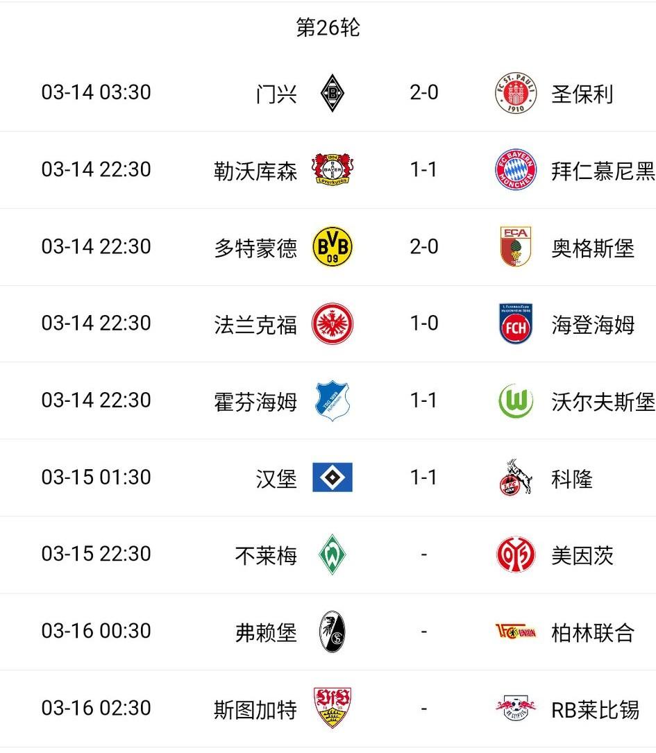 拜仁一骑绝尘,冠军基本锁定;多特稳居次席;3-6名陷入混战。保级战白热化,门兴上岸,圣保利压力剧增。 门兴2-0击败圣保利,打赢这场6分保级战,拉开降级区已有4分。 汉堡1-1逼平科隆,大家双双收获宝贵1分,保级对手成朋友。 勒沃库森双线作战,居然能逼平强大的拜仁,先赛一场距离前五仅2分。