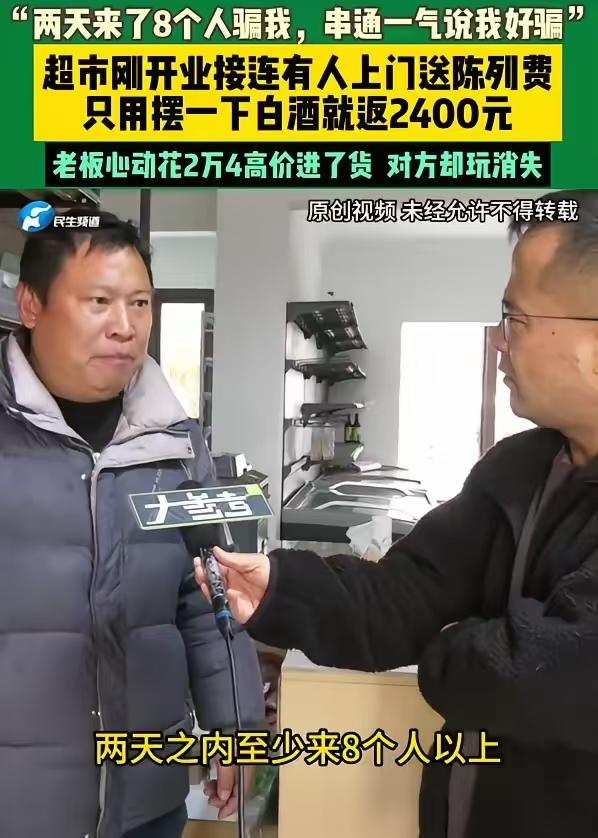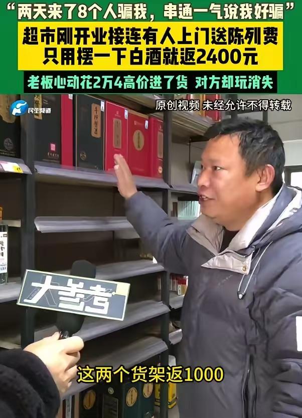 天下没有免费的午餐!河南郑州,男子辛辛苦苦开了一家超市,突然几名陌生人走进来说愿意只付每个月2400元的陈列费,把白酒摆上去,男子当场就心动了,前提是要先进货,男子咬牙花24000元进货后,承诺给钱的人却不见了,电话被拉黑,男子一下意识到,自己好像被骗了。 现在看到这些酒就想当场摔掉, 这些酒包装精美,但酒精度数标注模糊,连生产厂家的详细地址和资质证明都没有。说白了就是三无产品。 正常的程序应该是那些人交两千四把一定数量货摆上,月末有卖出从两千四扣除,交钱补货吧。 超市不都是免费铺货或者月结吗?哪有先付款的?陈列还要自己买酒,显然不合理[捂脸]。被贪心蒙蔽心智,被绕进去了!