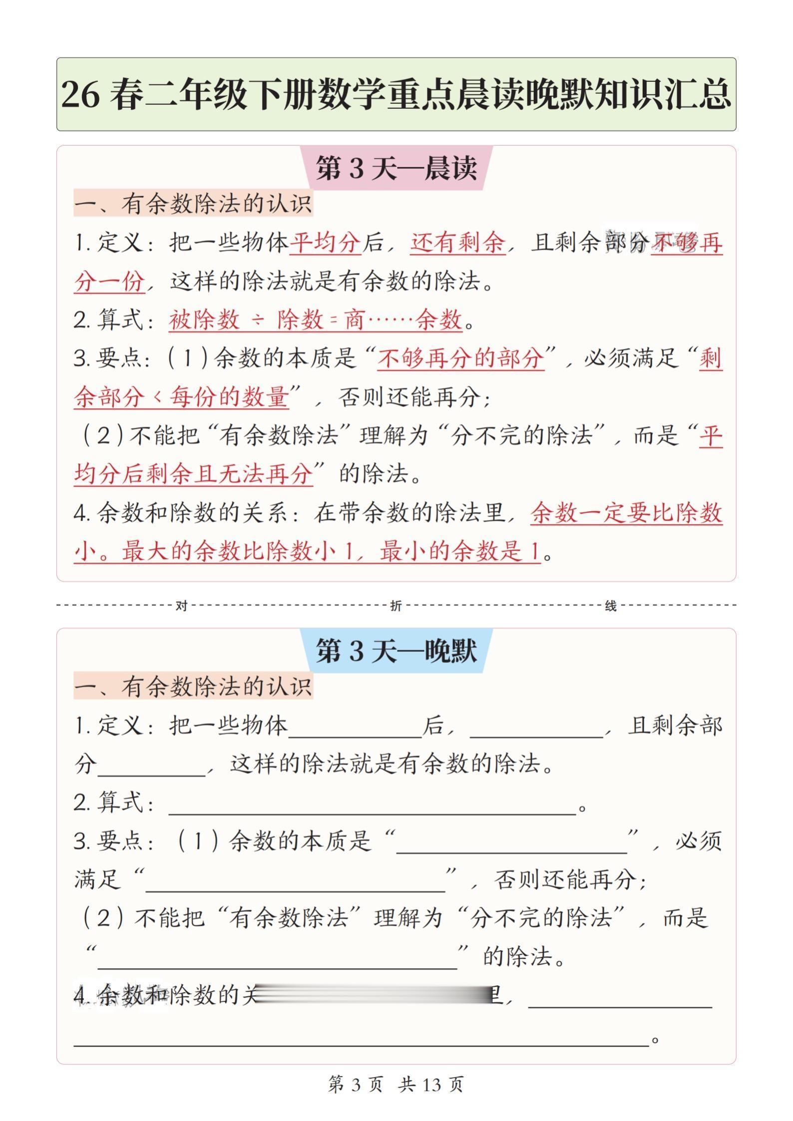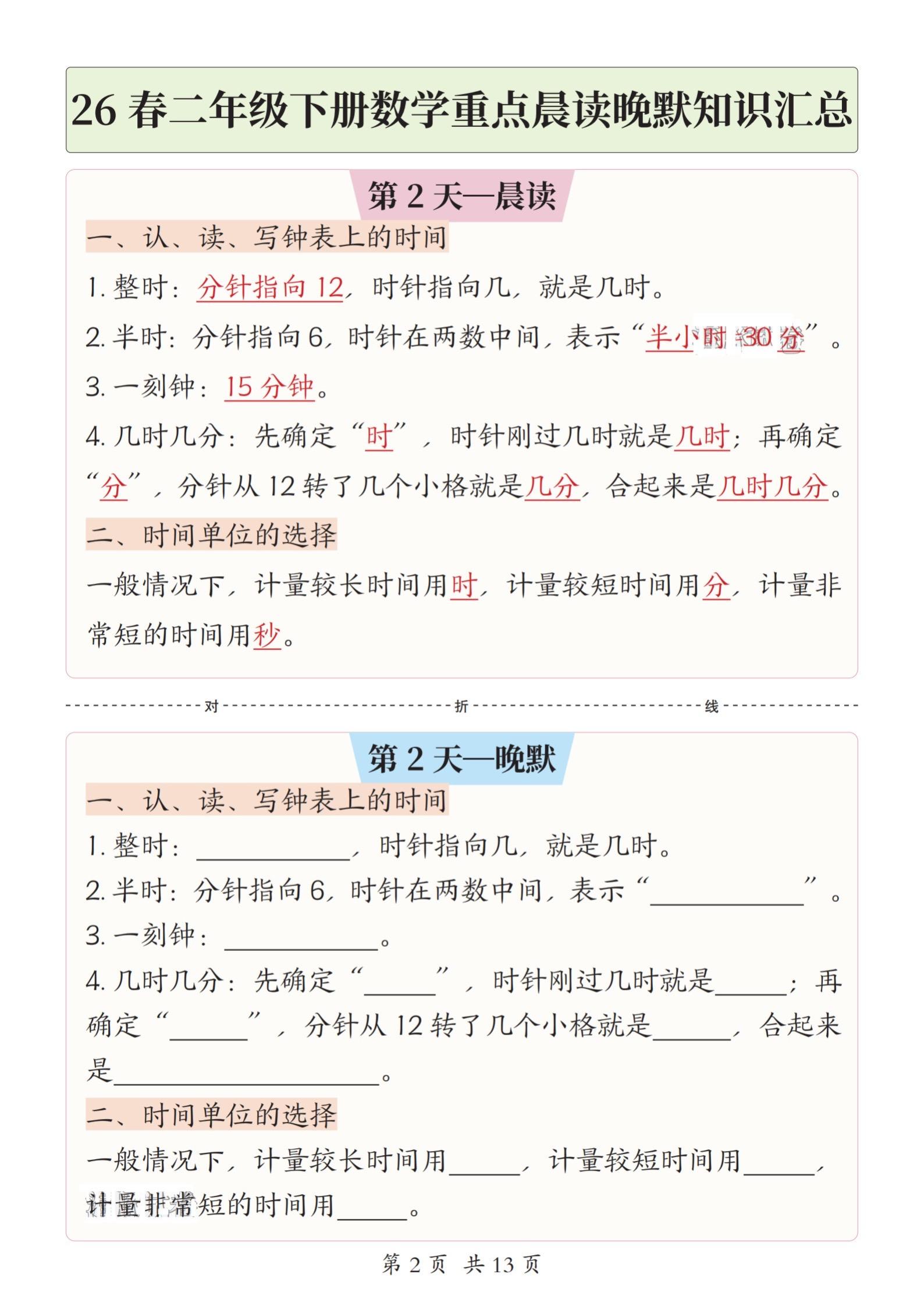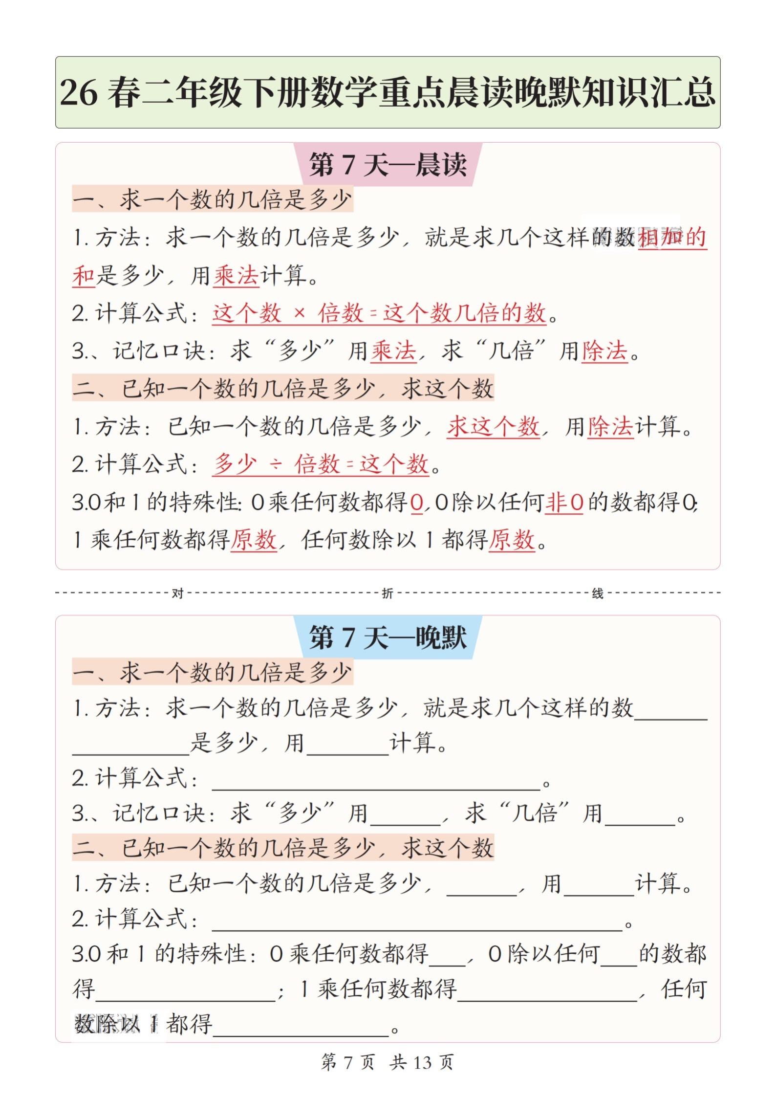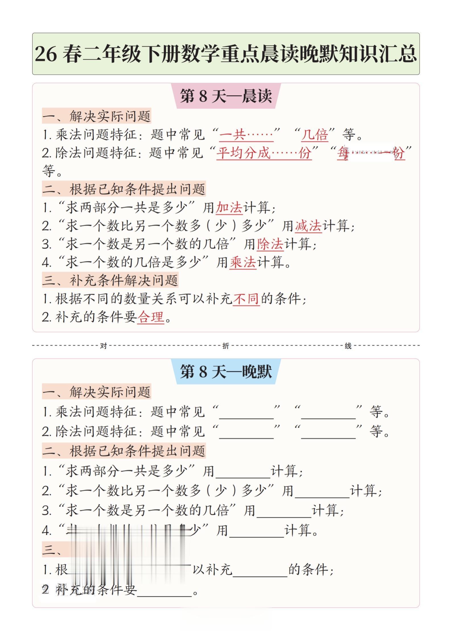 小学二年级下册数学晨读晚默重点知识汇总。