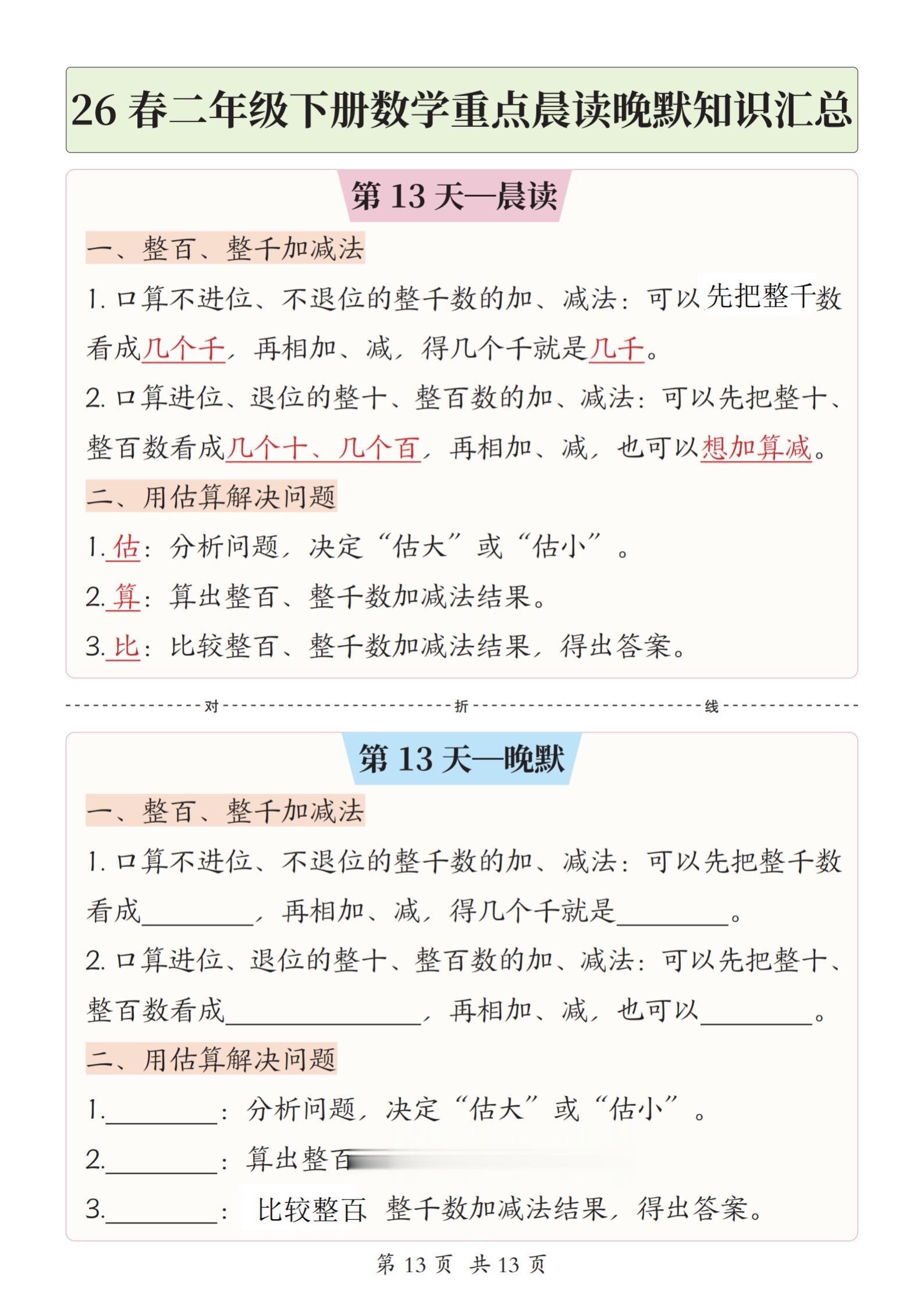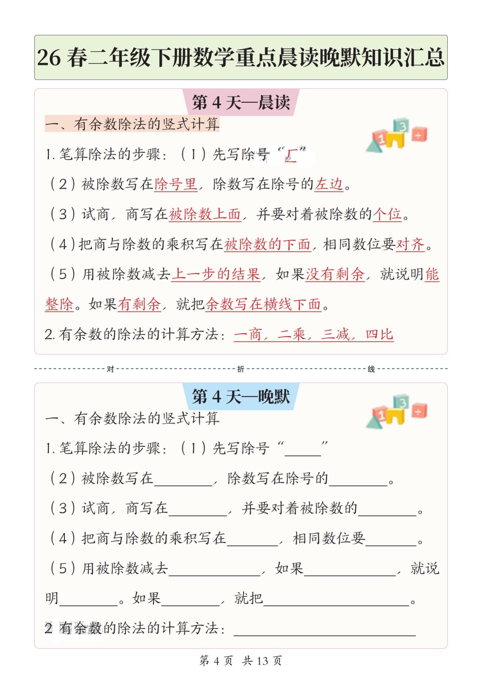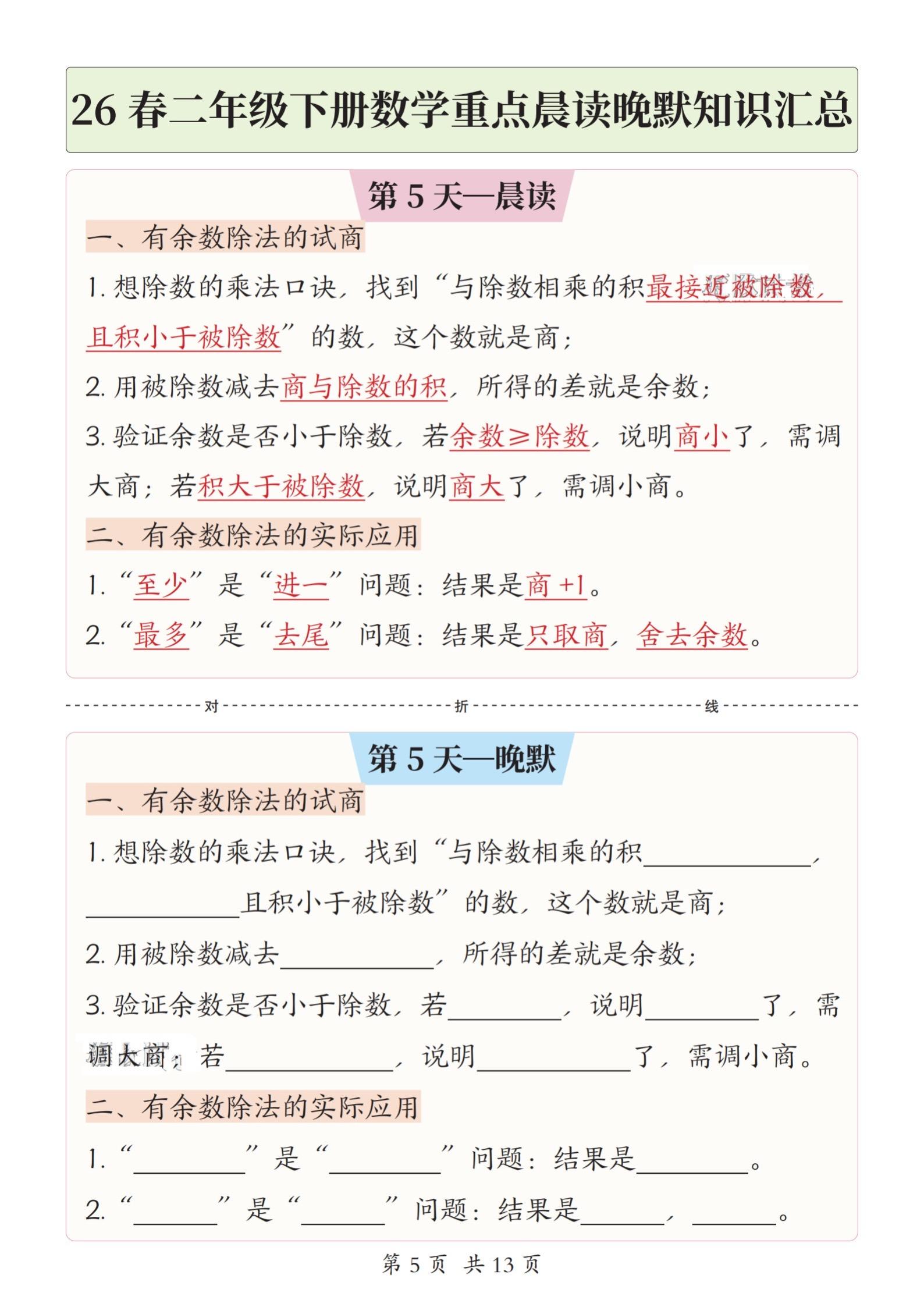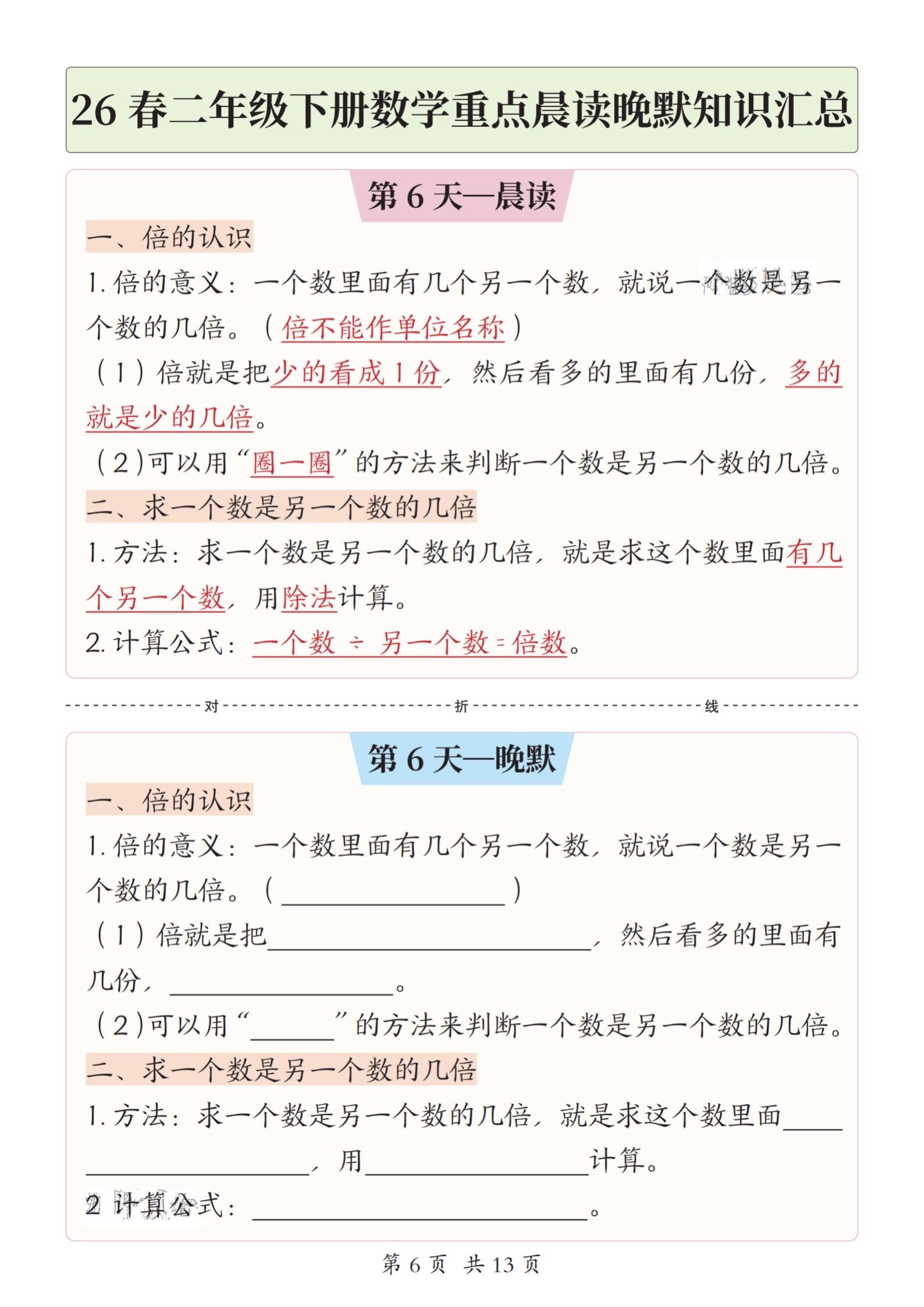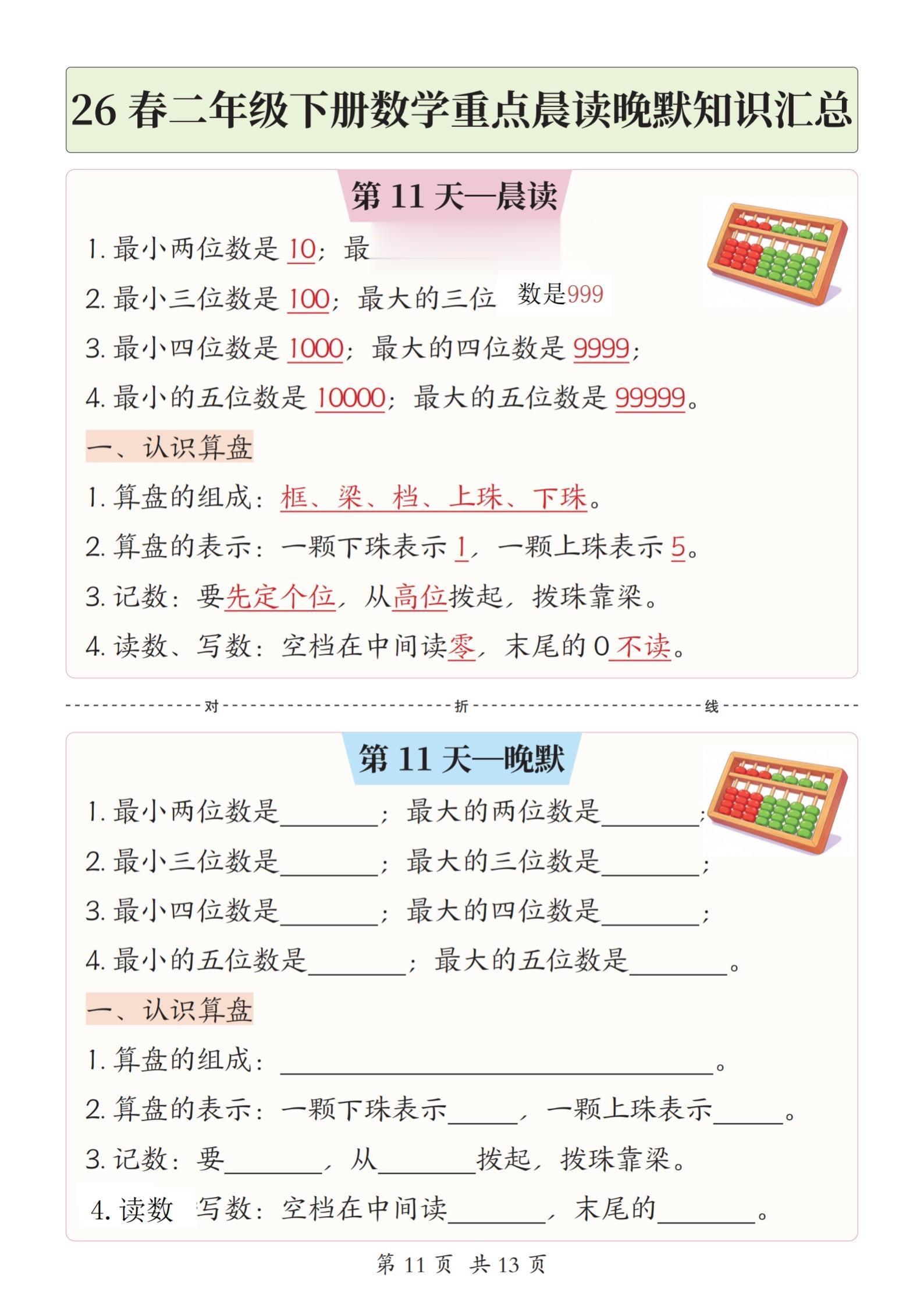 小学二年级下册数学晨读晚默重点知识汇总。
