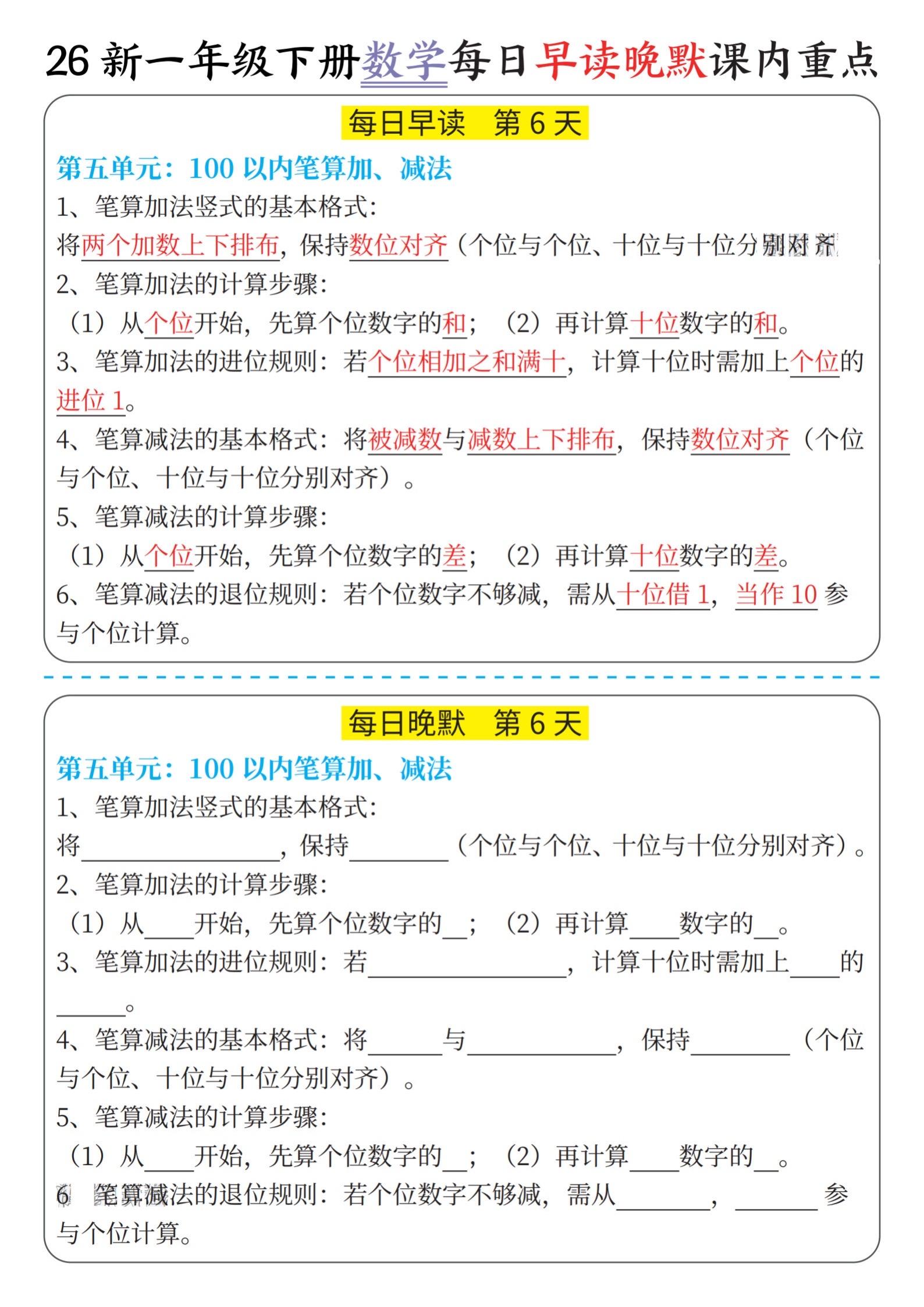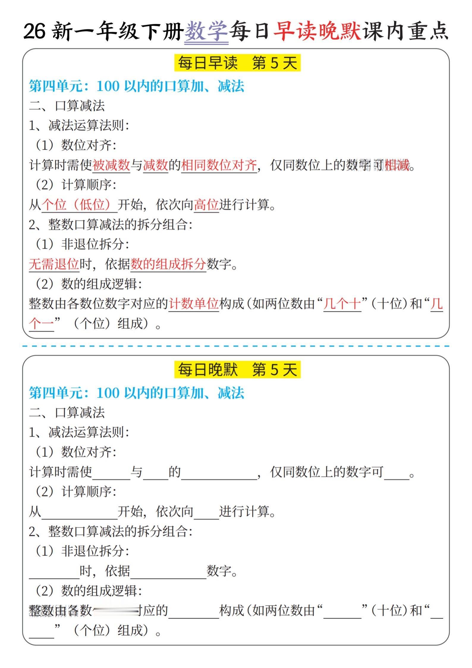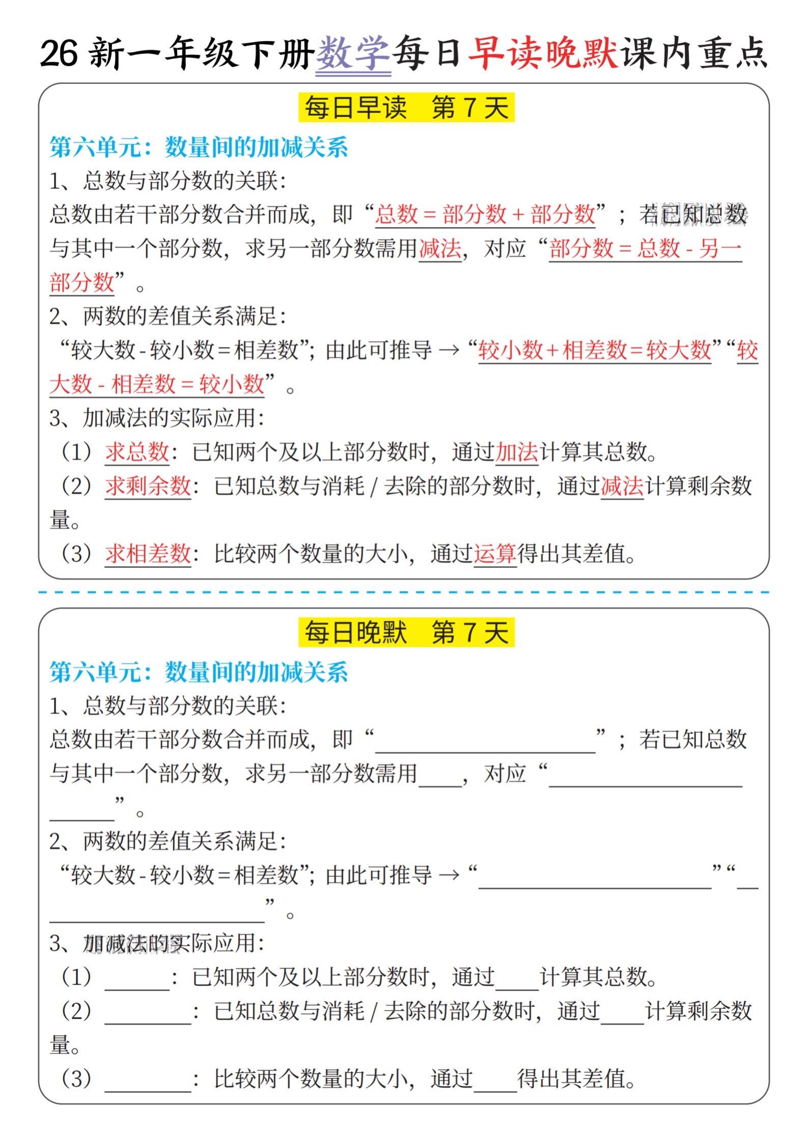小学一年级数学下册晨读晚默重点知识汇总。
