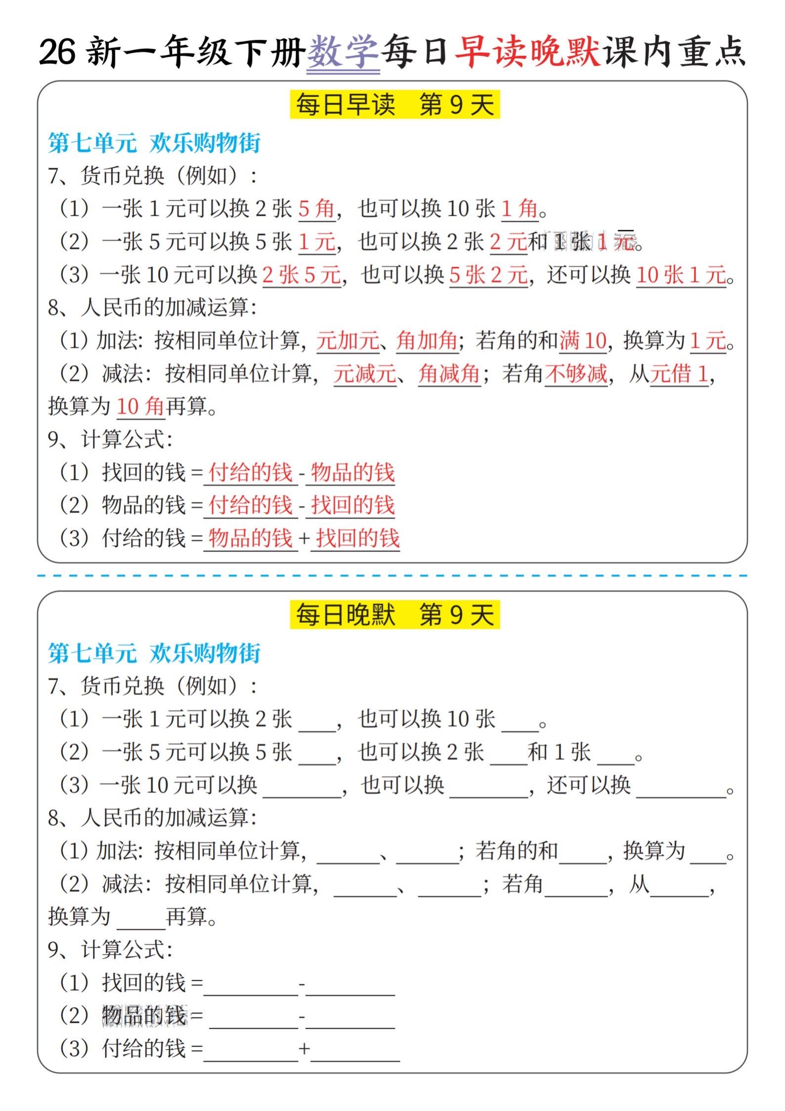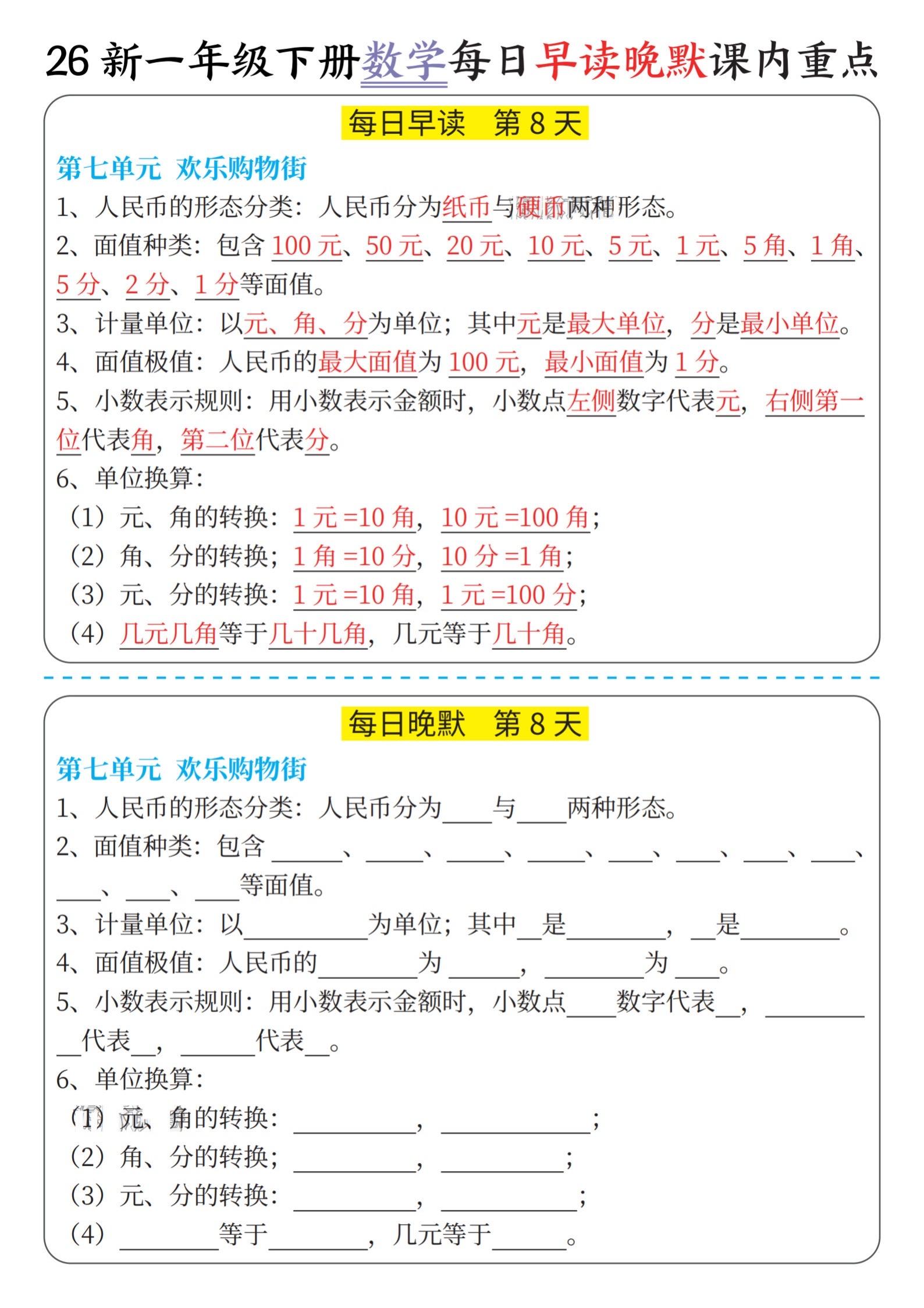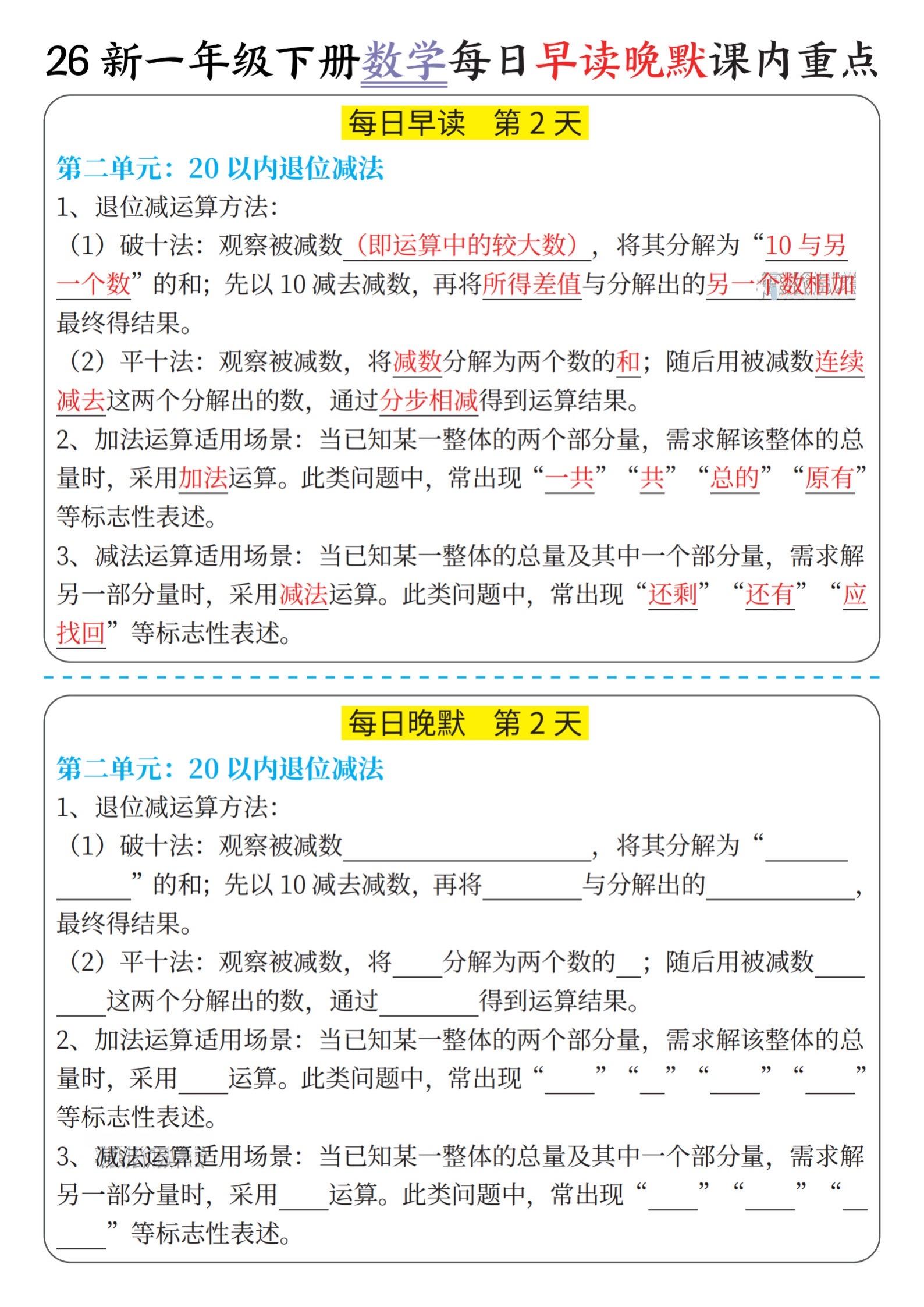 小学一年级数学下册晨读晚默重点知识汇总。