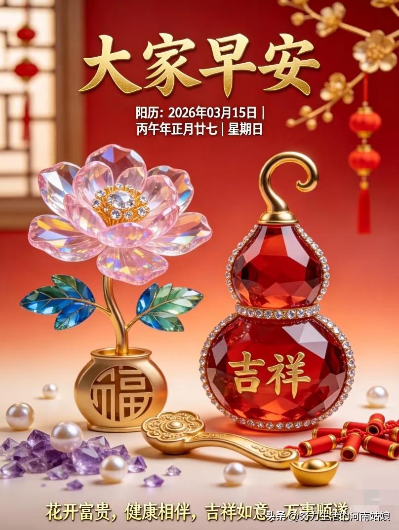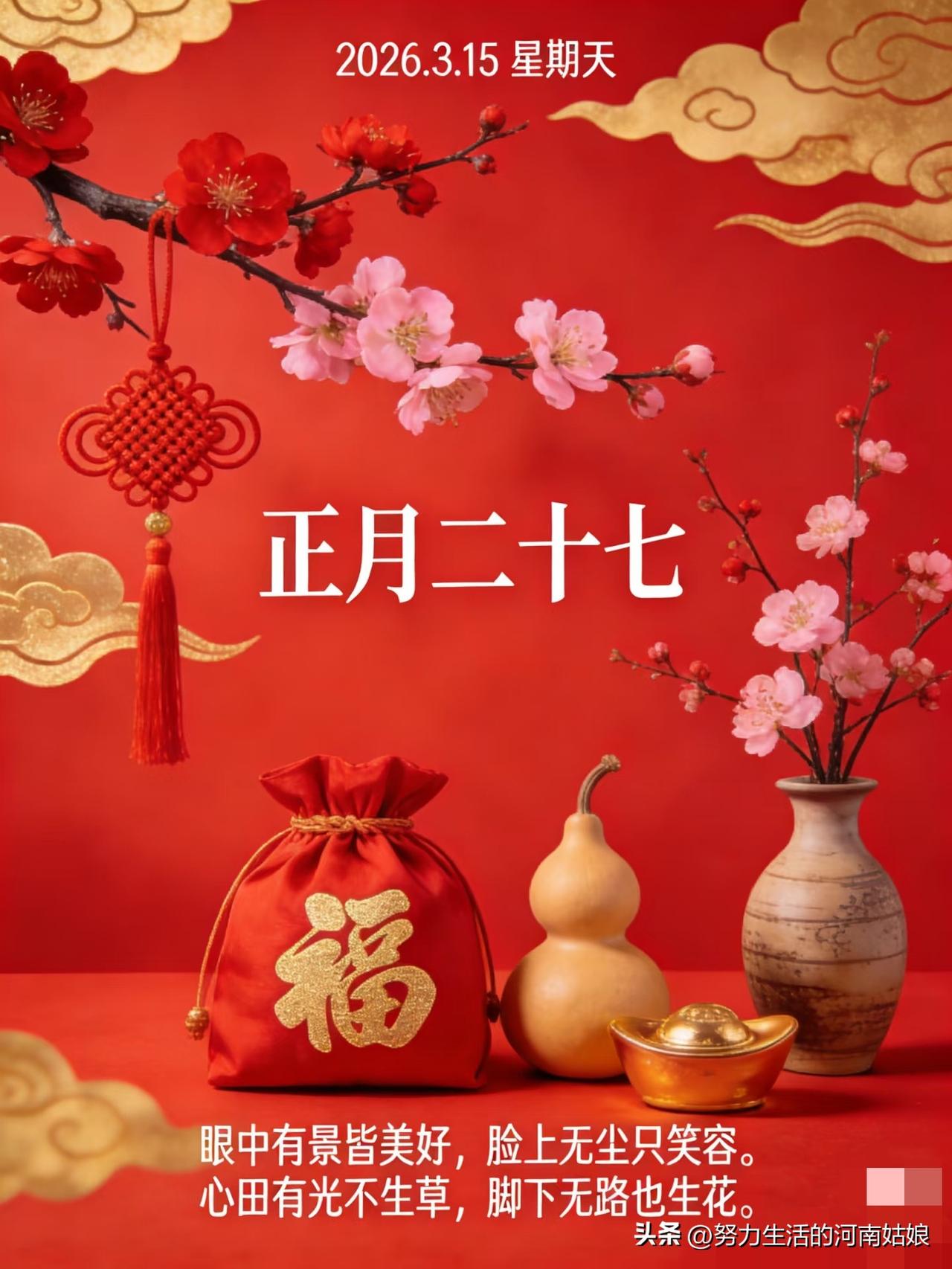 早安!今日周日,正月二十七,恰逢3·15。愿你生活货真价实,日子安心踏实,人心真诚不掺假,幸福满满不打折![福][福] 周日早安,正月二十七!3·15愿你:消费不踩坑,生活无套路,身边全是真心人,日子越过越舒心~[玫瑰][玫瑰] 新的一天,新的开始!今天周日,正月二十七,3·15平安喜乐。愿你所遇皆美好,所得皆真心,健康常在,好运常伴,早安[送自己一朵花] 早安~ 正月二十七,周日好心情!3·15愿诚信常在,温暖相伴,生活有保障,心里有阳光,平安顺遂一整天![万柿如意][万柿如意] 周日 3.15消费者权益日