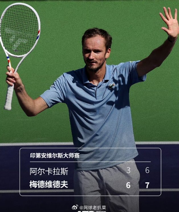 ATP1000印第安维尔斯大师赛半决赛,梅德维德夫6-3 7-6(3)击败头号种子阿尔卡拉斯,终结对手赛季16连胜、室外硬地34连胜,结束对后者的四连败(总战绩3-6),取得一波九连胜,生涯第三次跻身本站决赛,第11次打入大师赛决赛,将和辛纳 争夺冠军🥇