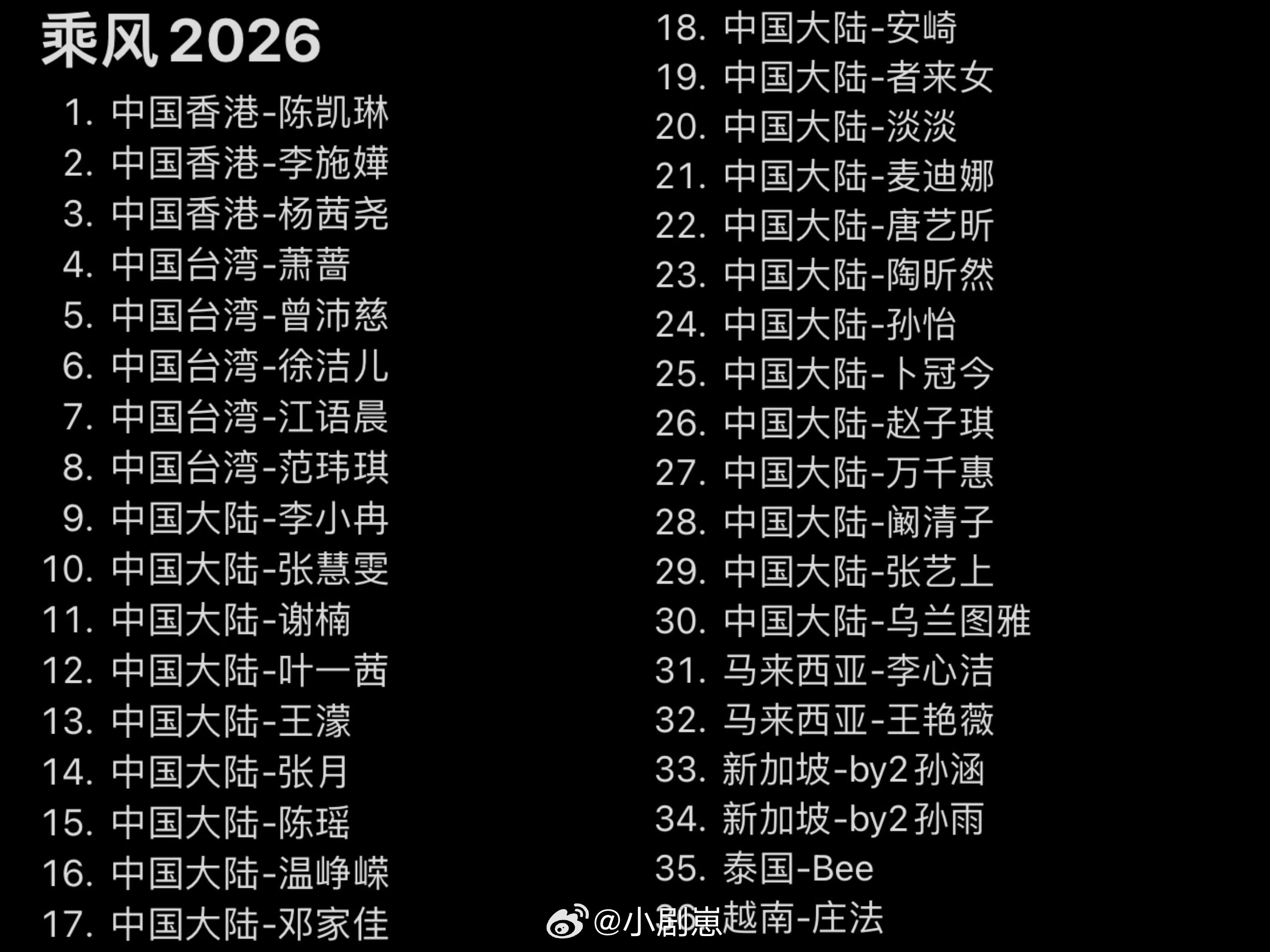 乘风2026官宣最终名单!浪姐7有替补和新增,4月初直播初舞台36位选手:陈凯琳、李施嬅、杨茜尧、萧蔷、曾沛慈、徐洁儿、江语晨、范玮琪、李小冉、张慧雯、谢楠、叶一茜、王濛、张月、陈瑶、温峥嵘、邓家佳、安崎、者来女、淡淡、麦迪娜、唐艺昕、陶昕然、孙怡、卜冠今、赵子琪、万千惠、阚清子、张艺上、乌兰图雅、李心洁、王艳薇、by2孙涵、by2孙雨、Bee、庄法
