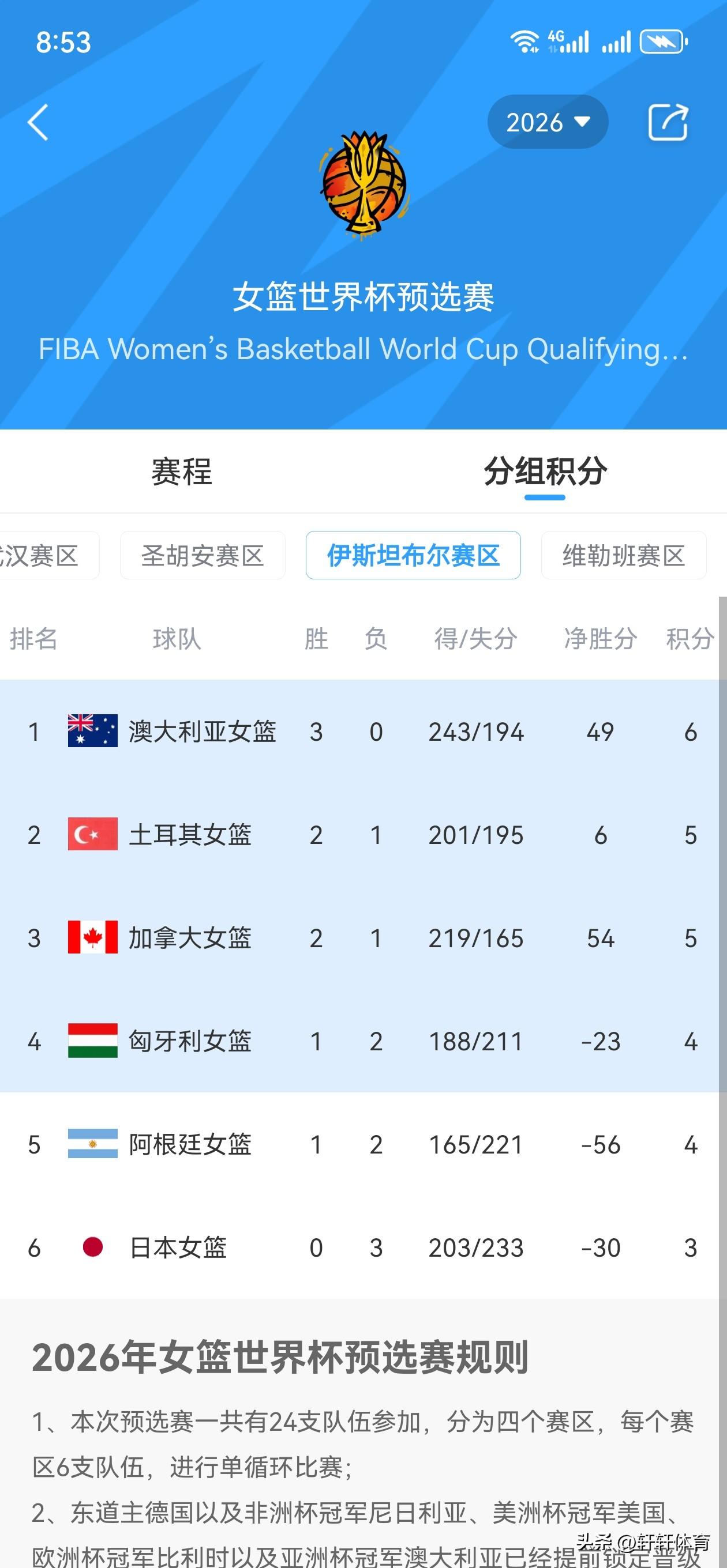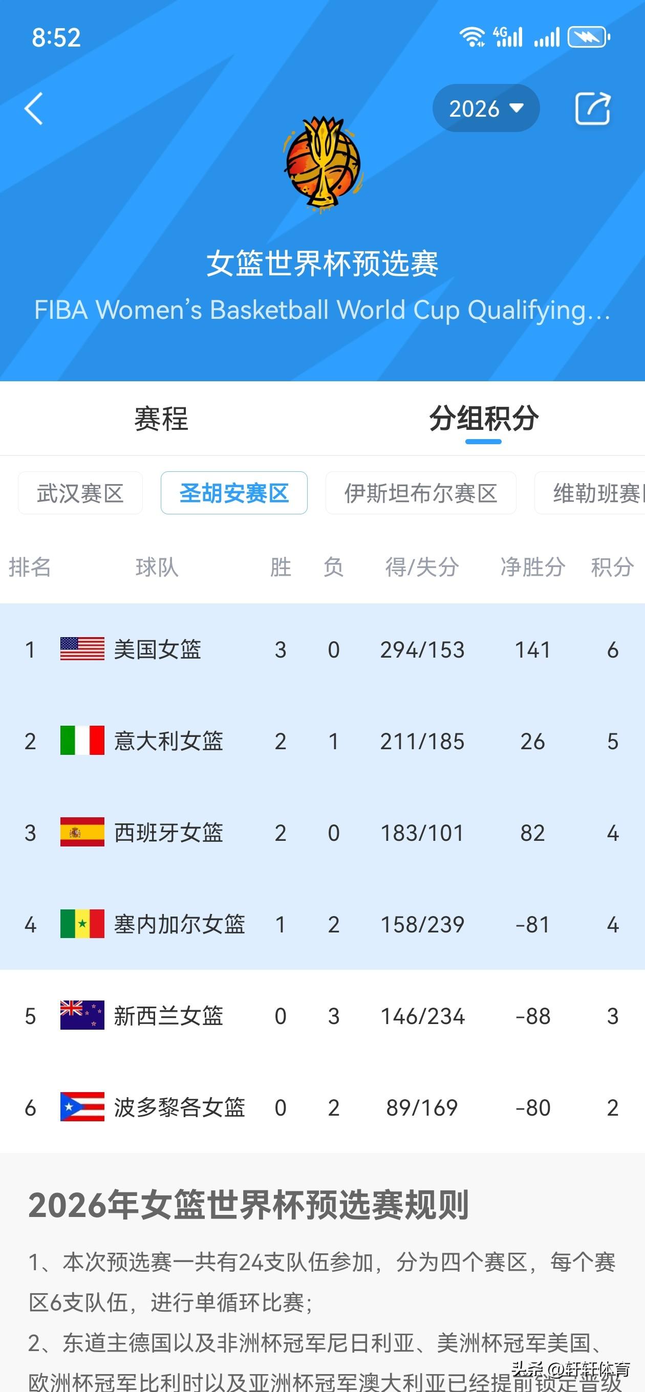 女篮世界杯四个赛区经过3轮比赛,出线基本盘已经确认: 首战先就是中国女篮所在的武汉赛区,目前排名第一的是比利时女篮以三战全胜积分6分,捷克女篮与中国女篮均2胜1负积5分,由于净胜分原因捷克女篮排名第二,中国女篮排名第三,本赛区南苏丹女篮3战皆负积分3分,基本已经失去晋级希望。 维勒班赛区,法国女篮3战全胜积分6分排名第一,德国,韩国,尼日利亚女篮均以2胜1负积5分,但由于净胜分原因德国排第二,韩国第三,尼日利亚排第四,菲律宾与哥伦比亚女篮3战均负,积分3分基本上失去晋级希望。 伊斯坦布尔赛区,澳大利亚3战全胜积分6分排名第一,土耳其,加拿大女篮均以2胜1负积分5分排名第二,第三,匈牙利1胜2负积分4分排名第四,阿根廷1胜2负排名第五,该赛区组大的冷门就是日本女篮3战皆负积分3分排名垫底,日本女篮基本失去晋级希望。 圣胡安赛区,美国女篮3战全胜积分6分排名第一,意大利2胜1负排名第二,西班牙2胜0负排名第三,塞内加尔1胜2负排名第四,新西兰3战皆负排名第五,波多黎各2负0胜排名第六,新西兰与波多黎各基本失去晋级希望。 本次预选赛总计24支球队参加,除去东道主德国女篮,非洲冠军尼日利亚,美洲冠军美国,欧洲冠军比利时,亚洲冠军澳大利亚已经提前锁定正赛名额外,在剩余19支球队中,还要有11支球队拿到世界杯正赛资格。