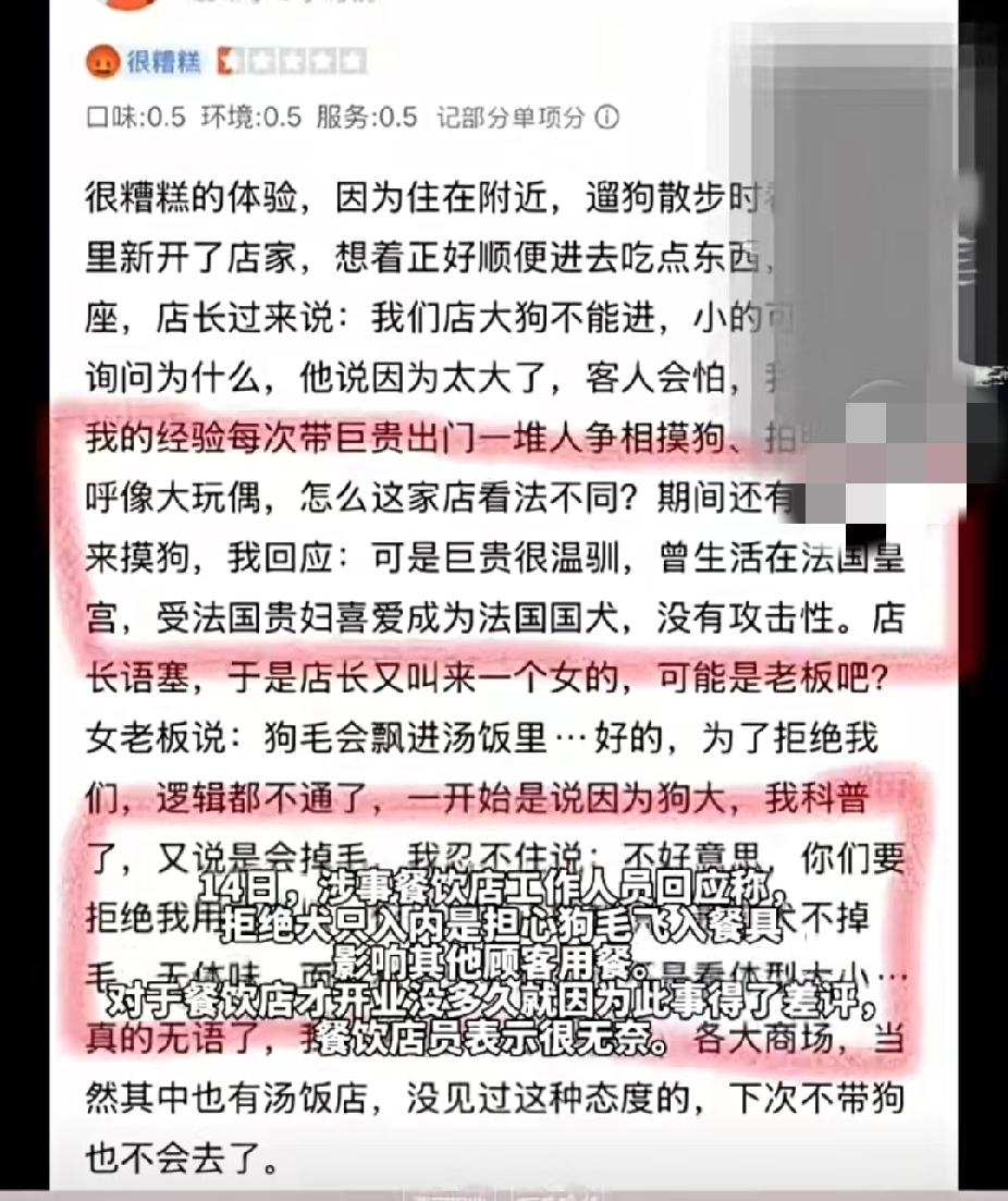 太奇葩!女子牵一大一小两条狗进餐饮店,被店员劝阻后愤怒离场,并留下差评:“我的狗曾生活在法国皇宫,深受法国贵妇们的喜欢!” (信息来源:西安晚报) 3月12日,江苏无锡。一家刚刚开业才两天的餐饮店,老板无论如何也想不到竟然会发生这样的事。 一女子牵着一只巨型贵宾犬和一直小泰迪走进店里,店员见状,连忙上前与女子沟通,表示大狗是不允许带进店内的,小狗可以交由工作人员单位照顾,用餐结束后再领走就可以了。 女子不解,问:“为什么?” 店员解释是担心其他顾客可能会害怕这种大型犬,尤其是孩子。 但女子表示:“以我遛狗这么久的经验来看,巨贵虽是大型犬,但它一直很温顺,是不会主动攻击人的。” 店员见劝阻不成,于是叫来老板,老板表示担心狗狗掉的毛会飘进汤饭里,影响顾客的用餐体验。 对此女子感到十分无语,表示:“为了拒绝我,你们还真是绞尽脑汁啊,前后说的都不一样,逻辑都不通了。” 女子说完后,便很生气的带着狗狗离开了。本以为事情就这样结束了,虽然有些不愉快,但好在没有影响到其他的顾客。 没想到女子离场后竟然在美食推荐上对该店铺进行一条长达百字的恶意差评。表示自己曾带着狗狗出入各种商场和餐饮店,从没有见过态度这么差劲的。并且自己的狗狗曾生活在法国皇宫,那些贵妇们都争抢着摸它,称它为“大玩偶”。并且众所周知巨贵犬是不掉毛、无体味的。 女子还表示:“从没有见过这种态度的,以后就算是不带狗狗,也不会去这家店了。” 刚刚开业两天就收到这样的差评,店员表示非常的无奈。但是我觉得店员和老板做的都没有错。毕竟是公共用餐的场所,并不是所有人都喜欢宠物,还是要以大局为重。 这条差评虽然会影响评分,或许还会因祸得福呢,让大家觉得这家店很注重餐品的安全和卫生。如果能向平台申请删除这条差评,就再好不过了。 至于女子,不如带着自己的巨贵,回法国皇宫居住吧!对此,你怎么看呢?