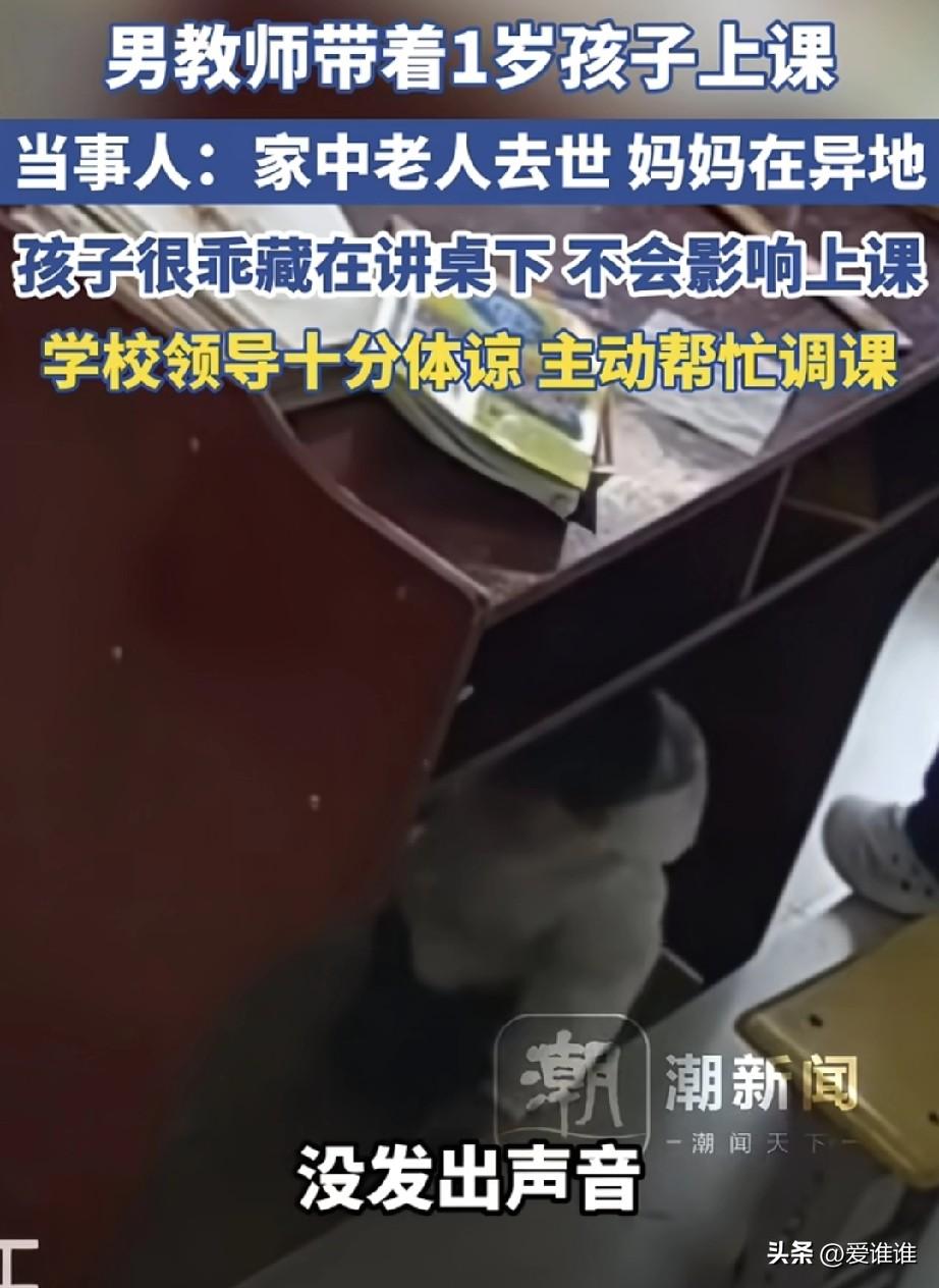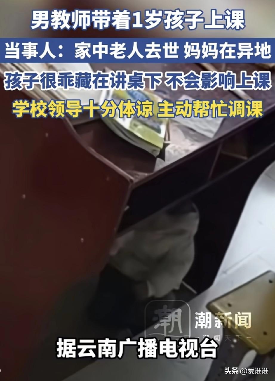 云南昭通,一位男老师,因为家里老人突然去世,妻子又在异地工作回不来,实在没办法,只好带着一岁多的孩子去学校课堂上授课。 为了不影响学生们上课,他把孩子藏在了讲桌下面,小家伙特别乖,不哭也不闹,就自己在底下安静地玩,有时候孩子困了,老师就干脆用背带把孩子背在身后,一边托着娃一边继续讲课。 很多人可能会问,怎么不请假呢,其实在基层学校,师资很紧张,老师要是请假了,几十个孩子的课就得落下,这位老师也是被逼得没办法,才出此下策。 好在学校知道这事后,没有批评他,反而特别体谅,校领导主动帮他调整了课程,还找人帮忙照看孩子,挺暖心的。 网友们看了都很感慨,有人说:讲台上是责任,背上是父爱,也有人说,看着讲桌下那个小小的身影,真的又心酸又感动,我想这大概就是普通人在生活里的不易和坚持吧!
