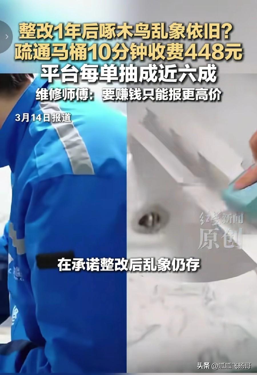 又到了315消费者权益日 。 每年315这几天, 不少不良商家会瑟瑟发抖,因为媒体会强有力关注典型的损害消费者权益的商家进行曝光 , 都害怕自己被不幸选中 ! 个人感觉315这几天保护消费者合法权益看似轰轰烈烈,其实对消费者权益的保护没有起到多大的作用。 315一过,不良商家依然固我, 同样坑害消费者。 最明显的例子就是去年的315晚会曝光某某鸟收费乱象,某某鸟承诺要进行整改, 据红星新闻报道 ,某某鸟收费乱象仍然存在价格虚高,服务与收费不符的问题 。 消费者杨女士反映,2月18日家中马桶堵塞,通过某某鸟平台下单疏通服务,维修师傅未详细检查就报价448元,事后她发现收费单标注打捞疏通,楼下拆检修口,实际师傅仅用钢丝绳疏通10分钟未尽打捞义务,也未下楼检修,经多次的平台投诉,杨女士获全额退款及1000元举报奖励,多名维修师傅透露,平台每单抽取订单金额近60%,师傅为赚钱只能抬高报价 。 3月13日某某鸟相关负责人回应乱收费,价格虚高,实际服务内容和收费单项目不一致的问题,这也是平台严格纠正的方向,并非我平台的主动行为。 另据闪电新闻报道,江苏徐州的小袁通过某某鸟家庭维修预约水龙头安装,师傅上门报价250元,优惠后220元,因觉得价格太高,小袁拒绝了服务,不料师傅离开两分钟后再次敲门,称主管要求接电话。电话中平台经理辱骂道没钱你点什么上门维修,就这点儿钱出不起你这辈子四个菜吃不上,小袁愤怒又委屈,随即向平台有关部门投诉,事后某某鸟客服热线称对师傅做出处罚并送一张30元无门槛优惠券。 看看, 如果有消费者硬刚维修师傅的乱收费,平台就会甩锅说是维修师傅的个人行为。 既然权威的315晚会都曝光了某某鸟收费乱象,为什么它的维修师傅还是乱收费呢?只怪维修师傅素质良莠不齐说不过去吧 。 曝光又什么意义呢? 315晚会年年曝光, 坑害消费者的商家依然很多, 如此反复循环 , 315晚会曝光对消费者的权益保护又起了什么实质性作用?