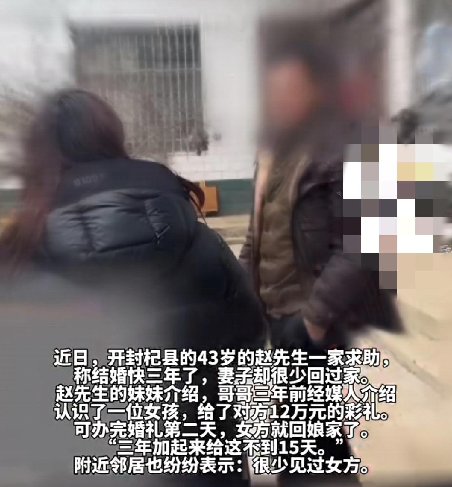 新媳妇娶进门后频繁回娘家,三年间在家的时间不超过15天!女方哥哥:“男方婚前隐瞒重大疾病!” (信息来源:青岛新闻网) 开封杞县43岁的赵先生之前通过媒人介绍认识了一名女孩,给了对方12万元的彩礼后,两人领证结婚。 可是婚礼后第二天女孩就回了自己家,之后便很少回来。迄今为止三年的时间,女方回来的日子屈指可数!赵先生家邻居也说:“几乎没咋见过这个新媳妇。” 看来赵先生的妻子在与赵先生大婚后大部分时间都住在自己的娘家,这听起来似乎不太符合常理。 接到赵先生的求助,记者跟随赵先生来到了赵先生妻子的娘家,见到了妻子的哥哥,对方称妹妹之所以结完婚就一直住娘家不愿意回自己家,是因为在婚礼当晚就发现男方有重大疾病,自己心里接受不了,所以一直住在娘家。妻子甚至怀疑赵先生是蓄意隐瞒自己的病史,有骗婚的嫌疑!如果自己早知道的话,根本不会同意这门婚事。 而赵先生则无辜的表示:“婚前我也不知道,结完婚才知道的。” 赵先生表示如果感觉日子还能过下去就回来,如果感觉过不下去了就离婚,但是彩礼钱要悉数退回。 目前事情陷入了僵局,对于赵先生所提返还全部彩礼的诉求,女方无法接受。希望能通过走法律程序,有一个公平公正的结果!开封身边事 夫妻那些事