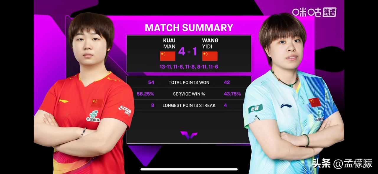 女单半决赛: 蒯曼(CHN)4-1王艺迪(CHN)【13-11,11-6,11-8,8-11,11-6】 第一局蒯曼 3-8落后,最后13-11逆转 决赛对阵日本张本美和与大藤纱月的胜者,将是一场严峻的考验! 乒乓球乒乓重庆冠军赛 重庆乒乓冠军赛