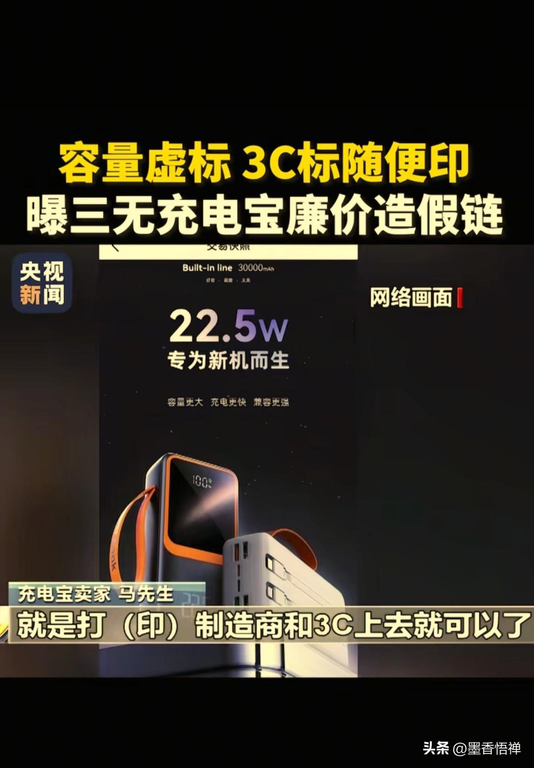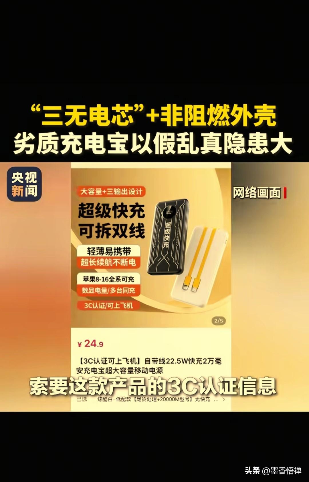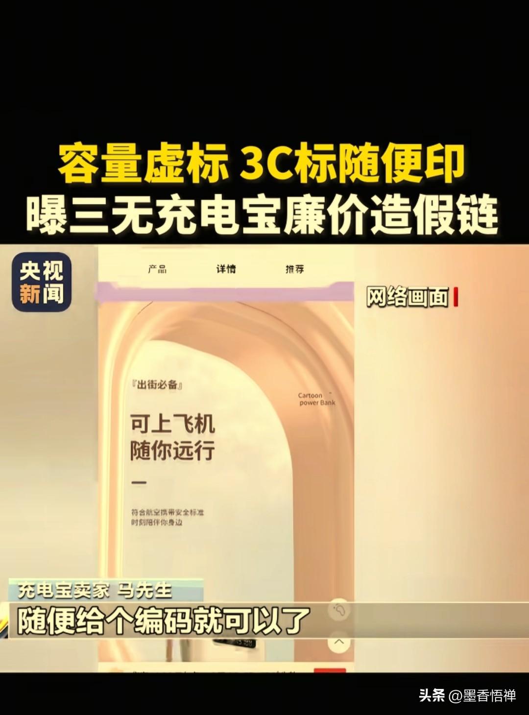 央视曝光!20000毫安充电宝仅6000毫安,假3C认证随意印,三无充电宝小心变“炸弹” 315前夕,央视新闻直击充电宝造假黑幕,市面上低价大容量充电宝全是套路,虚标容量、伪造3C认证、三无电芯、非阻燃外壳,随时可能起火爆炸,连飞机安检都能蒙混过关。 现在造假商为了赚钱简直没底线,把充电宝造假做成了一条明目张胆的流水线,每一步都在拿消费者的安全开玩笑。 记者问你们这样卖,没问题吗?充电宝买家马先生说:“没问题啊,如果要3C的话,这个实际根本过不了的。但是机器上面可以打3C,打印制造商和3C认证就可以了。平台要求提供3C认证的话,随便给一个就好了。” 商家嘴上喊着“2万毫安超大容量”,实际拆开一看,电芯只有6000毫安左右!相当于花了3倍的钱,买了个连手机充一次都费劲。 更离谱的是,他们连外壳都懒得换,直接把小容量电芯装进大壳子,标上虚高容量就往外卖,;外壳更是连阻燃效果都没有。 这条造假流水线,出厂价才14块,转手就能卖二三十,暴利背后全是安全隐患。 温馨提示:买充电宝3步避坑指南 1. 查认证编号:索要产品3C证书号,登录认监委官方平台核验,信息完全匹配才靠谱。 2. 看价格与标识:拒绝十几元的“超大容量”,机身需标注清晰容量、额定能量、厂家信息。 3. 选正规渠道:认准品牌旗舰店、线下商超,远离三无杂牌与低价引流款。 来源:央视新闻 充电宝质量 充电宝安全危机 充电宝3c标志 充电宝标准