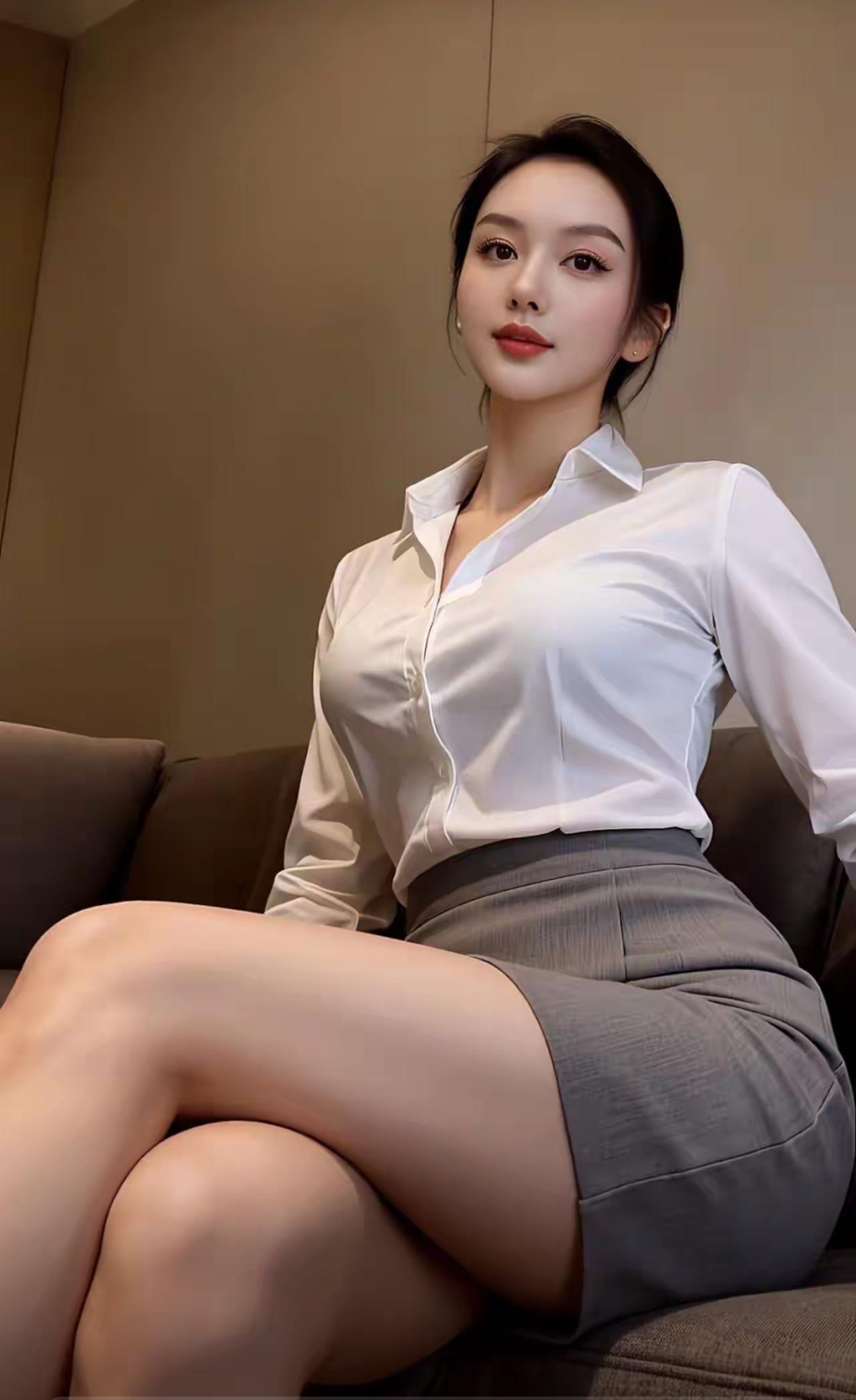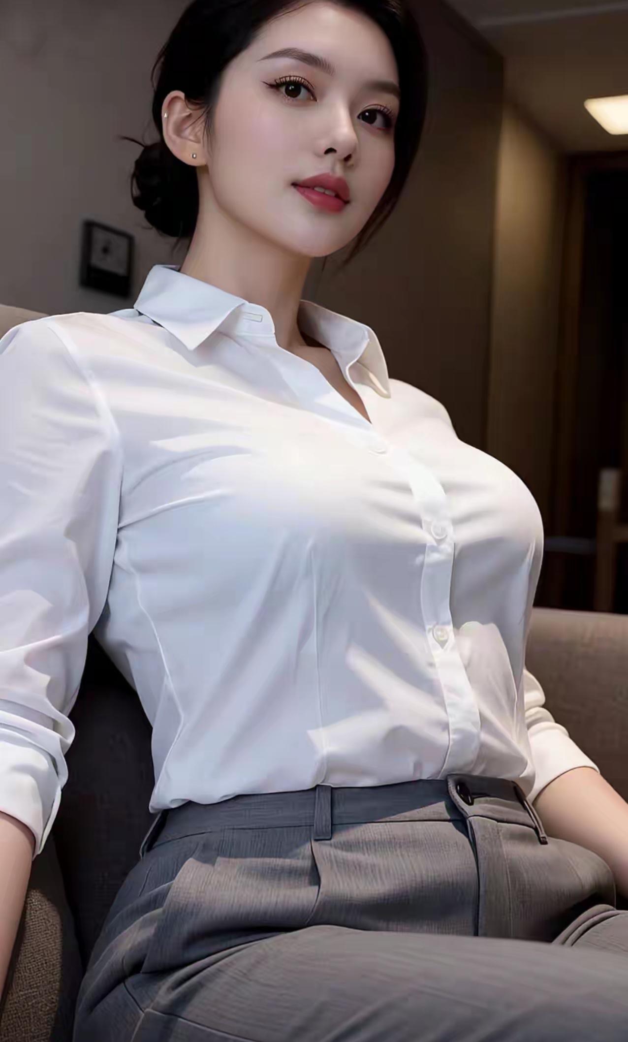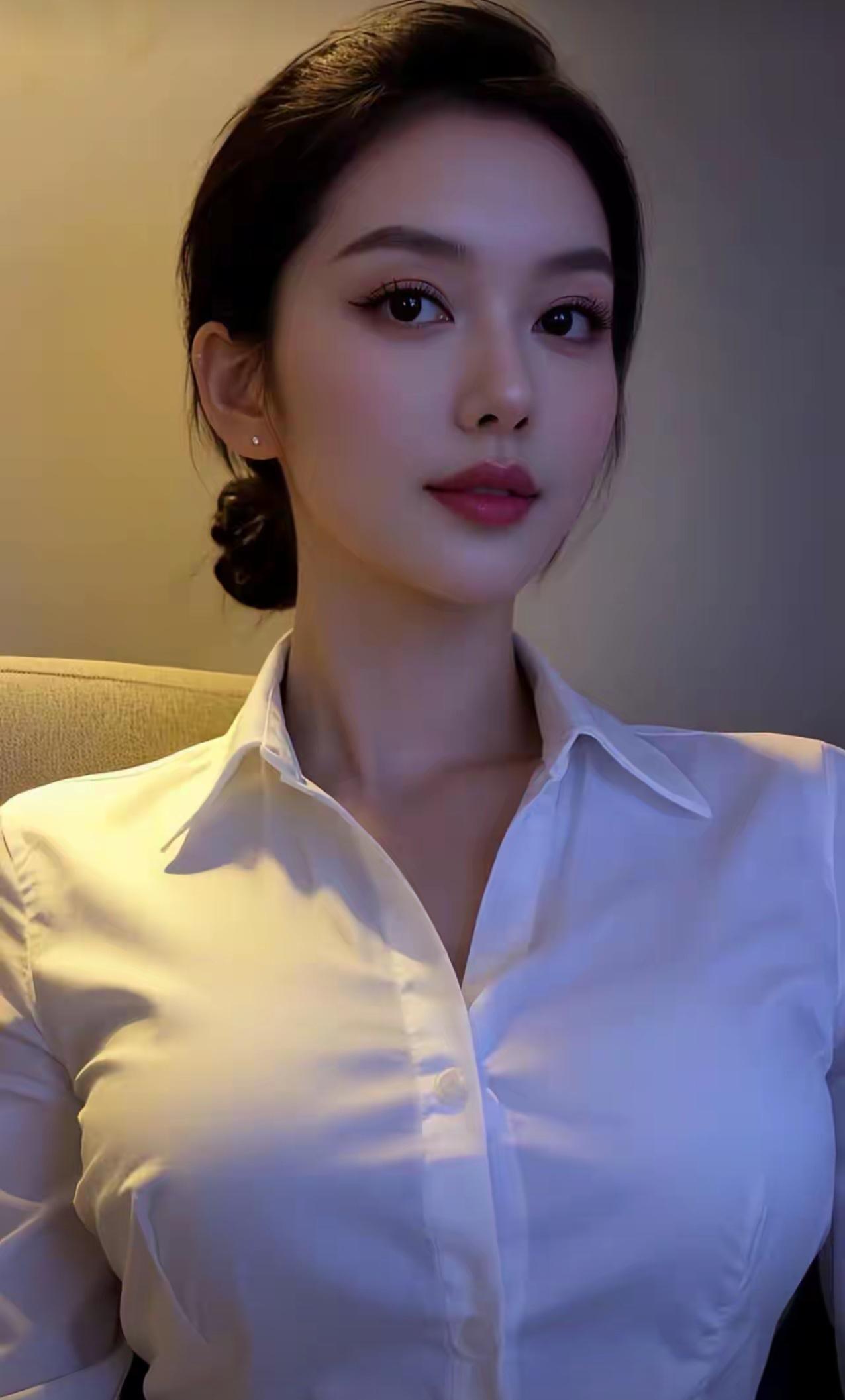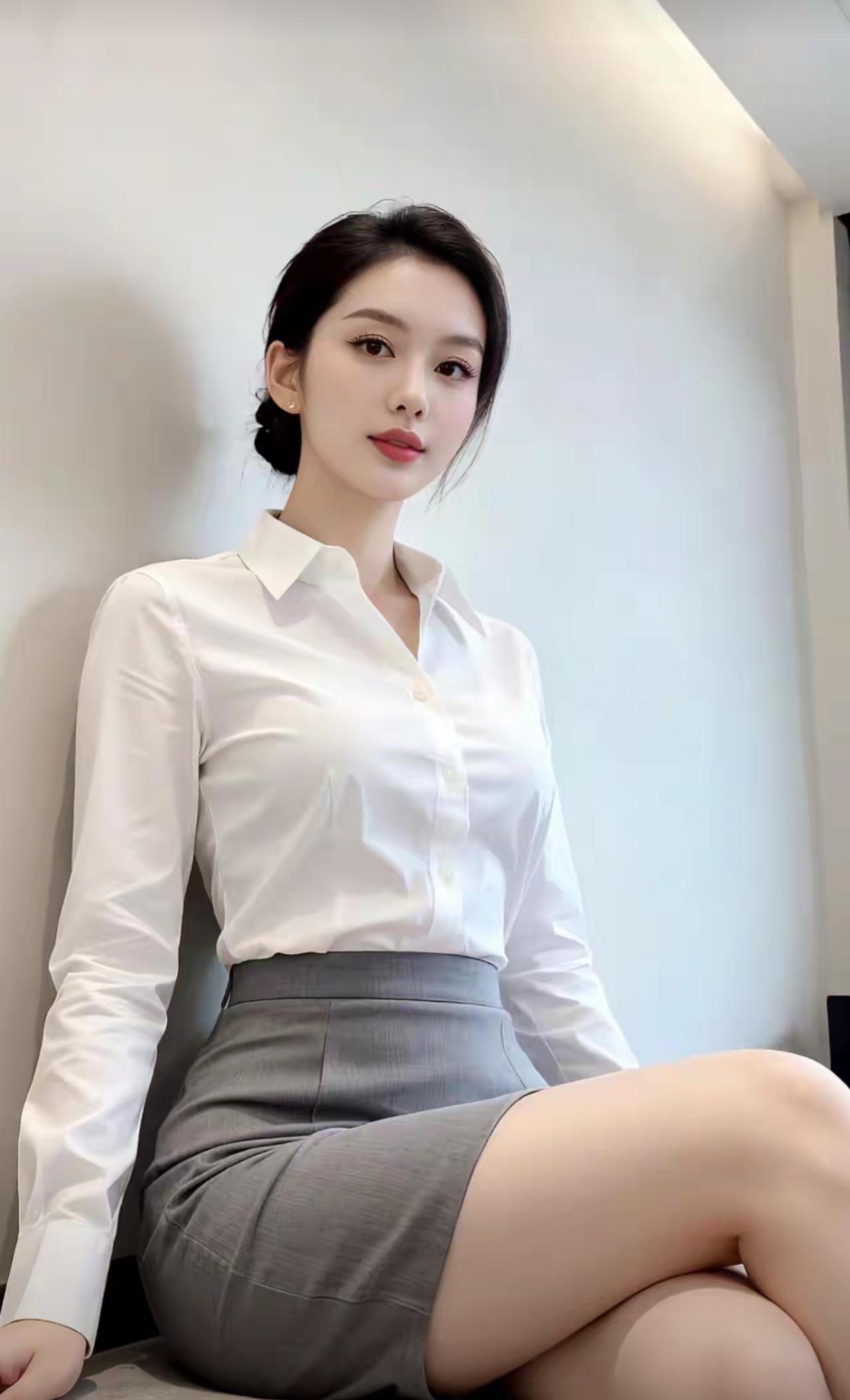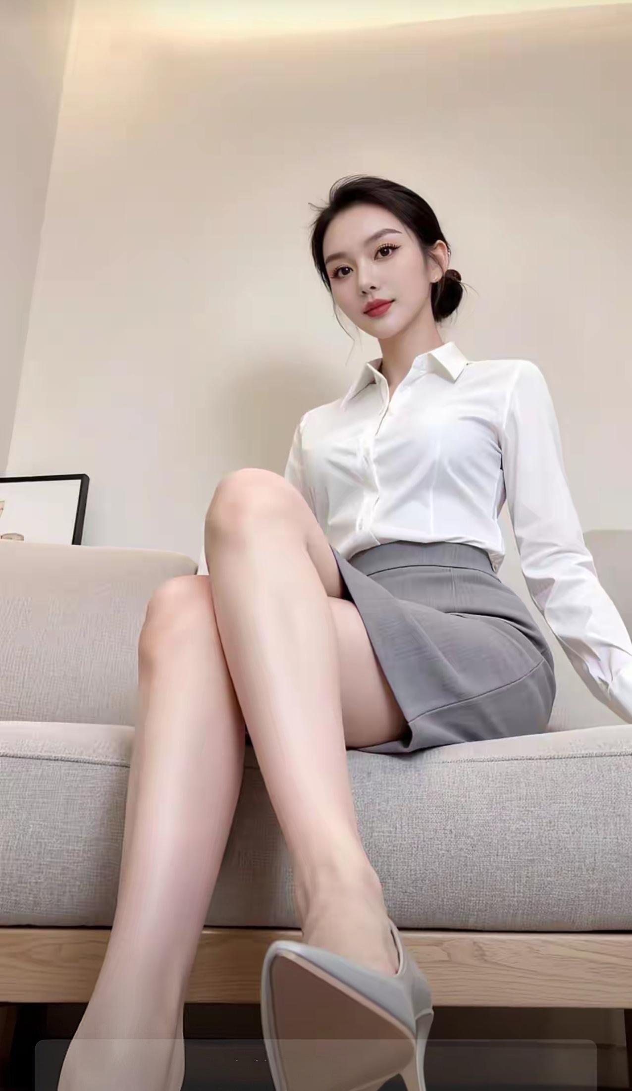 整体气质 这组图片展现了一位干练优雅的职场女性形象,以白衬衫+灰色下装的经典职业装为核心,在不同光影与场景下,呈现出专业、自信又不失温柔的多面魅力。 👩 人物与妆容 发型:乌黑长发被利落盘成低丸子头,几缕碎发修饰脸颊,既显精神又柔和了硬朗的职场感,凸显修长的天鹅颈。 面容:五官精致立体,眉眼清晰有神,眼尾微扬的眼线增添了几分锐气,温柔的豆沙色唇妆平衡了职场的严肃感,整体妆容干净清透,尽显知性气质。 神态:眼神从容自信,嘴角带着淡淡的笑意,姿态舒展不紧绷,传递出专业又亲和的职场气场。 👔 服饰与穿搭 上衣:挺括的白色翻领衬衫,面料顺滑有质感,微开的领口设计既保留了职业感,又巧妙露出精致锁骨,避免了刻板感。 下装:搭配灰色高腰西装裤或包臀半身裙,利落的剪裁勾勒出腰线,包臀裙更凸显优雅曲线,西装裤则偏向干练利落,两种下装都强化了职场精英感。 配饰:简约的小耳钉点缀耳畔,最后一张图中搭配了浅灰色尖头高跟鞋,拉长腿部线条,让整体造型更完整精致。 ✨ 光影与场景 场景:多以简约的室内空间为背景,浅灰墙面、布艺沙发等元素营造出舒适的办公或居家氛围,干净的背景更突出人物主体。 光影:暖黄、冷蓝等不同色调的光线打在身上,让白衬衫呈现出细腻的明暗层次,既凸显了面料质感,又为画面增添了氛围感,冷光下更显清冷高级,暖光下则温柔亲和。 💫 总结 这组图完美诠释了职场女性的优雅与力量:白衬衫的干净、灰裙/裤的沉稳,搭配舒展的姿态与精致的妆容,既有专业职场人的干练气场,又不失女性独有的温柔韵味,每一张都像都市剧里的精英女主,高级又耐看。