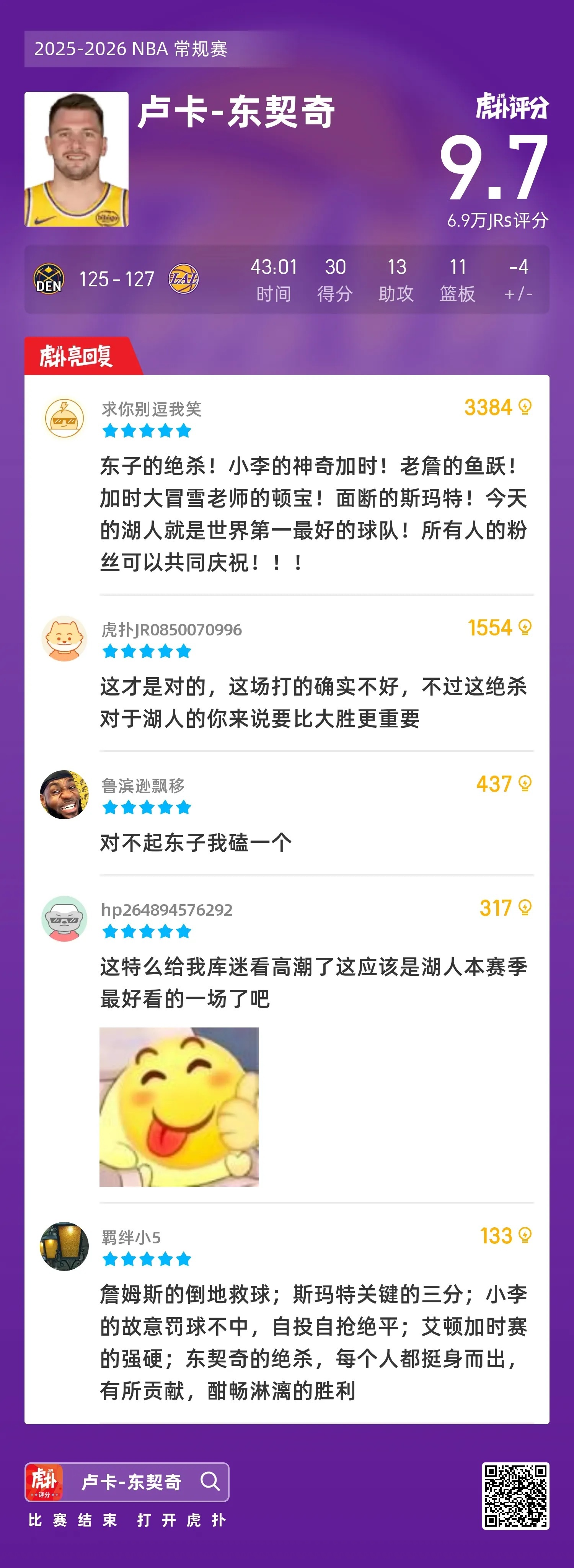 今日湖人以127-125战胜掘金。比赛最后0.5秒,东契奇面对斯潘塞-琼斯的防守,选择强突并在左侧底角后撤步中投命中,帮助湖人领先掘金两分。随后哈达威三分不中,掘金以2分惜败湖人。