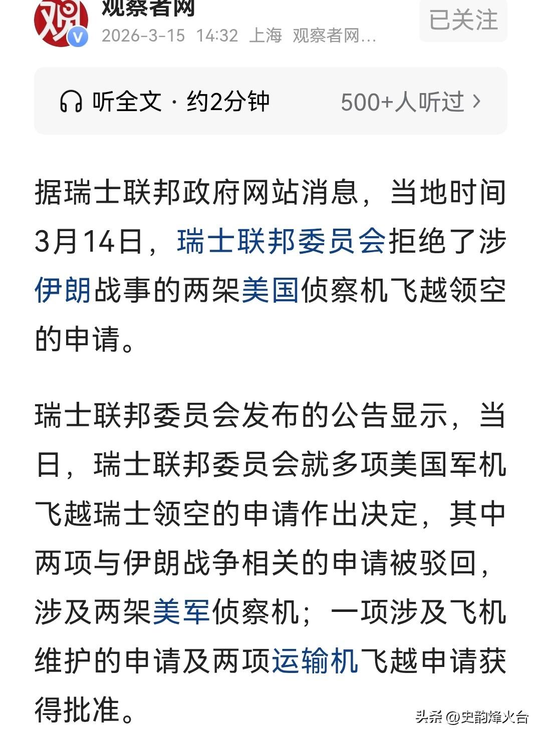 就在刚刚,瑞士做出了一个让很多人意外的决定。 3月14日,瑞士联邦委员会发布公告,明确拒绝了两架美军侦察机借道瑞士领空的申请。理由说得很清楚,这事和伊朗的战事相关,按照规定,不能放行。 把时间线拉回来,中东的局势从2月28日开始就持续升级。美国和以色列跟伊朗的矛盾彻底爆发,已经到了正面交锋的地步。伊朗这边,有消息显示,丧生人数已经达到1300人,更有消息提及,伊朗最高领袖哈梅内伊也在袭击中不幸离世。伊朗也没有坐以待毙,出动无人机和导弹,打击以色列、约旦等境内的美军基地。这一轮冲突,直接让全球航空市场出现波动,国际油价也跟着大幅震荡,整个地区的局势变得异常紧张。 在这样的大背景下,瑞士的选择就显得格外关键。作为一个拥有几百年中立传统的国家,这个时候不管偏向哪一方,都可能引发麻烦。瑞士联邦委员会这次一次性处理了多份飞行申请,态度分得很明白。两架侦察机的申请,因为和军事行动直接相关,被直接驳回;另外三个申请则得到了批准,其中一个是为飞机维护的技术飞行,另外两个是运输机的通行需求。简单来说,和打仗相关的,一律不批;纯粹的后勤保障、技术飞行,才可以商量。 瑞士还把这个标准公开了出来,以后就按这个规矩来。只要是人道主义救援、运送伤员这类非军事目的的飞行,完全没问题。但只要申请里看不出明确的非军事用途,或者一眼就能看出是军事目的,那就直接拒绝。 仔细想想,瑞士的做法其实很好理解。这个国家面积不大,领空范围有限,头顶上飞过什么飞机,一目了然。今天如果放行美国的侦察机,明天以色列的战机来申请怎么办?后天伊朗要是也提要求,批还是不批?一旦开了口子,很可能会被卷入这场冲突,成为各方势力博弈的舞台。所以,不如一开始就把红线画清楚,不让任何一方有机会借道。中立法不是摆设,在这种敏感时刻,它就是小国保护自己的护身符。 这一波操作,表面上看只是处理几份飞行申请,实际上是在复杂的国际局势里,给自己找了一条安稳的路。既没有直接得罪美国,也没给伊朗留下指责的理由。整个过程走的是官方流程,看起来规规矩矩,背后却藏着很实在的生存智慧。 瑞士这道“空中禁令”,看似是处理了几件枯燥的飞行审批事务,实则是在战火纷飞的当下,守住了自己的中立底线。当中东局势失控,小国不用去选边站,而是可以用明确的规则,筑起一道防火墙,挡住外部势力的干扰。这次拒绝美国,不是所谓的“背叛”,而是对“中立”的一次坚守。它用实际行动告诉所有参与冲突的国家:瑞士领空不是你们的军事通道。在大国博弈的夹缝里,这种不偏不倚的态度,反而成了维持自身独立最可靠的方式。