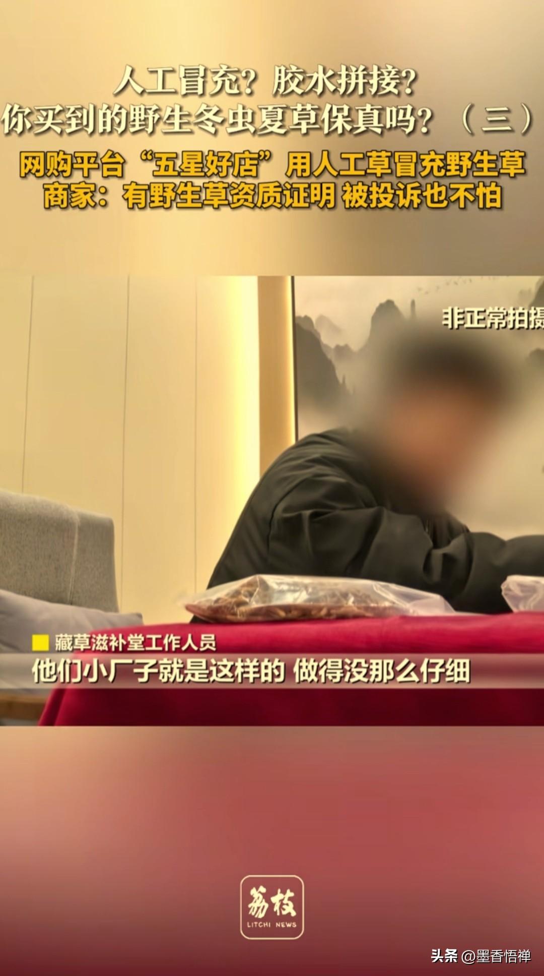 315荔枝新闻实地探访曝光:年销20万根假虫草!胶水拼接冒充野生,商家竟称吃了没事 近日,荔枝新闻记者实地暗访宿迁滋补品商行,揭开了网红假虫草的造假黑幕,涉案店铺2025年售出拼接虫草超20万根,暴利造假行为令人发指。 记者从网购平台随机挑选了多款热销虫草送检,发现这4个商家多款产品存在严重造假,其中问题最突出的货品,并非正宗冬虫夏草,而是有毒副作用的亚香棒虫草,长期食用会危害人体健康。 为核实真相,记者以合作洽谈为由,前往该网店实际发货地——宿迁某粮油市场的一间10平米小门面。店内货架与桌面堆满虫草与包装,面对询问,工作人员毫无避讳,直言店内全是假货,也检测不出来。 这些假虫草的造假手段极为简单粗暴:将草头与廉价的虫身,用几十块钱一瓶的胶水粘合,伪装成品相完整的“野生那曲虫草”,以数百元一根的高价售卖,成本一克5块钱,利润翻数十倍,说普通消费者根本看不出来。 记者问人吃了有没有事,商家更是大放厥词:“买的好胶水,吃下去没事”,全然不顾胶水残留与伪品虫草的健康风险,甚至炫耀造假资质齐全,无惧消费者投诉。 网店工作人员说他们的销售价格很实惠,只有野生草的四分之一,买家知道了也不会投诉。懂的人看到这个价格不会买的,不懂的你说是人工的就是人工的,你说野生的就是野生的。 有人投诉到市场监管部门他们也不担心,提供野生草的资质就可以了,他们都有的,没有什么问题。 药学专家明确指出,亚香棒虫草属于明令禁止入药的伪品,含微量毒素,无任何滋补效果,长期服用可引发头晕、恶心,损伤肝肾。即便为拼接残草,也毫无营养价值,胶水残留更会加重身体负担。 一招辨别真假虫草,避坑指南 1. 看衔接处:真虫草虫体与草头自然衔接,无胶痕与断面;假虫草接口粗糙,可见胶水与拼接痕迹 2. 看外观纹理:真虫草纹理紧实、体态匀称;假虫草体态臃肿、质地松散,染色痕迹明显 3. 闻气味:真虫草有天然草香;假虫草无香味,或伴有化学胶水异味 在此提醒广大消费者,购买名贵滋补品务必选择正规渠道,切勿轻信低价“野生直供”噱头。 本内容来源于荔枝新闻实地探访报道,案件后续查处以市场监管部门官方通报为准,转发提醒家人朋友,远离胶水假虫草,守护自身健康!