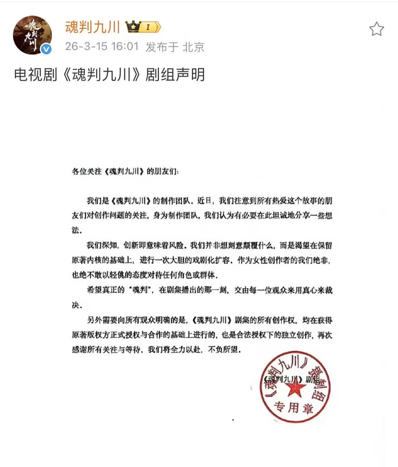 魂判九川发布声明“《魂判九川》剧集的所有创作权,均在获得著版权方正式授权与合作的基础上进行的,也是合法授权下的独立创作,再次感谢所有关注与等待,剧组将全力以赴,不负所望”