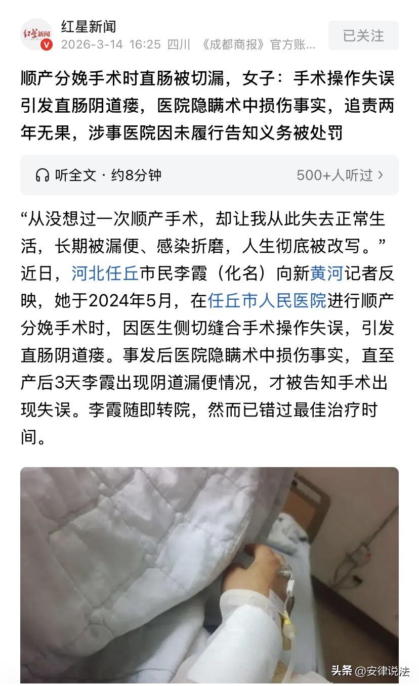 “扎心!”河北任丘,29岁女子在医院顺产生孩期间,医生给其做了个侧切手术,结果因失误切漏了女子的直肠。事后,医生没有采取任何措施,也没有告诉女子。直到3天后,女子出现阴道排出大便的情况,才得知实情,但是由于已经错过最佳治疗时间,前前后后花了十几万元也没看好,如今无法正常工作生活,还需要长期穿成人纸尿裤。更令女子难以释怀的是,事发已经2年有余,虽然涉事医院被卫健委处罚,但是涉事医生没有受到任何处罚!仍在医院正常接诊。女子希望卫健委也追究涉事医生的责任,但被告知一案不能两罚,女子无奈通过媒体发声。 据悉,2024年5月14日,29岁的李霞在一医院分娩。 期间,医生为了顺利分娩给她做了个侧切手术,术后还笑着给她说,母子平安,叮嘱她先吃几天流食,好好休养。 谁料,产后第三天,李霞竟然发现自己的大便从阴道里排了出来! 尴尬、恐慌,那一刻,李霞脑子一片空白,完全懵了,不知道自己得了什么病。 李霞遂医生求助。医生检查一番后,告知李霞为直肠阴道瘘,还说可能是在其做侧切手术进行缝合时,不小心扎漏了直肠。 随后,医院妇产科的主任亲自陪同李霞紧急转移,但因李霞已经重度感染,被拒收。 又经几番折腾李霞转到另一医院治疗,结果又被告知已经错过最佳手术时间,感染太严重,只能先消炎,等炎症退了再考虑手术。 然而,李霞在进行了抗感染治疗期间,发现医院的病例记录里,明确写着手术中“肛查发现有一针可吸收线穿透直肠黏膜”,医生当时拆了线重新缝合,还标注了“探查直肠黏膜完整”,也就说和医院当时所说的缝合时不小心缝漏了,完全是两码事。 又想到医生当时没有任何措施,事后全程也没有告诉自己,李霞难以释怀,便投诉了医院和涉事医生。 虽然,卫健委介入后,认定涉事医院存在未按规定书写患者病历、未告知患者病情、医疗风险等问题,并对涉事医院作出了罚款5万元的处罚。 但是并没有对涉事医生作出任何处罚。 与此同时,李霞进行了长达1年的抗感染治疗后,进行了修复手术,但是可惜失败了。 李霞想到因为涉事医生的失误自己前前后后花了十几万元,如今无法正常工作生活,还需要长期佩戴成人纸尿裤,反观涉事医生没有受到任何处罚,还在医院正常接诊,遂又想医院讨说法,未果后,又找到卫健委,因卫健委答复一案不能两罚,无奈见此事曝光到网上。 那从法律上该如何看待此事呢? 卫健局所说的 “不能一案两罚”,核心依据是行政处罚法中的 “一事不再罚” 原则,该原则的核心是:对违法行为的同一个违法行为,同一个行政机关(或多个有管辖权的行政机关)不能给予两次及以上 “罚款” 类的行政处罚,目的是避免重复处罚、加重当事人负担。 但是应当注意的是,“一事不再罚” 原则针对的是同一主体,具体到本案,涉事医院和涉事医生是“两个独立主体”。 同时,医院的违法行为在于未按规定书写病历、未告知患者病情及医疗风险,而涉事医生的违法行为主要在于手术操作失误导致李霞直肠损伤,且术后隐瞒损伤事实,两者违法行为虽相关,但并非 “同一个违法行为”。 因而在对涉事医院作出处罚后,仍可对涉事医生进行处罚,不受一事不再罚的限制。 依据《执业医师法》第37条及《医疗事故处理条例》等规定,医生存在操作失误并隐瞒,可依法给予‌警告;‌责令暂停6个月以上1年以下执业活动‌;吊销医师执业证书‌等处罚。情节严重‌构成犯罪的,还可以依法追究医生的刑事责任。 具体到本案,李霞不服卫健局对涉事医生的不予处罚的回复,可以依法申请复议或者行政诉讼。 此外,《民法典》第1218条规定,患者在诊疗活动中受到损害,医疗机构或者其医务人员有过错的,由医疗机构承担赔偿责任。 除了追究涉事医生的违法责任外,李霞依法还可以要求涉事医院给与相应的赔偿,以弥补自己的损失。 这事您怎么看?欢迎在评论区留言,与大家一起交流您的看法! ------ 关注@安律说法 案例中看人生百态,法律中寻破局之法!