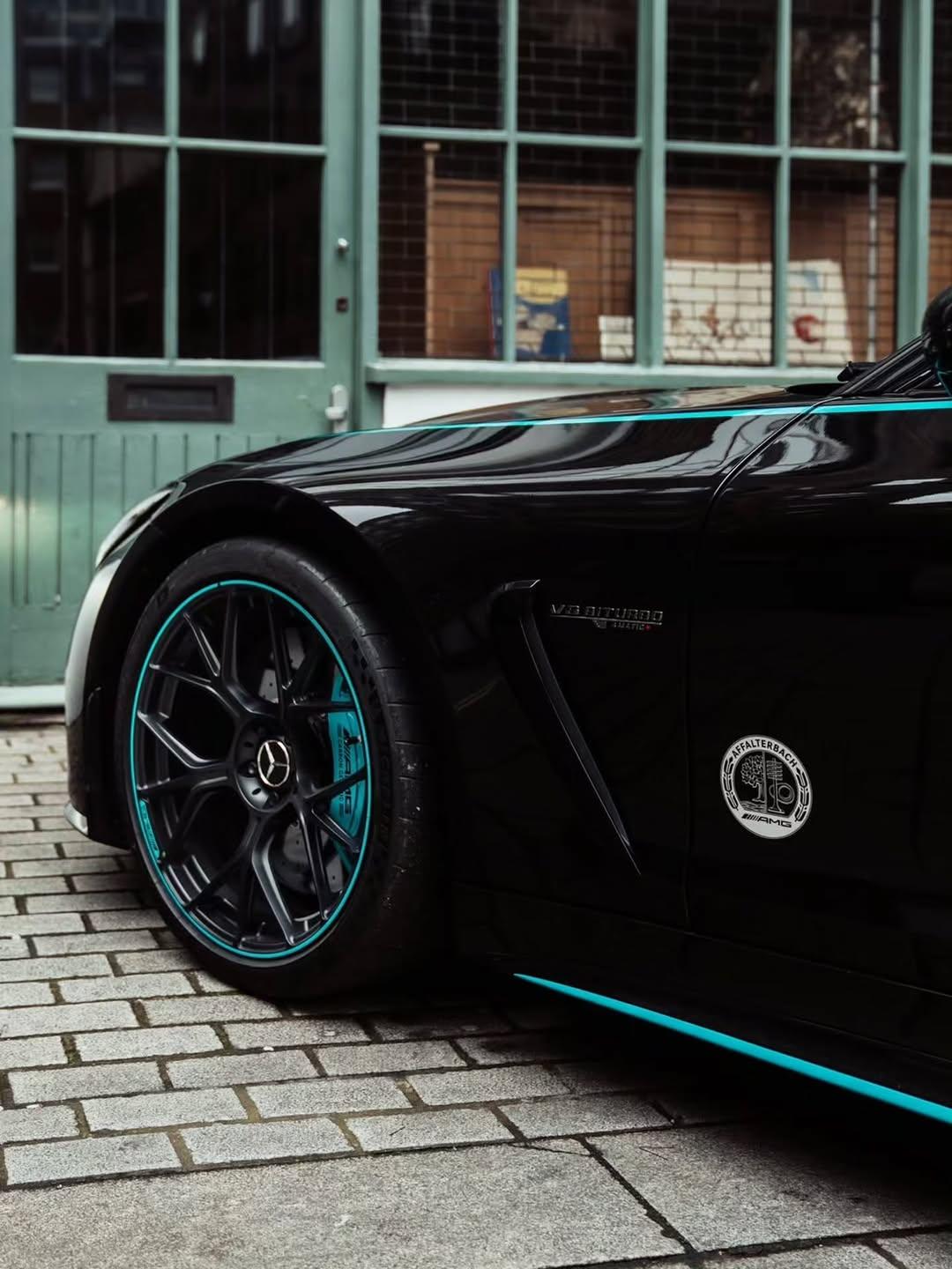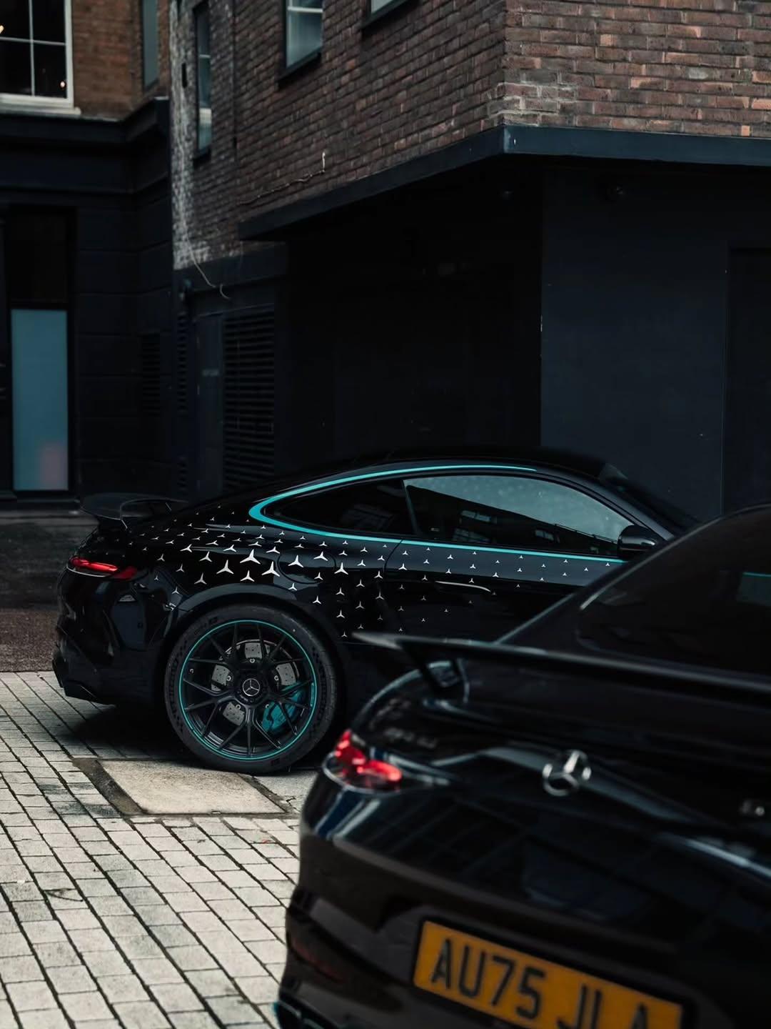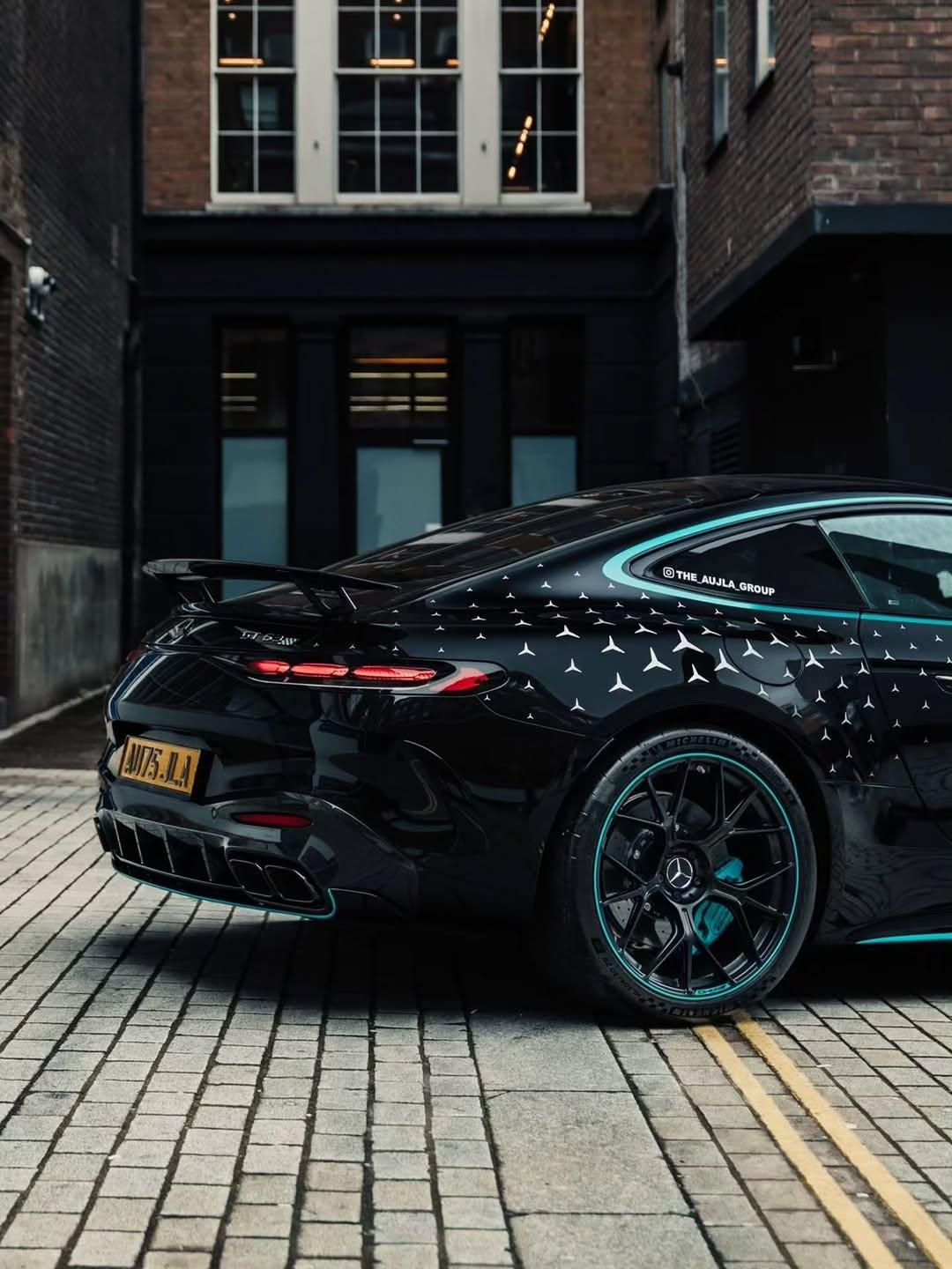 梅赛德斯奔驰超级跑车 AMG GT 63 PRO赛车版 ,限量20辆。 车尾左右叶子板的位置,渐变式的星光涂装,内敛不花哨又显高级,车窗边缘,底边和轮毂以孔雀蓝色做线条点缀。 双门版车型,整体造型呈现运动风格又有优雅气质。前车门AMG徽标尺寸非常大,很突出。
