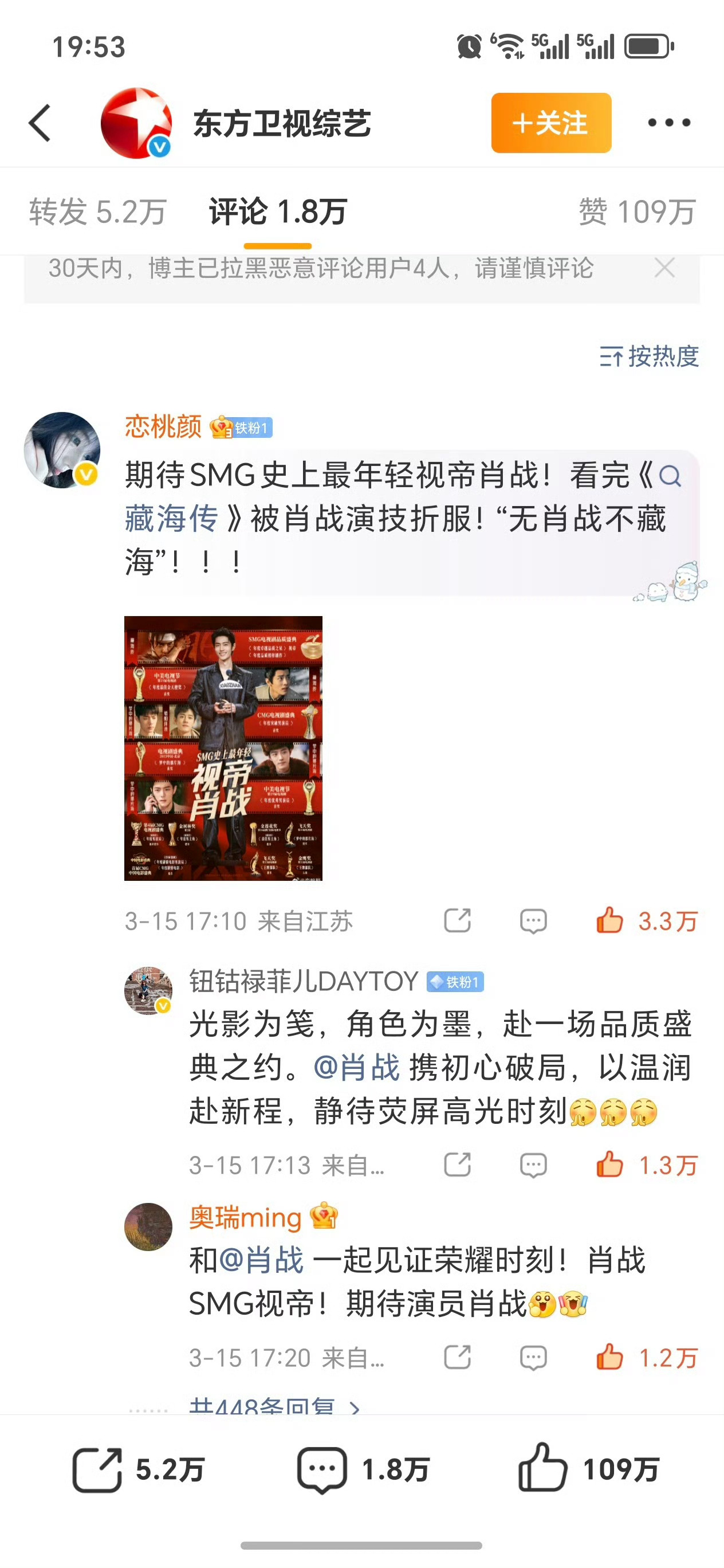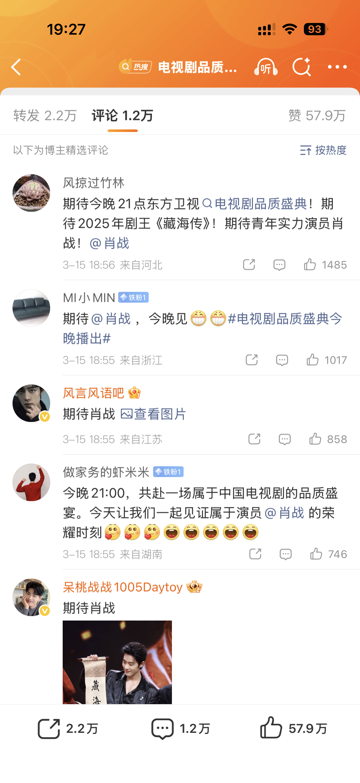 就说肖战得视帝影帝是民心所向众望所归,220万赞,110万,60万赞,50万赞 电视剧品质盛典 藏海传剧组合影