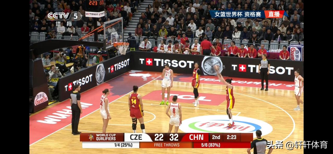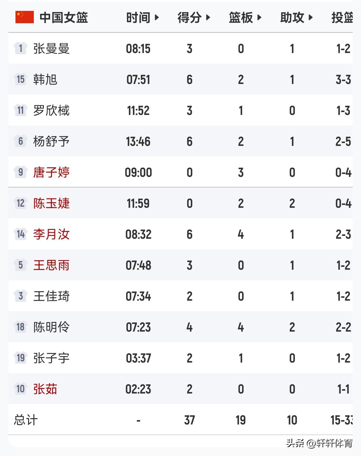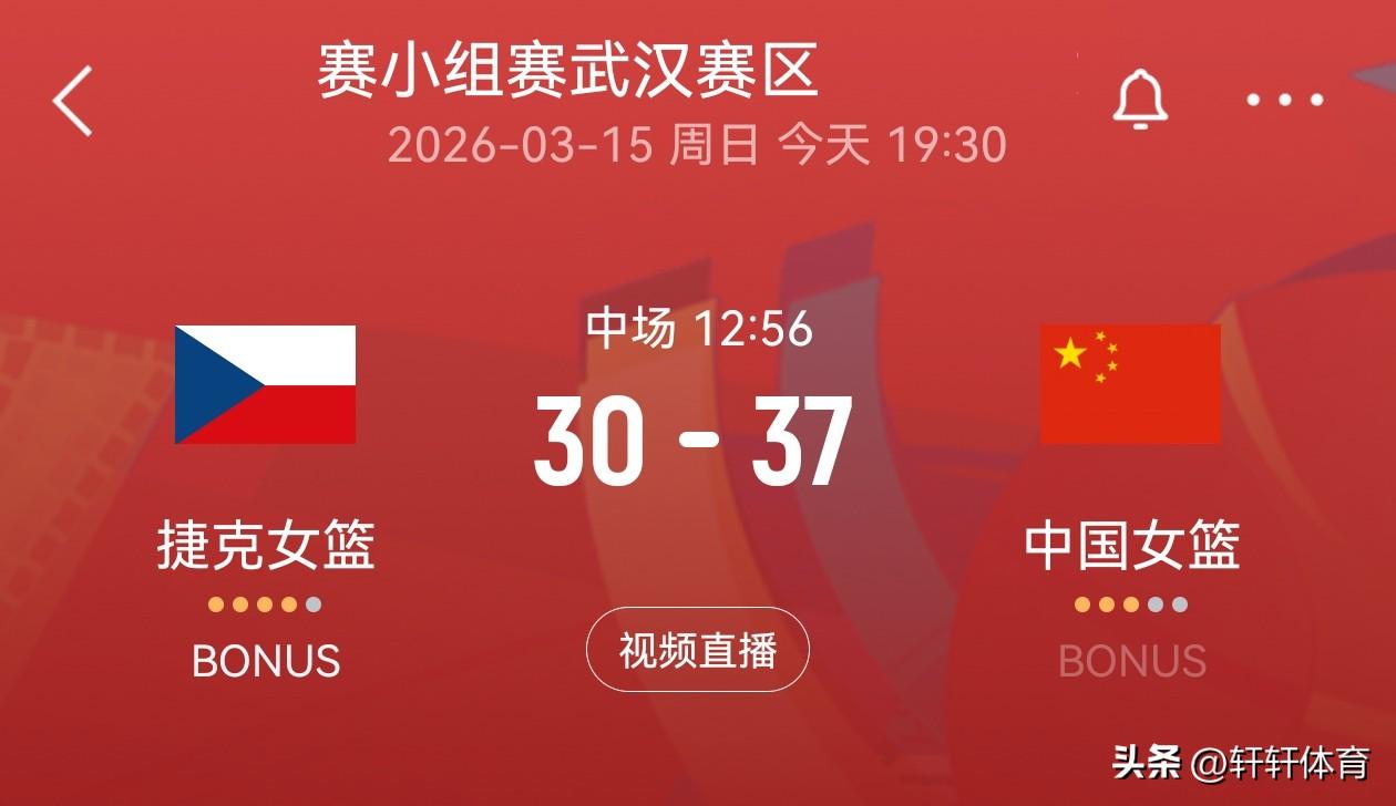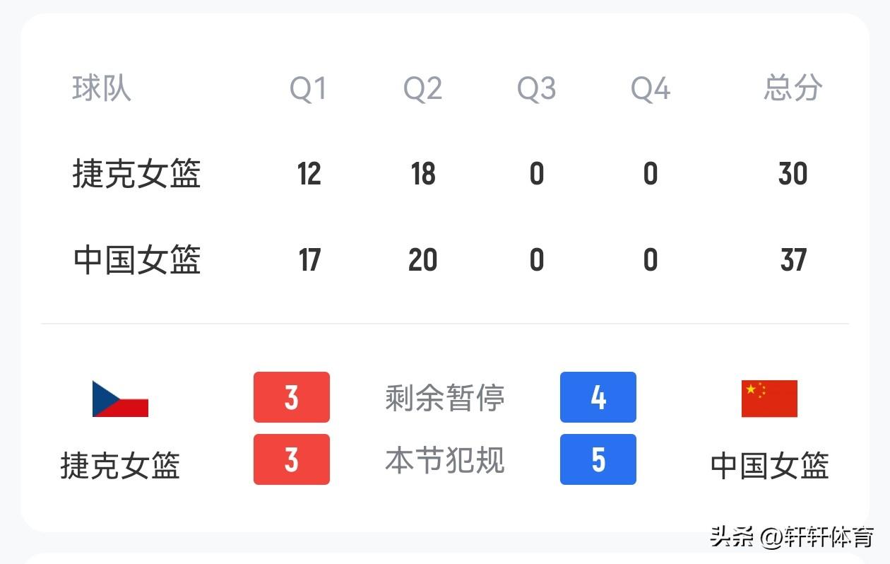 中国女篮世预赛第4轮比赛正在武汉进行,目前上半场比赛已经结束了,中国女篮以37-30领先捷克女篮,在已经结束的3轮比赛中,捷克女篮以2胜1负排名第二,中国女篮同样取得了2胜1负的成绩,但是由于中国女篮净胜分低于捷克女篮故排名第三,本场比赛的胜者将大概率锁定世界杯正赛资格,今天上半场比赛中国女篮一改之前比赛开局慢热的情况,今天开场中国女篮手感火热,上半场比赛中国女篮12人轮换10人有得分,韩旭、杨舒予、李月汝各得6分,陈明伶4分4篮板,张曼曼、罗欣棫、王思雨各得3分,张茹、张子宇、王佳琦各得2分。