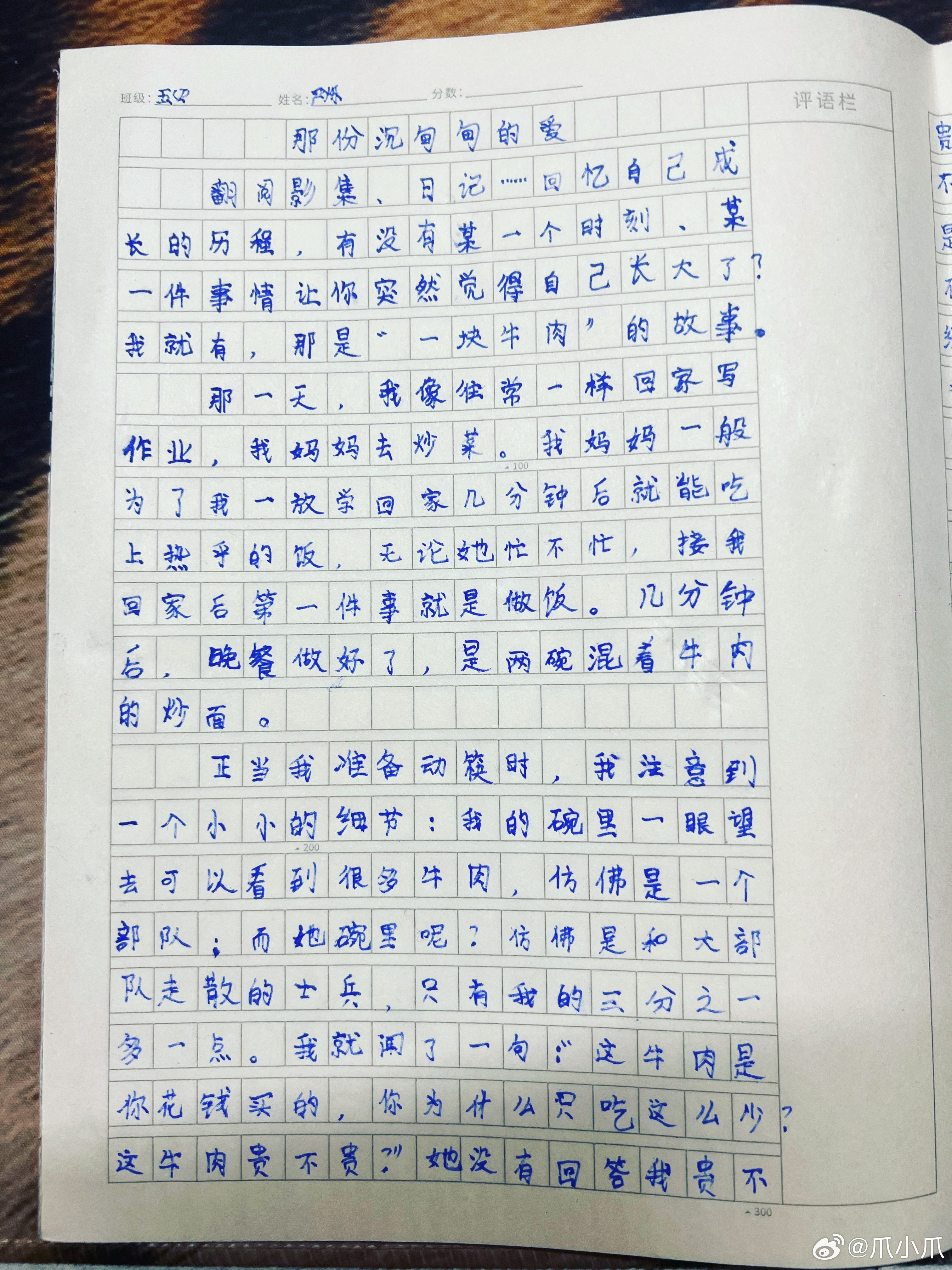 正在检查Steven作业,周末作文一则《那份沉甸甸的爱》看得我挺感动的,眼泪都快