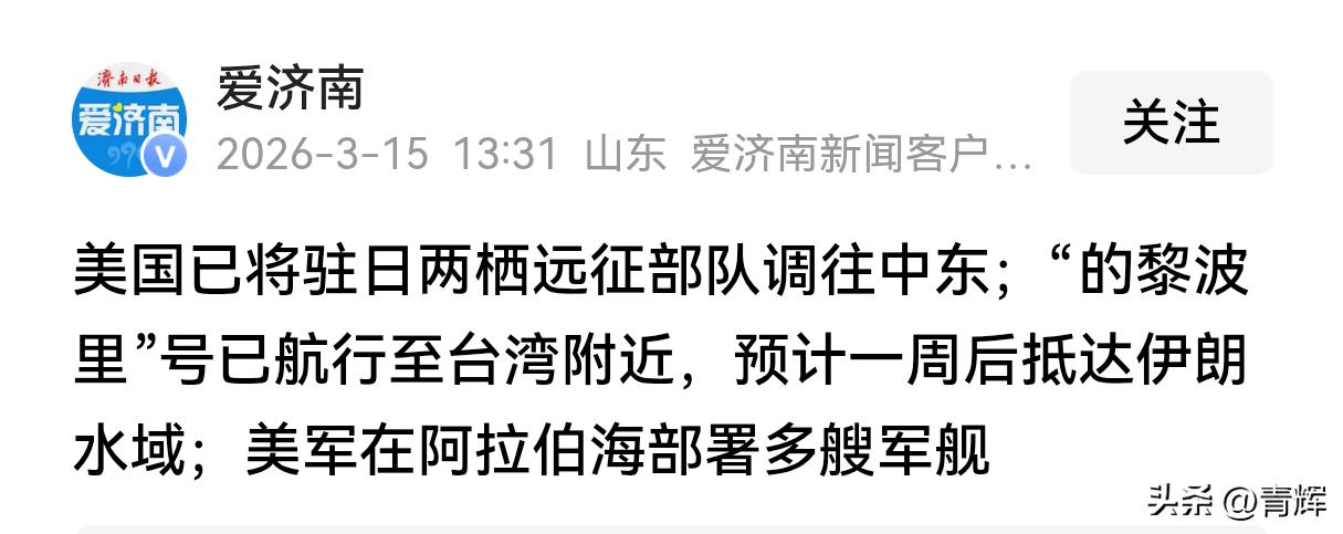 这次轮到日本慌了,继韩国后,驻日美军也被调往中东 截止到3月9号,已经可以确定驻韩美军向中东方向出现了大规模的调动,这其中包括把韩国境内的萨德发射车全部拉走这一重大举措。然而从目前发生的一些情况来看,美国的调动并不仅仅只是局限于韩国,连驻日美军也出现了调动迹象。 3月14号日本共同社声称,美国的两栖攻击舰的黎波里号和驻扎在冲绳县的海军陆战队已经被派到中东方向执行军事任务。这是此轮中东战争爆发以来,首次出现驻日美军的调动。 要知道韩国和日本这两个国家是美国在中国周边部署的最重要的据点,在特朗普之前的美国总统中,极少会出现大规模调动这两个国家美军力量的先例。因为从大国博弈的角度上来看,如果驻日和驻韩美军出现大的波动的话,将有可能导致美国整体战略失衡,所以这是非常敏感的一个区域。 而现在特朗普为了把内塔尼亚胡救出来,几乎正在以不惜代价的态势与伊朗开战,从这一趋势上来看,接下来驻日和驻韩美军可能还有更大规模的调动。 萨德系统调走之后,朝鲜马上在13号当天下午连续发射了十几枚弹道导弹,韩国全国上下人心惶惶。现在好了,又轮到日本人紧张了。