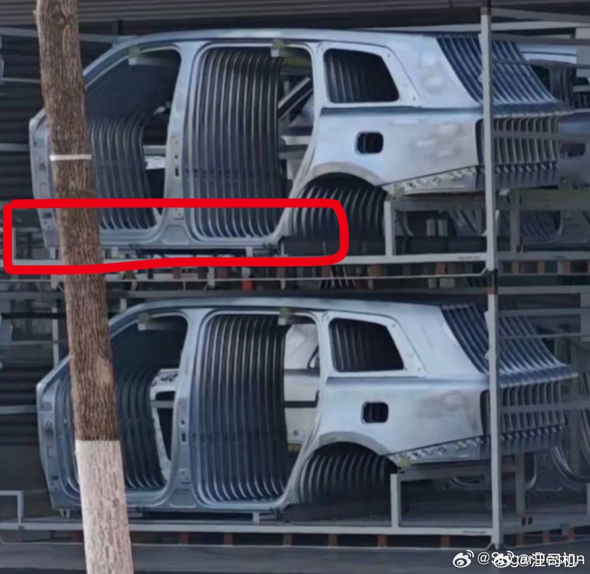 侧围外板下沿(红圈)目测没有一排钉孔,说明这车可能是冲压拼焊的门槛梁。