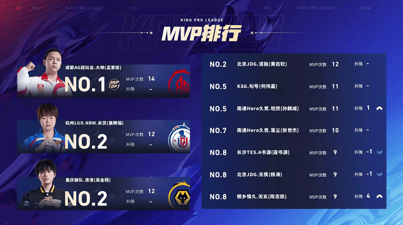 KSG句号(何伟嘉)、@南通Hero久竞_坦然(孙麟威)累计获得11次MVP,并列第五;