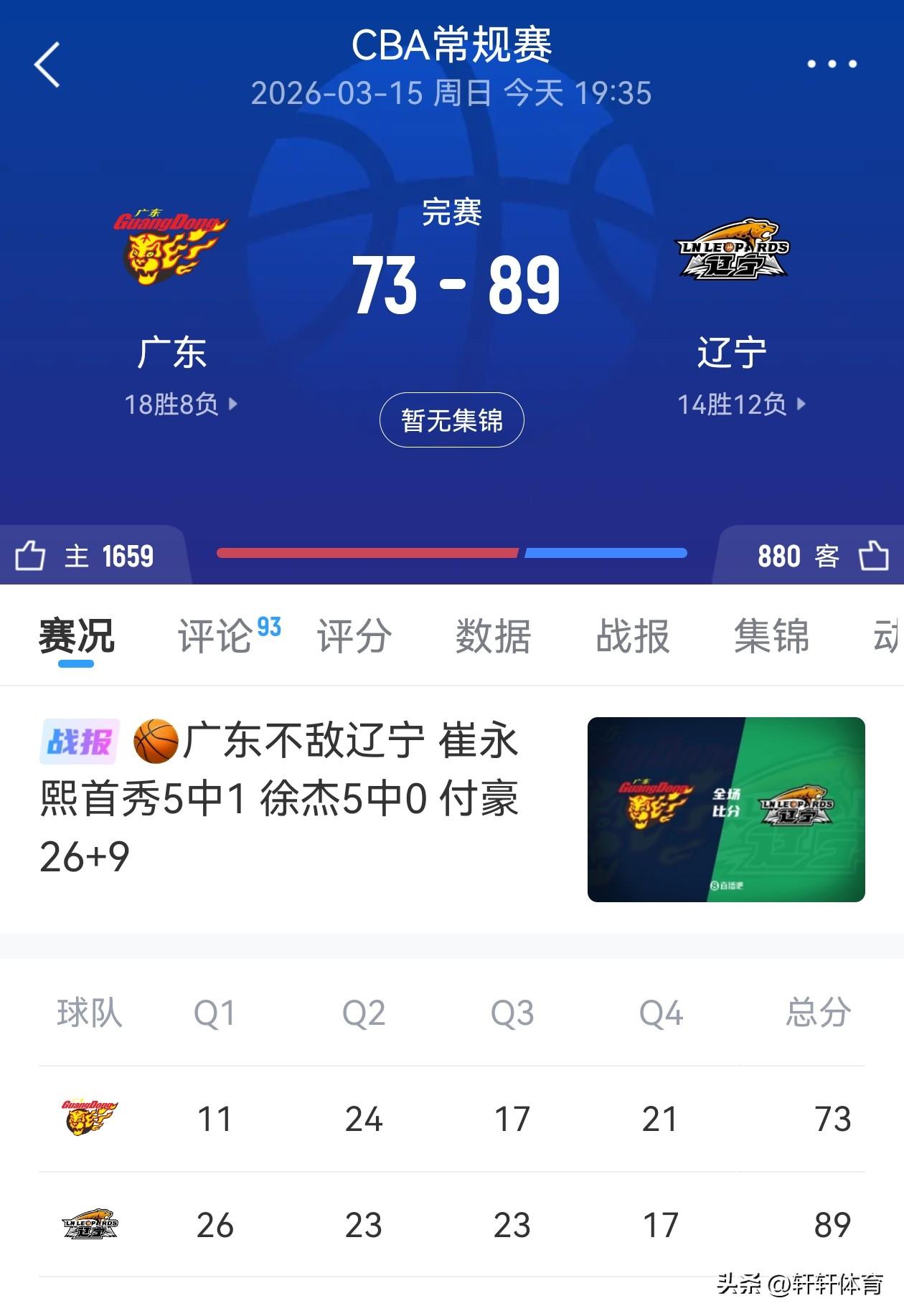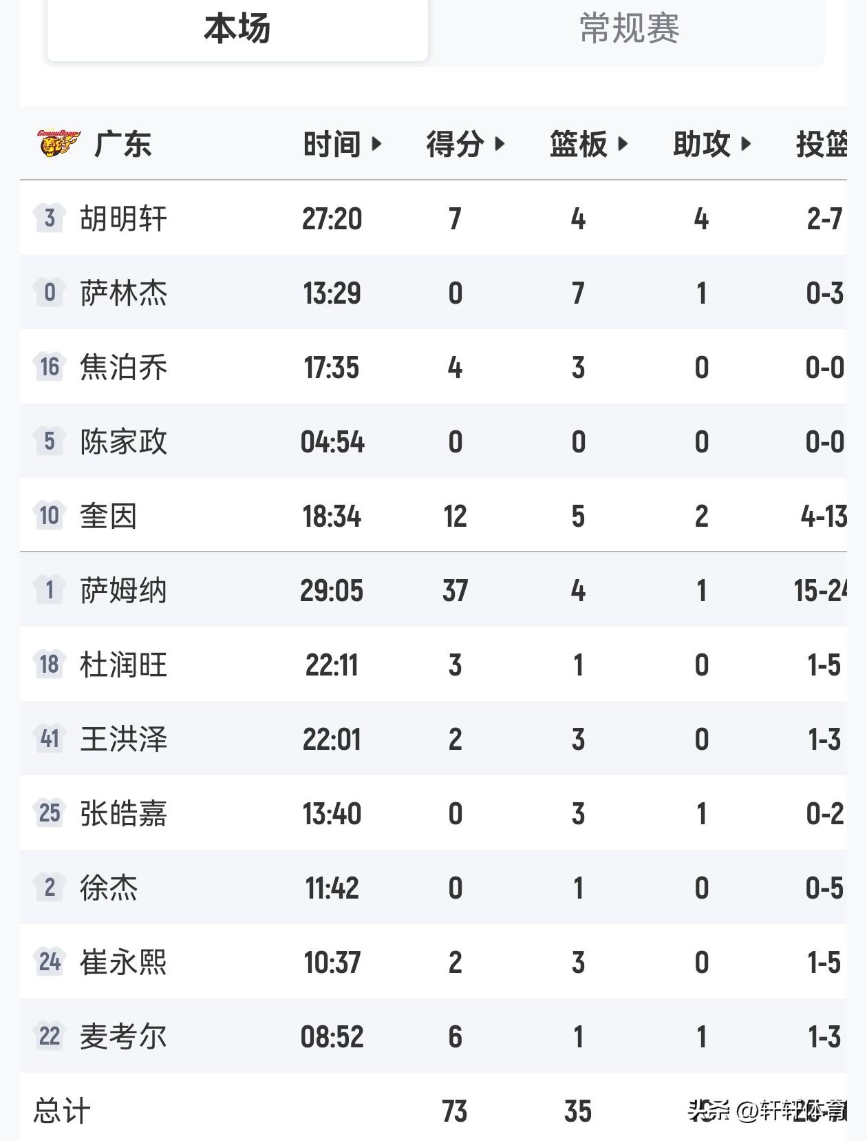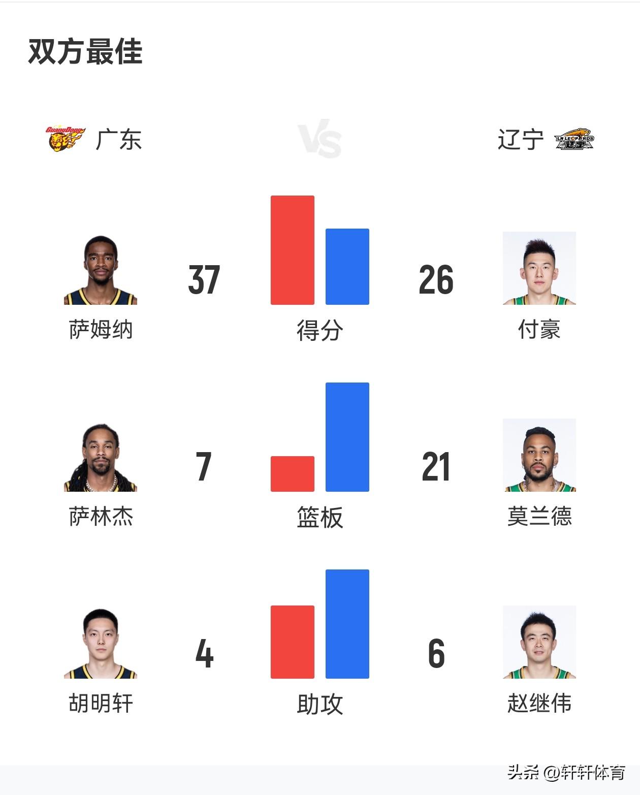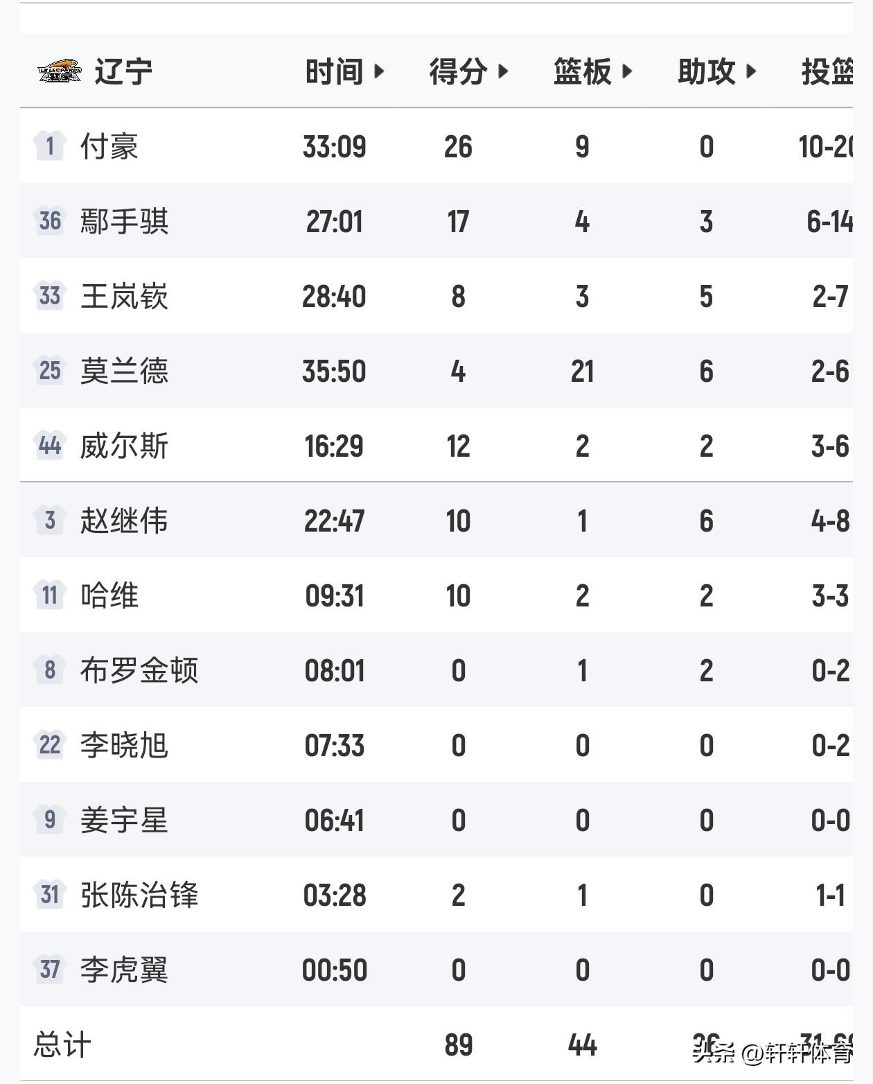 恭喜辽宁男篮以一场89-73大胜广东男篮的宣告王者归来,同时辽宁男篮凭借本场比赛胜利,喜迎五连胜,本场比赛辽宁男篮开场鄢手骐连续命中三分球,帮助辽宁男篮以12-3开局,虽然本场比赛广东男篮崔永熙复出登场,但是由于长时间没有参加正式比赛崔永熙完全不在比赛状态,付豪连中3球帮助辽宁男篮继续扩大比分,首节末端赵继伟连续命中以及组织串联,带队将比分扩大,广东男篮外援麦考尔连投带罚,帮助广东男篮连续追分,比赛第二节广东男篮依靠萨姆纳的出色发挥持续追分,但是辽宁男篮依然稳扎稳打持续领先比分,半场比赛结束辽宁男篮以49-53领先广东男篮,下半场易边在战广东男篮凭借外援萨姆纳的持续高效发挥,一度将双方分差弱小到个位数,但是广东男篮此后突然进攻哑火,辽宁男篮外线持续开火,一举将领先优势扩大到了20分,比赛最后一节辽宁男篮稳扎稳打牢牢掌握住场上局势,最终经过全场激烈的比拼多多辽宁男篮以89-73客场战胜广东男篮,成功复仇双方本赛季主场不敌广东男篮的一箭之仇。 本场比赛辽宁男篮12人轮转8人得分,其中5人得分上双,付豪拿下全队最高的26分9篮板的准两双,鄢手骐17分4篮板3助攻的高光数据,威尔斯12分2篮板2助攻,赵继伟,哈维各得10分,赵继伟同时还有6次助攻的数据,本场比赛莫兰德高效贡献了4分21个篮板6助攻的数据,张陈治锋2分1篮板,可以说今天辽宁男篮能够取胜最重要的节点就是莫兰德的21个篮板,以及内线对阵广东男篮的绝对压制,再有付豪的出色发挥也非常重要,同时鄢手骐不讲理的三分球一度投到让人怀疑人生,广东男篮萨姆纳得到了全场最高的37分,奎因12分,广东男篮国内球员对球队帮助真的太有限了,国内球员一共得到了18分。