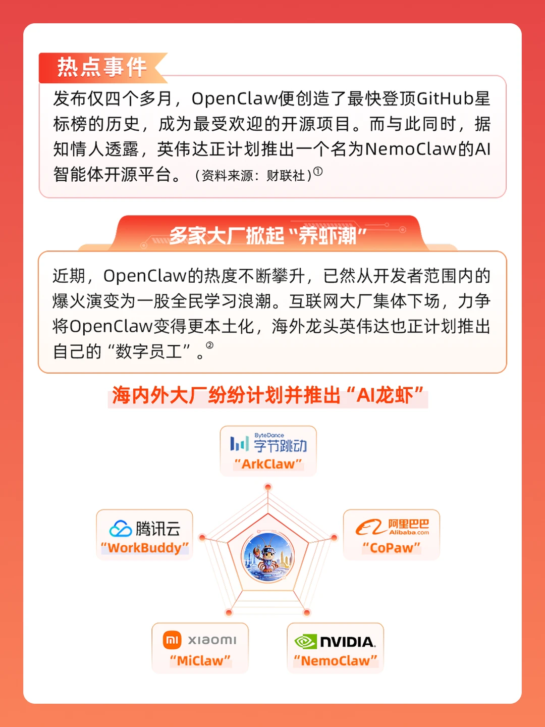🔥英伟达出手,大厂AI新革命! 🌟发布仅四个多月,OpenClaw便创造了最快登顶GitHub星标榜的历史,成为最受欢迎的开源项目。而与此同时,据知情人透露,英伟达正计划推出一个名为NemoClaw的AI智能体开源平台。 🌟近期,OpenClaw的热度不断攀升,已然从开发者范围内的爆火演变为一股全民学习浪潮。互联网大厂集体下场,力争将OpenClaw变得更本土化,海外龙头英伟达也正计划推出自己的“数字员工”。 硬核搭子邀你做ETF投资行家 理财搭子多多金 华兴证券多多金 龙虾 OpenClaw openclaw 养龙虾 AI 科技 token  ß