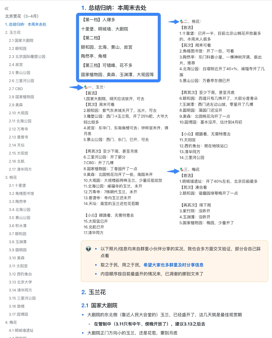 感谢十几个赏花实况群,姐妹们分享的来看: 开得最旺,人最多的 还是十里堡(桃花)、明城墙(梅花)、国家大剧院(玉兰) 这几个地方人很多 论好看,及适合拍人 十里堡是最推荐的 其次,北海,景山,颐和园也都不错 下周会更美 陶然亭有一颗神树开了,但不适合拍人,太高了 玉渊潭不推荐去,还没咋开 圆明园的也没开,不推荐去 国家植物园,奥森,也一般,至少下周 论天气,今天大阴天,肯定不出片 明天出门更适合 下周就盛花期了,但人估计比这周要翻倍 具体见图5汇总吧,其他是刚截图大家分享的实况