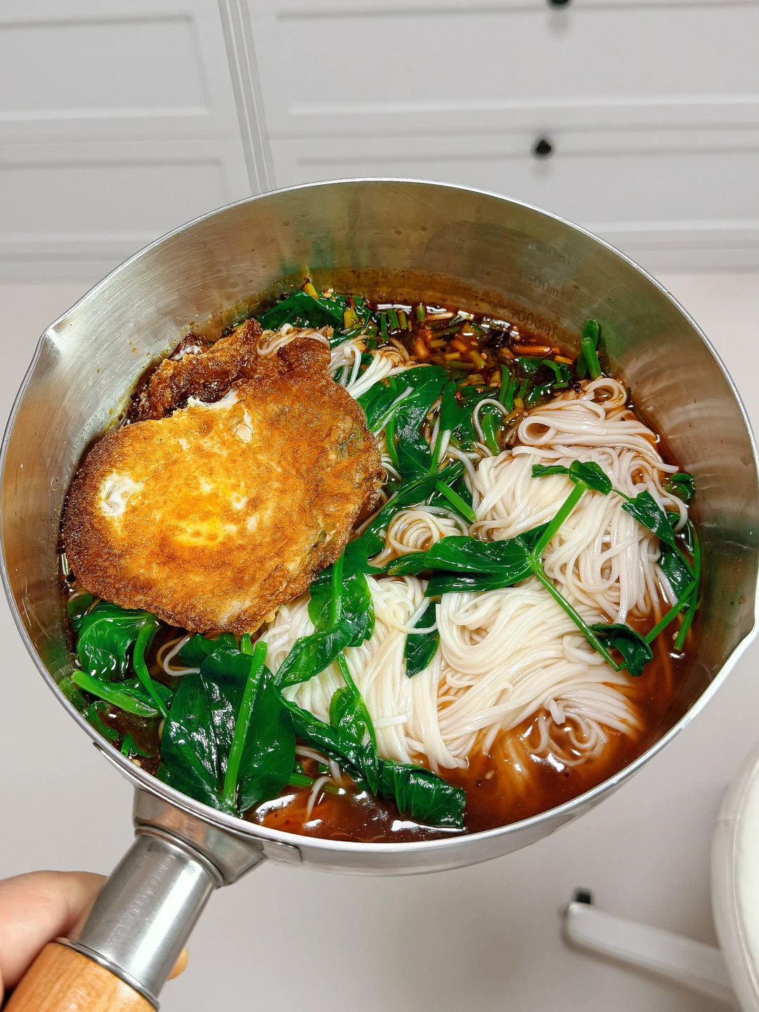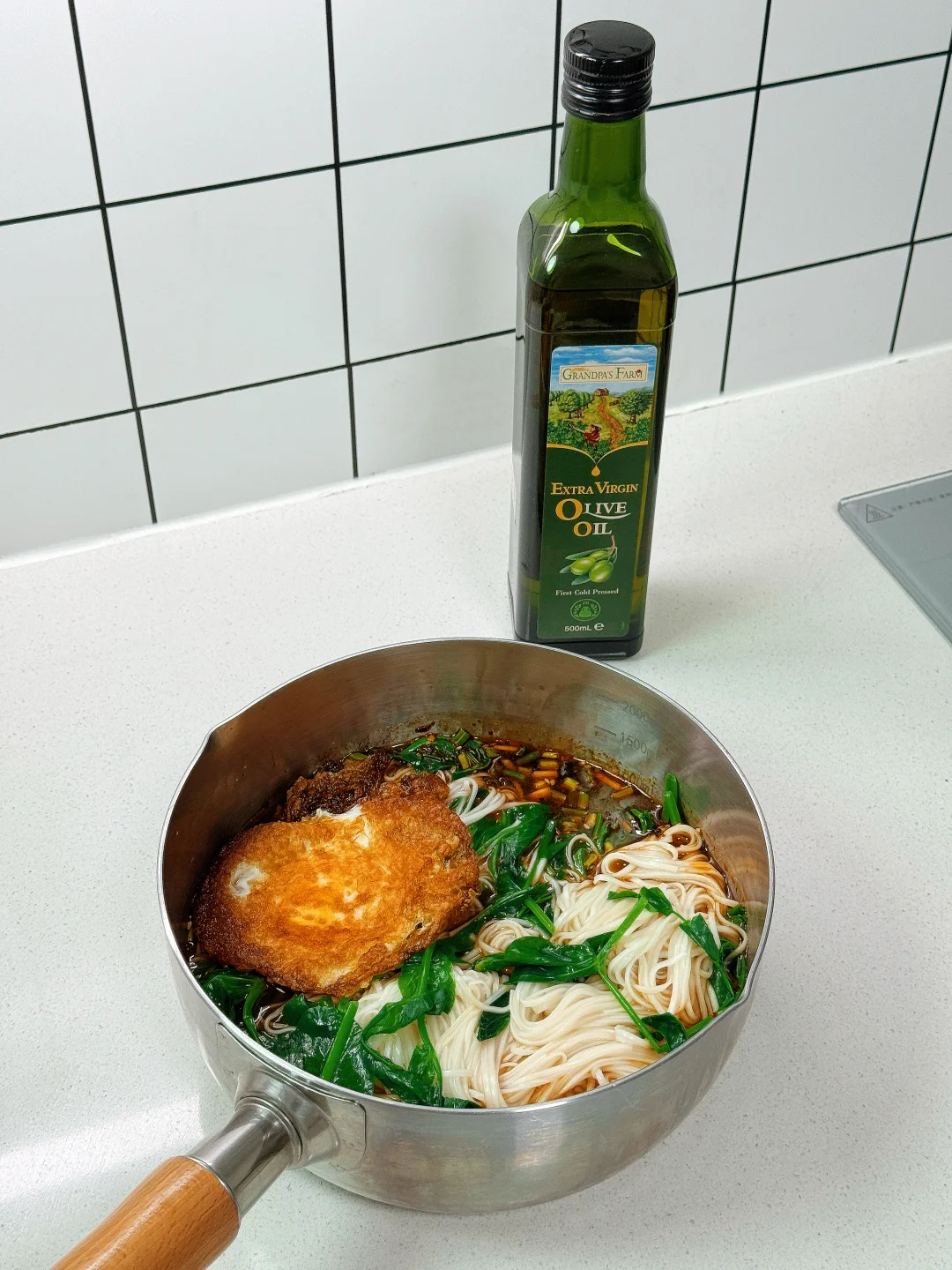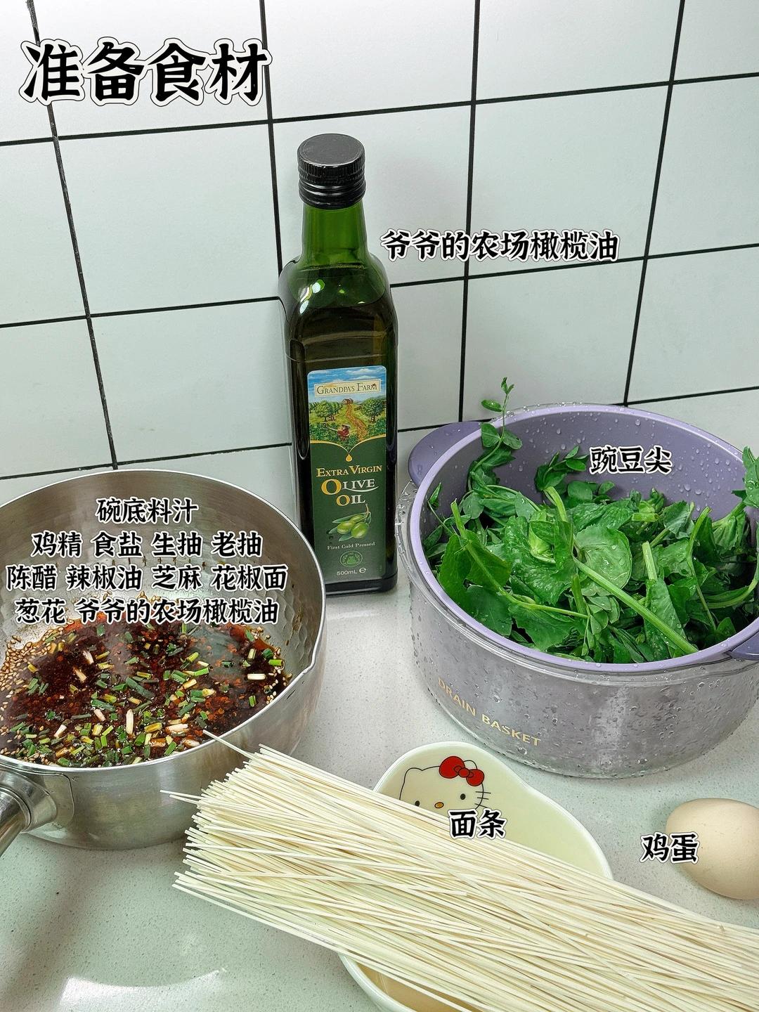 🥣碗底料汁:鸡精、食盐、生抽、老抽、陈醋、芝麻、葱花、辣椒油、花椒面、爷爷的农场橄榄油 🍳做法: 1.锅中放少许爷爷的农场橄榄油 2.油热后把鸡蛋煎熟盛出备用 3.水开后煮面条 4.给料汁里加入适量面汤水 5.放入豌豆尖烫熟 6.全部捞至碗中即可 💡爷爷的农场特级初榨橄榄油,热量比较低,油烟少,煎炒炸煮拌都可以。而且他家这个伸缩油嘴非常好控油,倒出来的油脂颜色金黄透亮,橄榄果香明显,口感清淡,一点都不油腻~