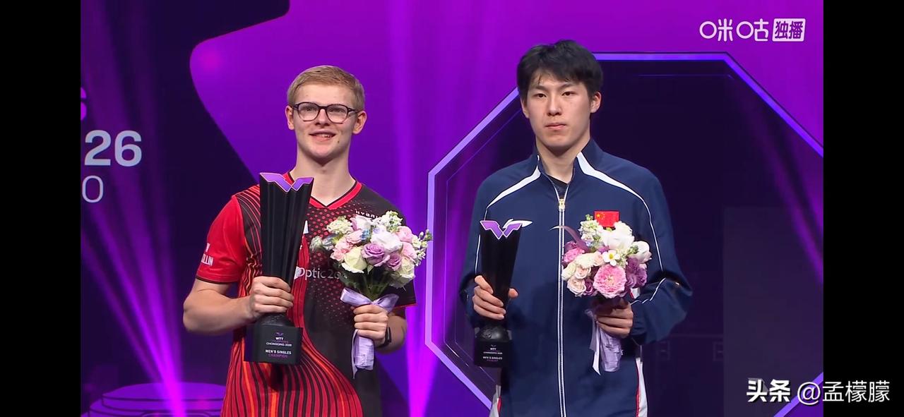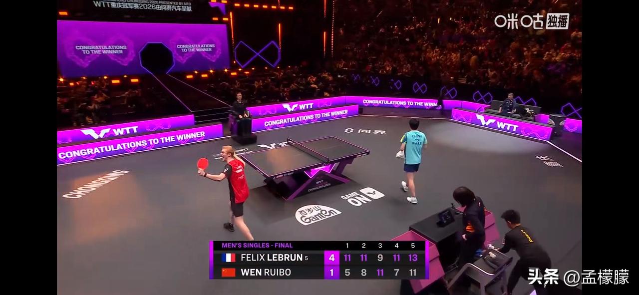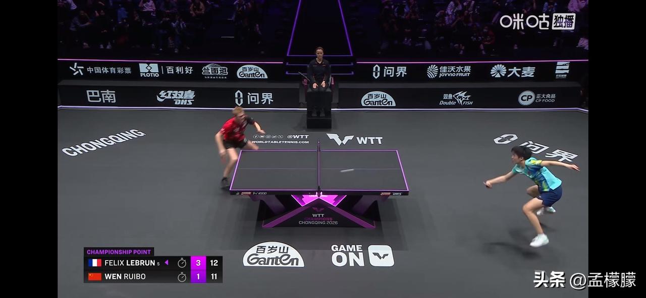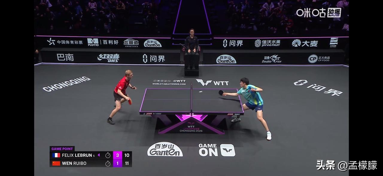 法国小勒布伦4-1战胜国乒小将温瑞博,夺得冠军 男单决赛: 费利克斯·勒布伦(FRA)4-1温瑞博(CHN)【11-5,11-8,9-11,11-7,13-11】 费利克斯·勒布伦夺得冠军,温瑞博获得亚军。 乒乓球乒乓重庆冠军赛 重庆乒乓冠军赛