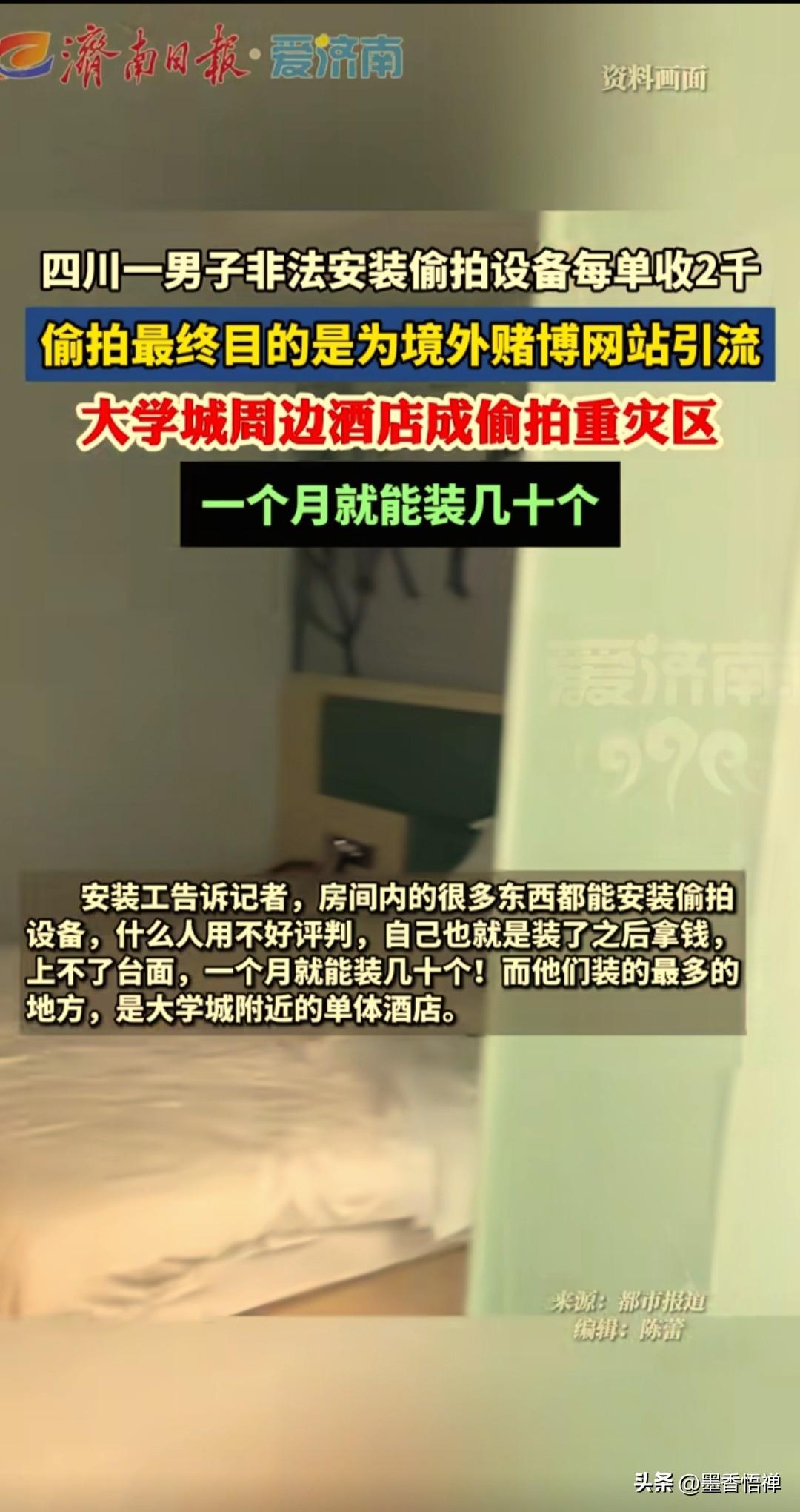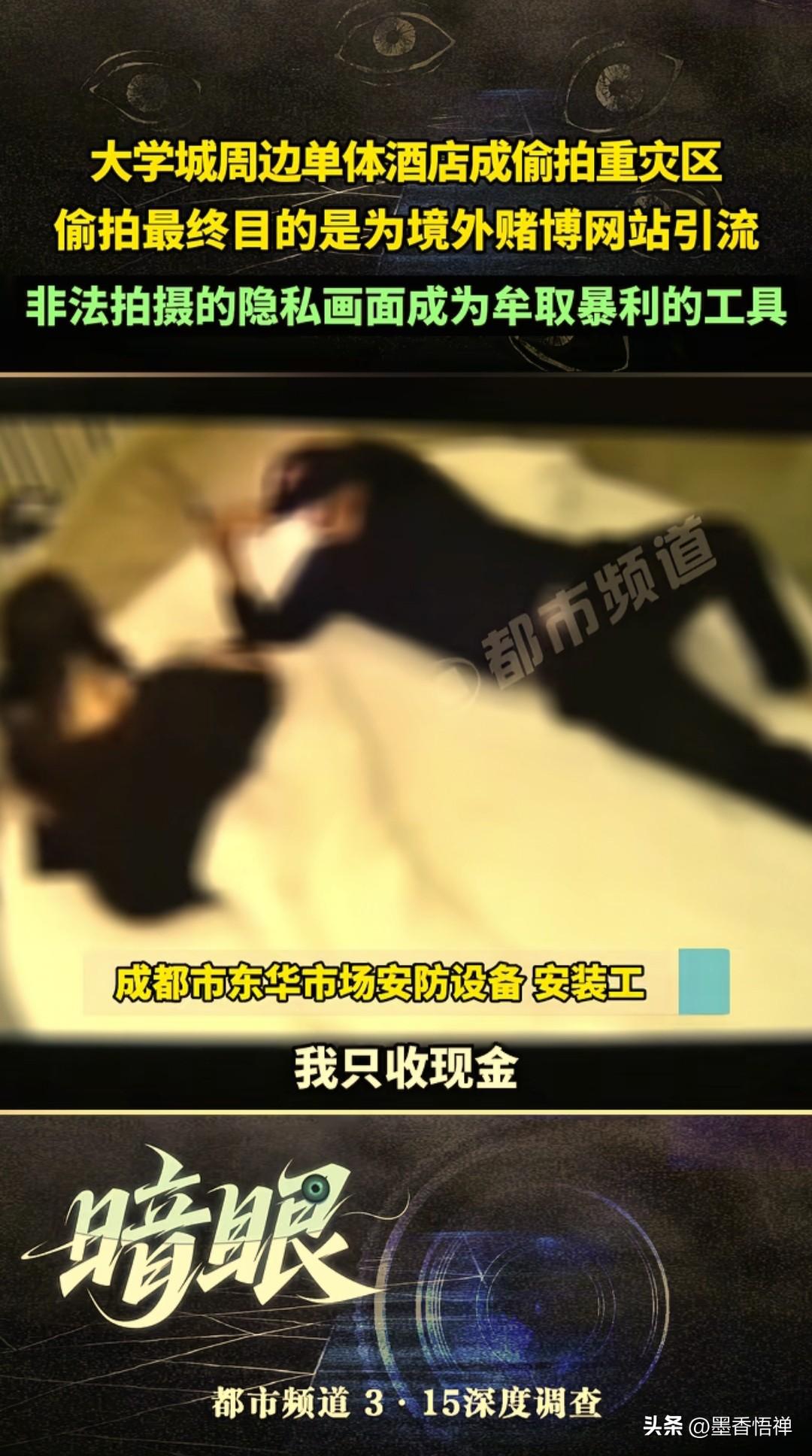大学城周边单体酒店竟然成偷拍重灾区,安装工透露:每月装几十个,只为给赌博网站引流 记者暗访时爆出了一条令人毛骨悚然的偷拍黑色产业链,四川成都东华市场一个安防设备安装工透露,大学城附近安装的最多,城里面还少点,现在这个就是一条产业链,主要是宣传赌博网站用的。 你敢信吗?现在的偷拍,已经不是简单的偷窥了,而是一条明目张胆的赚钱工具。 据这个安装工说,他们专门在酒店房间里安装针孔摄像头,400块钱一间。至于谁装的、给谁装的,他不管,只管拿钱办事,他透露,一个月就能装几十个。 这些偷拍的视频最终目的是为境外赌博网站引流,将偷拍的隐私画面,变成了境外赌场招揽客户的工具。 目前看来,这种偷拍手段真是防不胜防,房间里的烟感器、插座、挂钩,甚至是电视机,都可能变成“监控眼”。 这事儿确实给咱们所有人提了个醒,出门住酒店,还是得多留个心眼,尽量检查一下房间。 你住酒店有过检查摄像头的经历吗,遇到这种事儿,该怎么办? 评论区咱们一起聊聊 来源:都市报道 酒店偷拍探测器