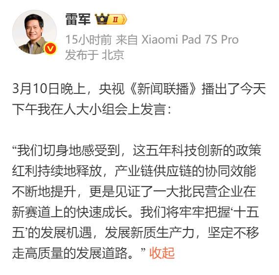 这几年,雷军也确实抓住了科技发展的红利,不管是小米SU7,小米YU7,还是小米的手机,小米笔记本,小米电视,在全国各地都有很强的影响,作为世界500强之一,小米未来的发展也会越来越好。