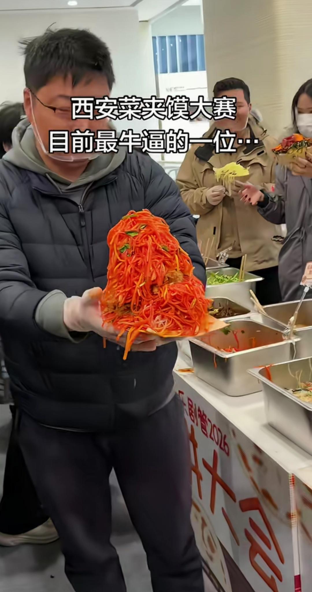 独属于陕西人的快乐,以前在西安上大学的时候,早餐一个菜夹馍,或者肉夹馍就可以了!最近西安举行了第一届菜夹馍比赛,五元的报名费,吸引很多人报名去参加,可惜在外地,不然也报名去热闹一下! 一个膜夹了三斤多的胡萝卜菜,真是大开眼界,不过比赛要求加多少必须吃完才能完成比赛,这点很好,避免浪费粮食!在陕西,一个膜可以加任何吃的,一句玩笑话,只要你不加老板的三轮车,夹多少都行!去陕西旅游的人可以尝一下!