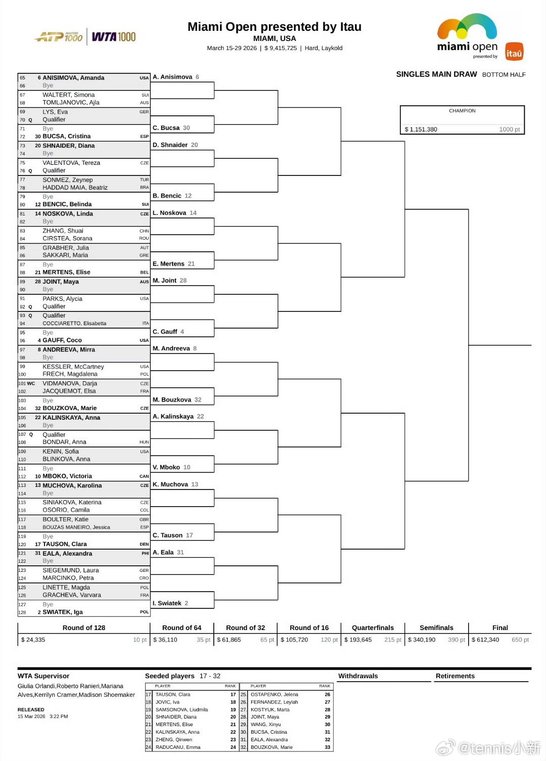 现在的科斯蒂亚一点都不好打……回春明显WTA1000迈阿密站签表