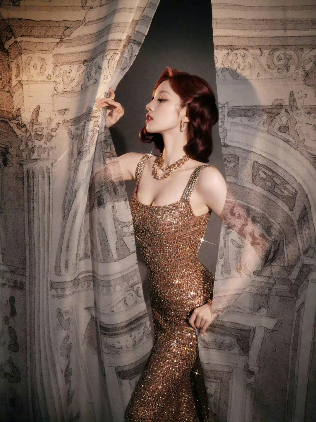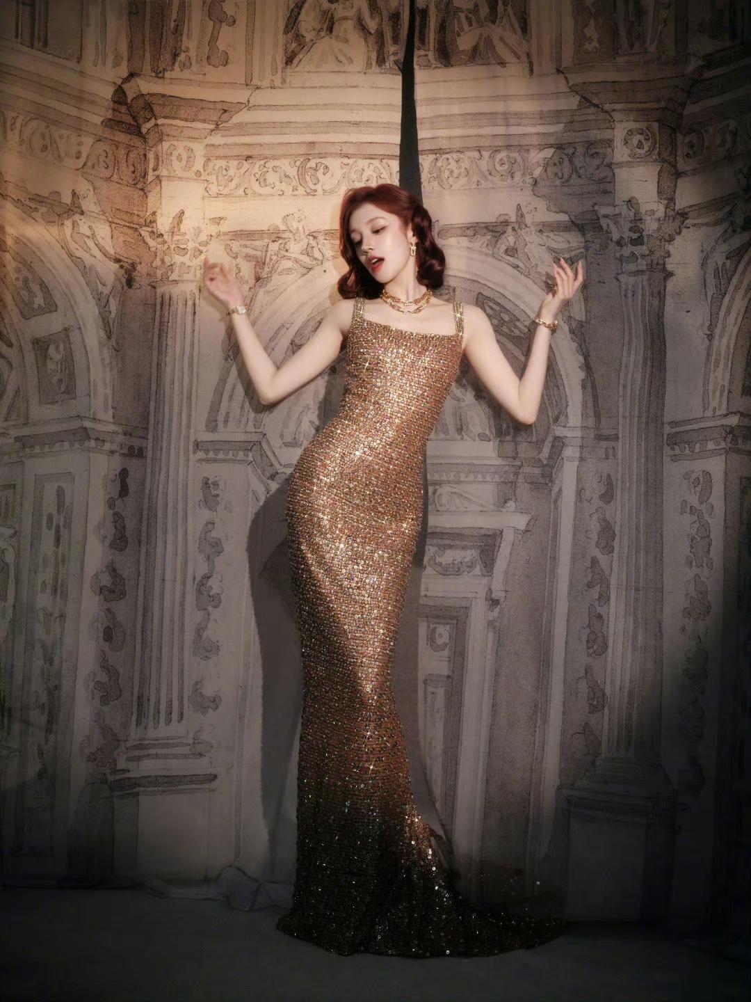 我的今日状态:😁轻松愉快 我这里的天气:🍂微风 当暖调红发遇上复古波浪卷,宋雨琦瞬间化身鎏金晚宴里的耀眼主角。满钻修身长裙勾勒曼妙曲线,Tiffany珠宝点缀细节,华丽复古的气质扑面而来。 只可惜现场换了发型,没能让这份复古之美延续到最后,多少有点意难平。